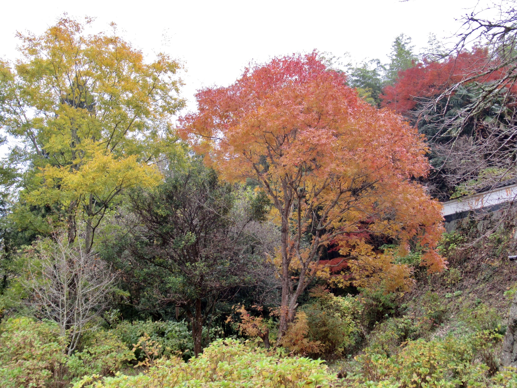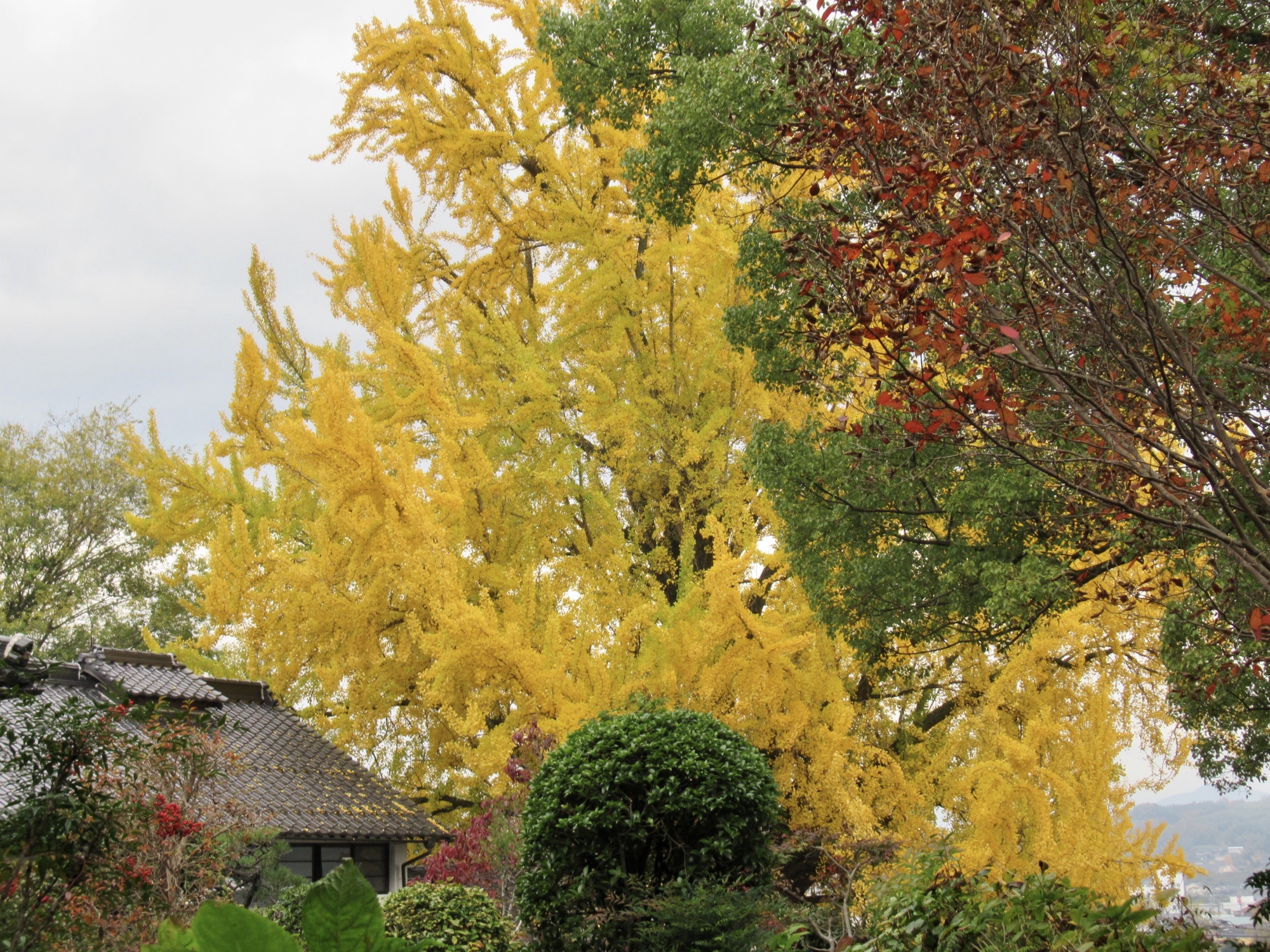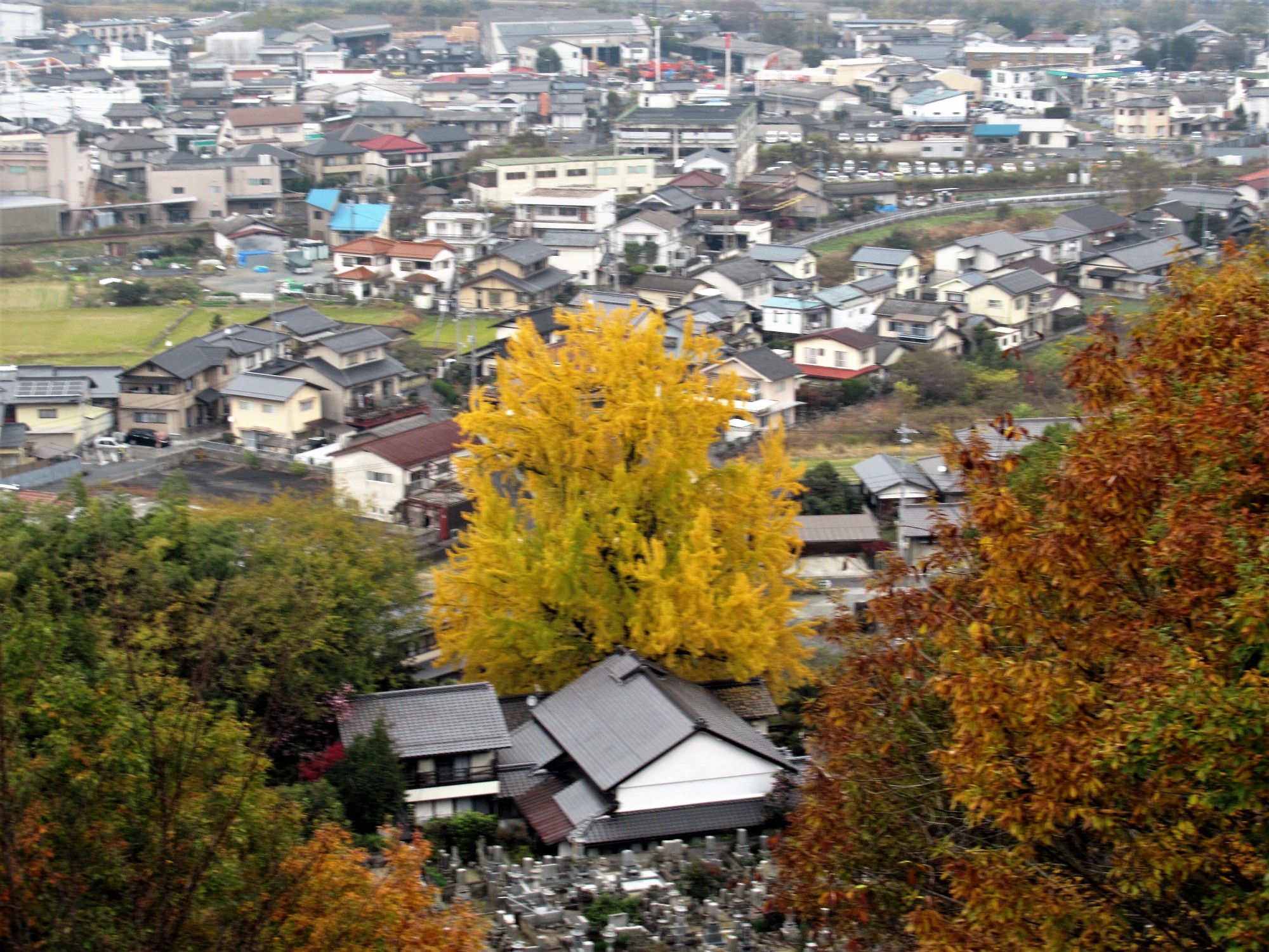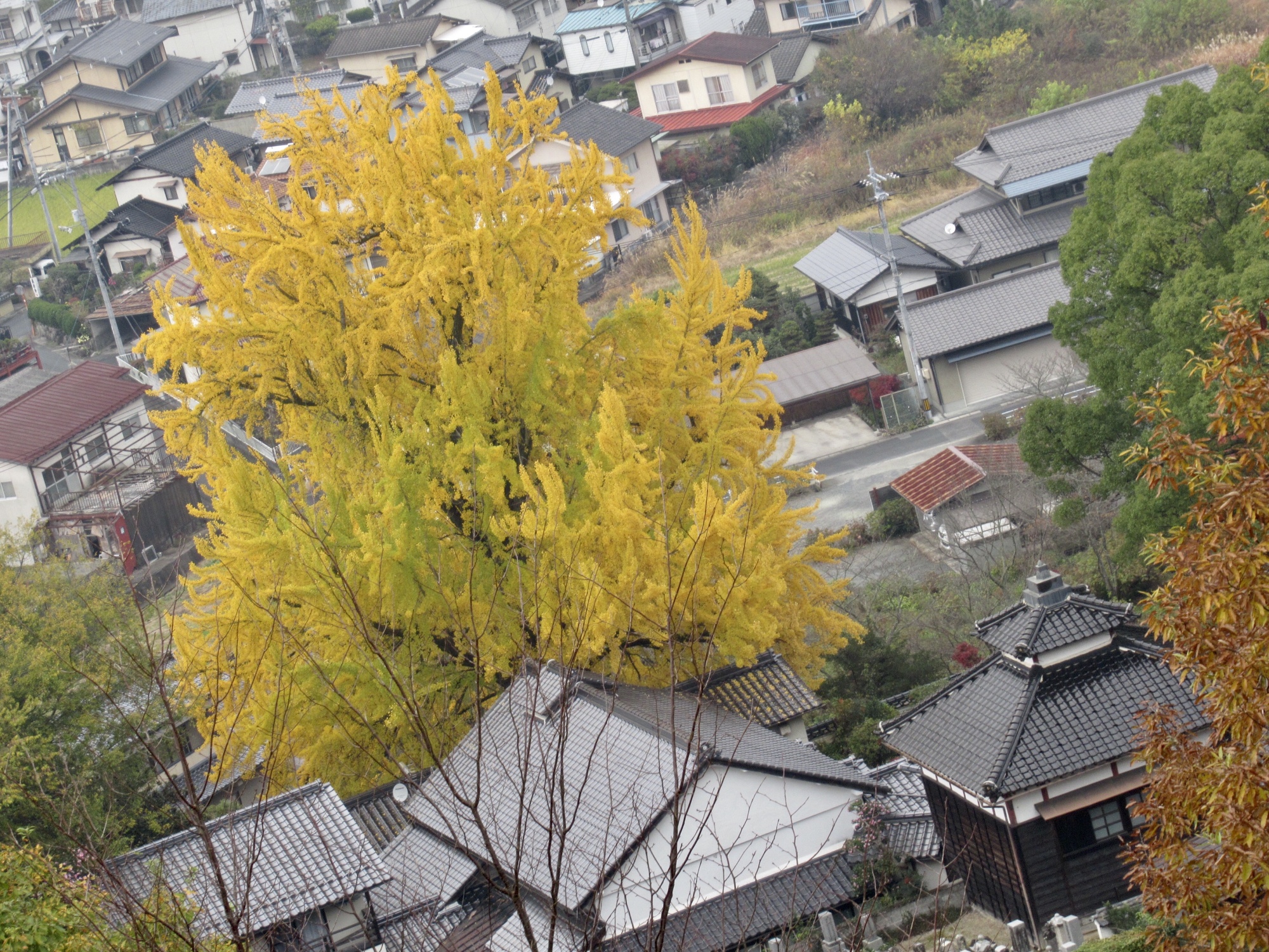 さて、ちょっと早めに出発して、大学から~ナビ任せにしていたら、すごく細い峠を通って(御津と建部の間の浜坂峠)・・で、建部からはR53を北上・・・山が錦繡~で、津山に入る処で、中腹に塔とその下に銀杏!