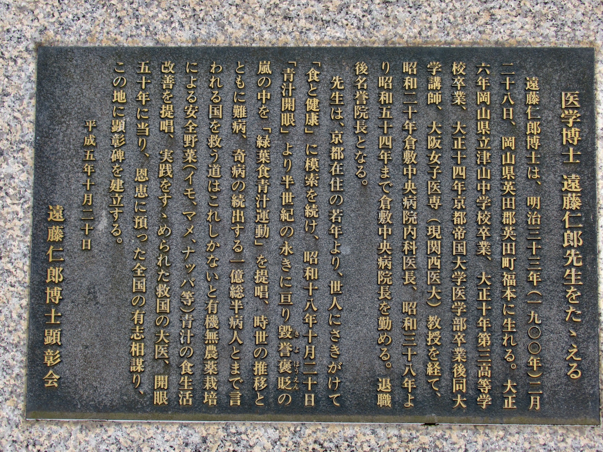 【1900年(明治33年)岡山県の生まれ。1925年(大正14年)京都帝大(現京都大学)医学部卒。その後、京大講師を経て大阪女子医専(現関西医科大学)教授に就任。1943年(昭和18年)より「青汁」を創始。青汁は博士のヒナ子夫人が命名。1945年(昭和20年)倉敷中央病院に赴任、病院給食に青汁を採用。その後同病院の院長に就任。】