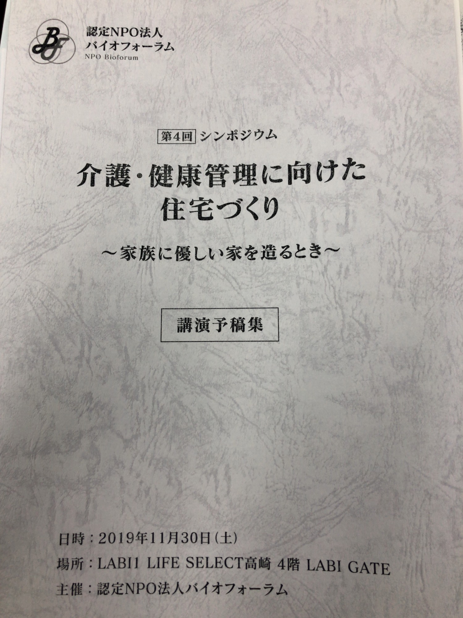 共同研究を継続しているYAMADA Homesさんがも後援していて、群馬大学医学部、そして前橋工科大学が中心となったNPOで、建築とか住環境と健康とか介護を検討する会の様です。で、旧知の土橋先生がNPOの副理事長でもあり、また、座長もされるってことで・・・参加してきました(この週末も空いていたので)