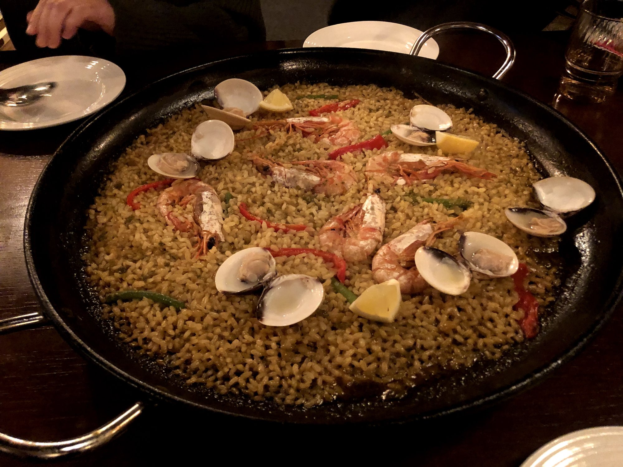 ヒヨコ豆となんとかチーズのサラダ、キノコとイベリコ豚、そして魚介のパエリアです!!