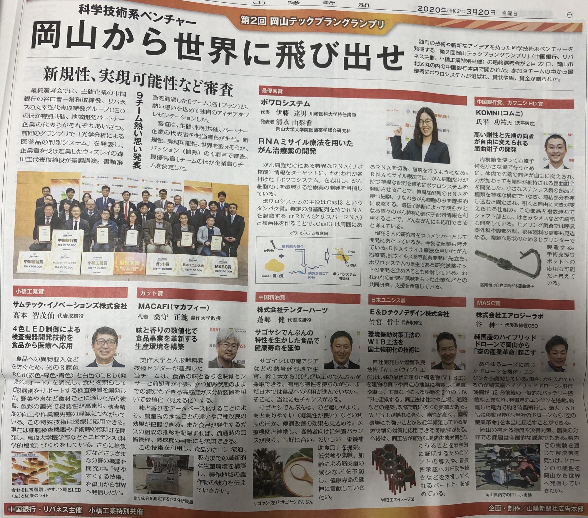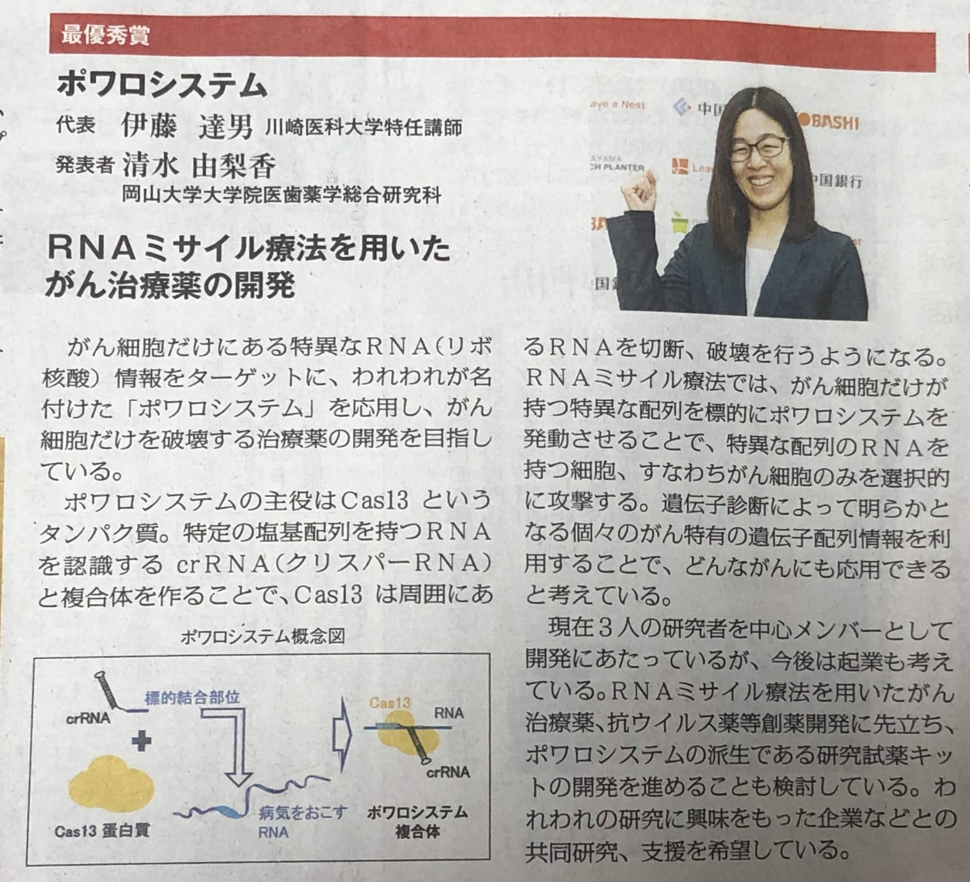 【衛生学講師の伊藤達男先生が代表の「ポワロシステム」の「RNAミサイル療法を用いたがん治療薬の開発」が、第2回岡山テックプラングランプリ最終選考会 最優秀賞を獲得した。】