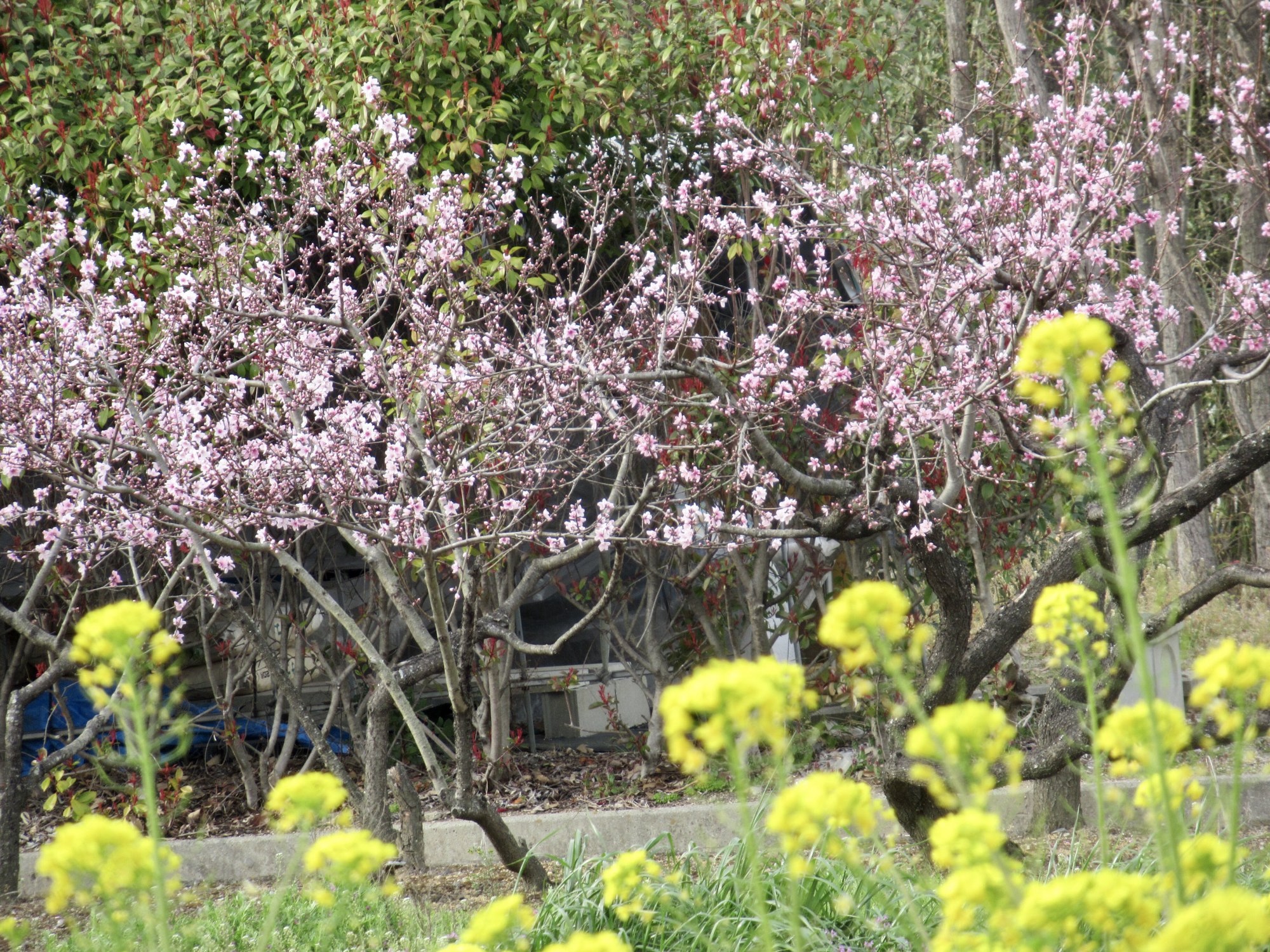 向こうは桃でしょうか? 農学部の畑地なので、フェンスの中です。