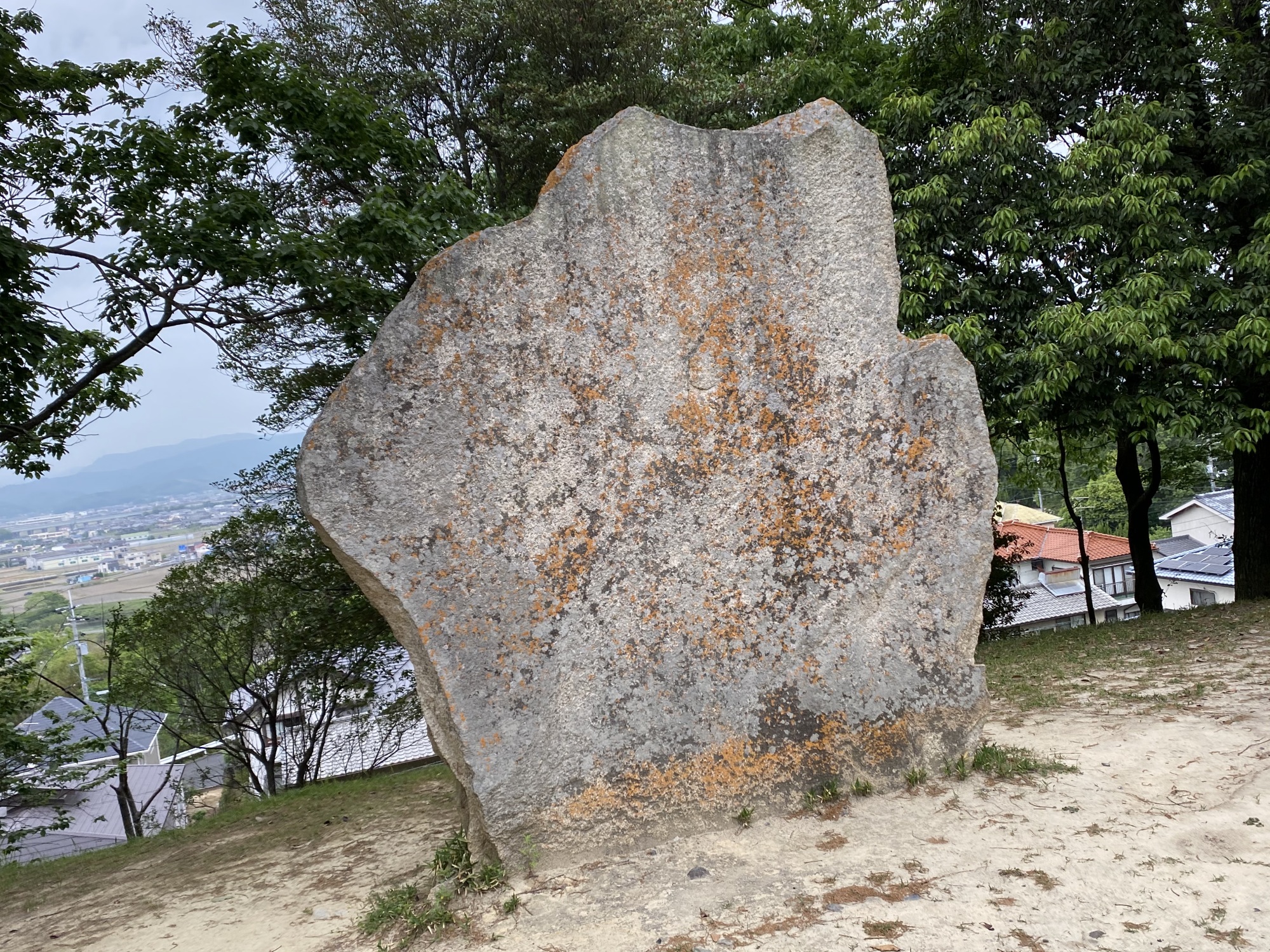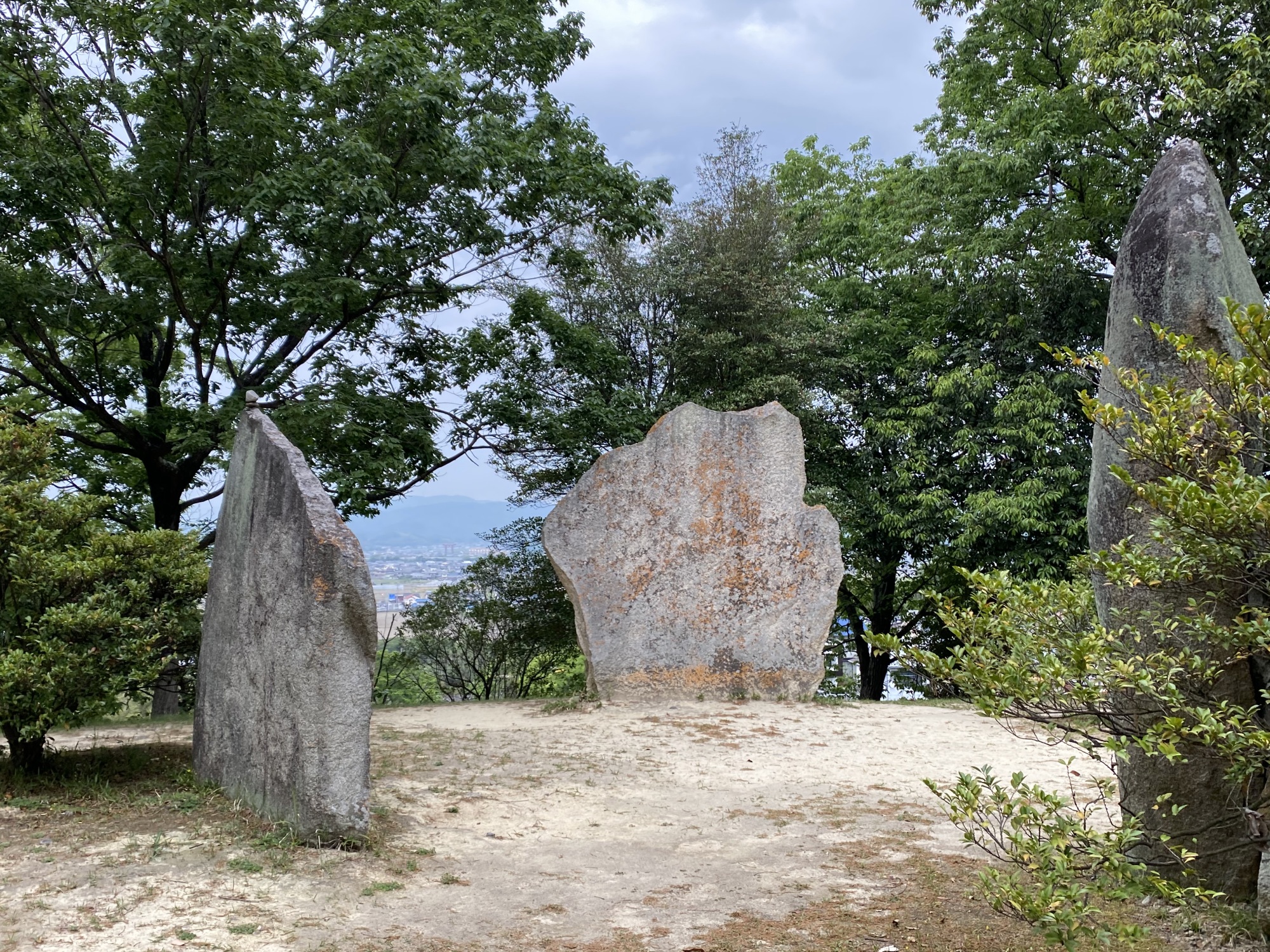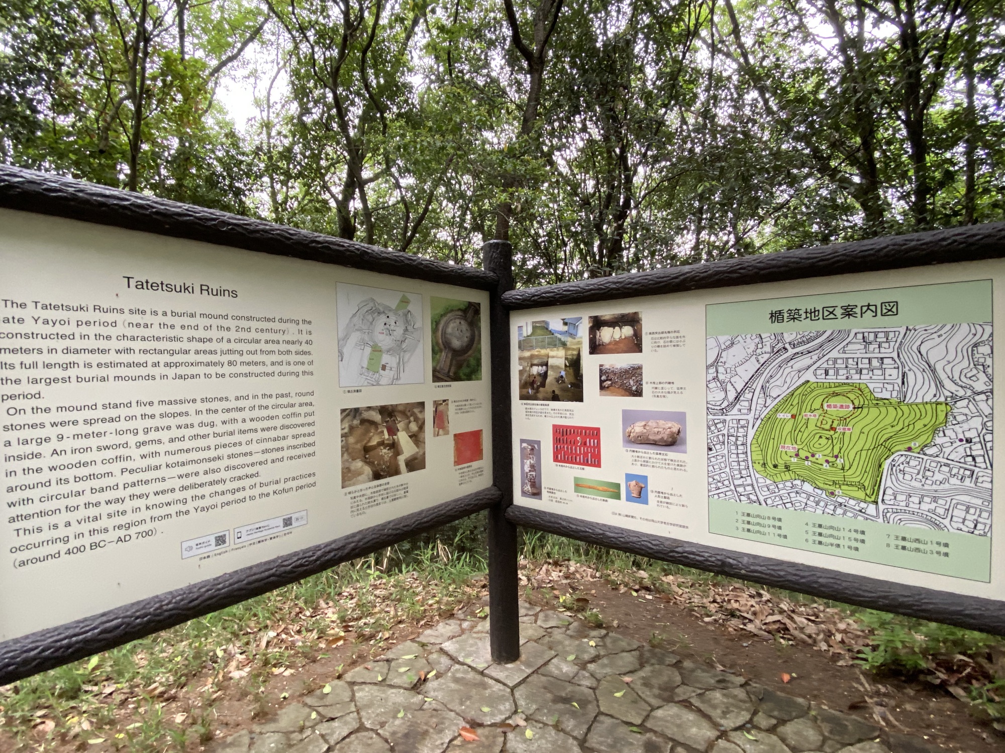 【王墓山丘陵の北端、楯築神社の境内を中心とする弥生時代後期の墳丘墓です。自然地形を利用し盛り土を行って整えられて墳丘の規模は、現在知られている弥生時代の墳丘墓としては最大級です。円丘部は径約50m、高さ5m。墳丘頂部には5個の巨石が立っており、墳丘斜面には円礫帯がめぐっています。】