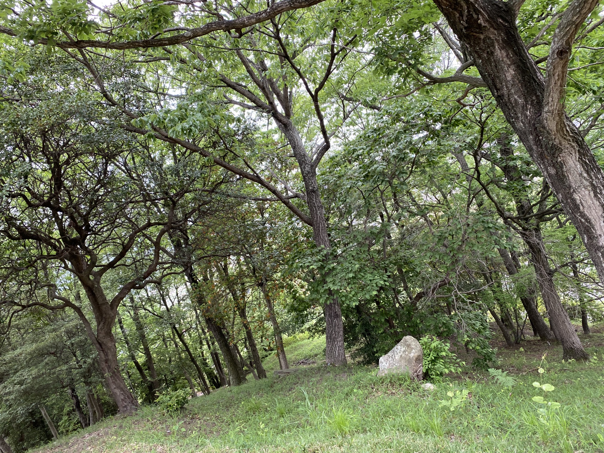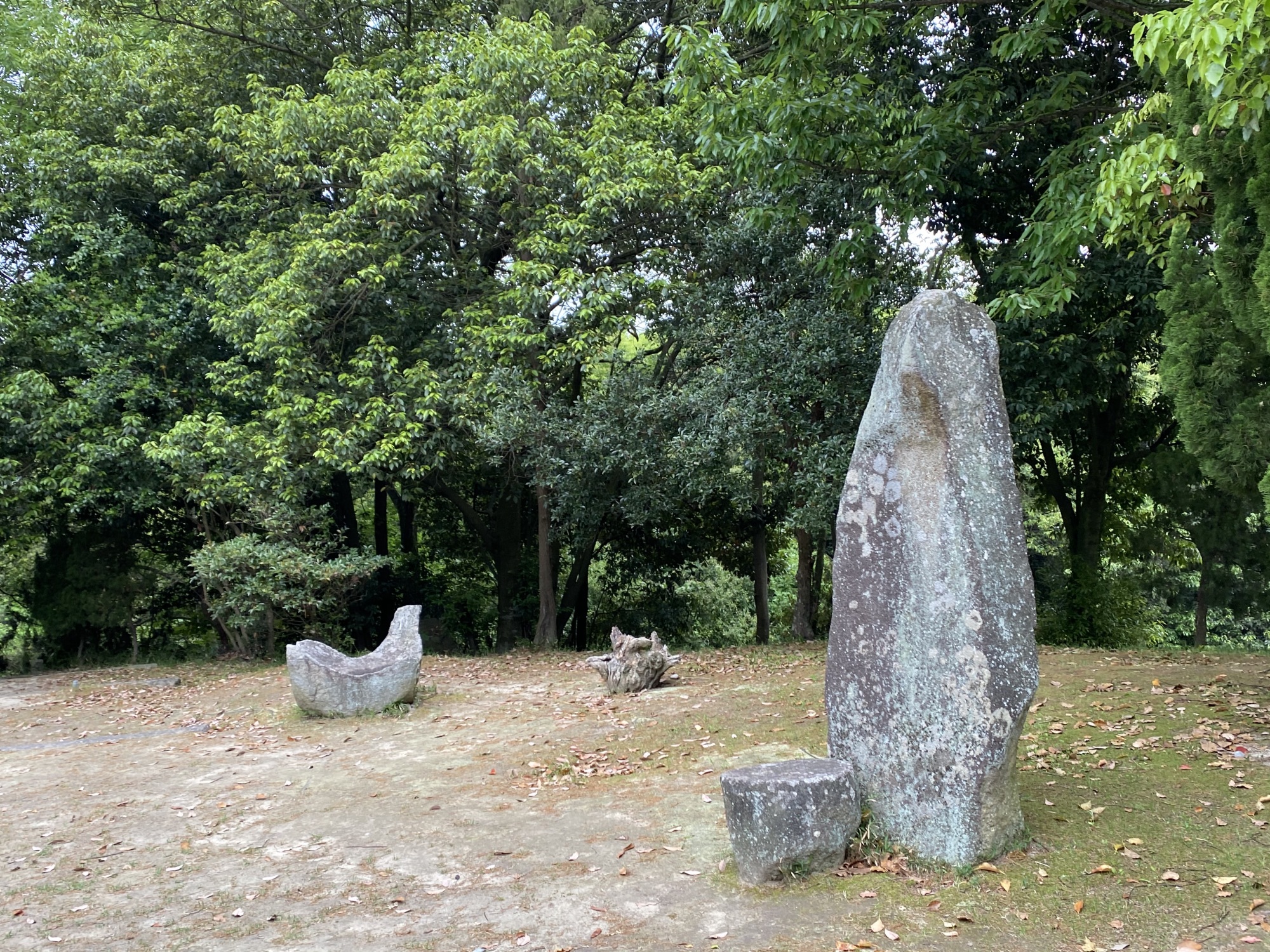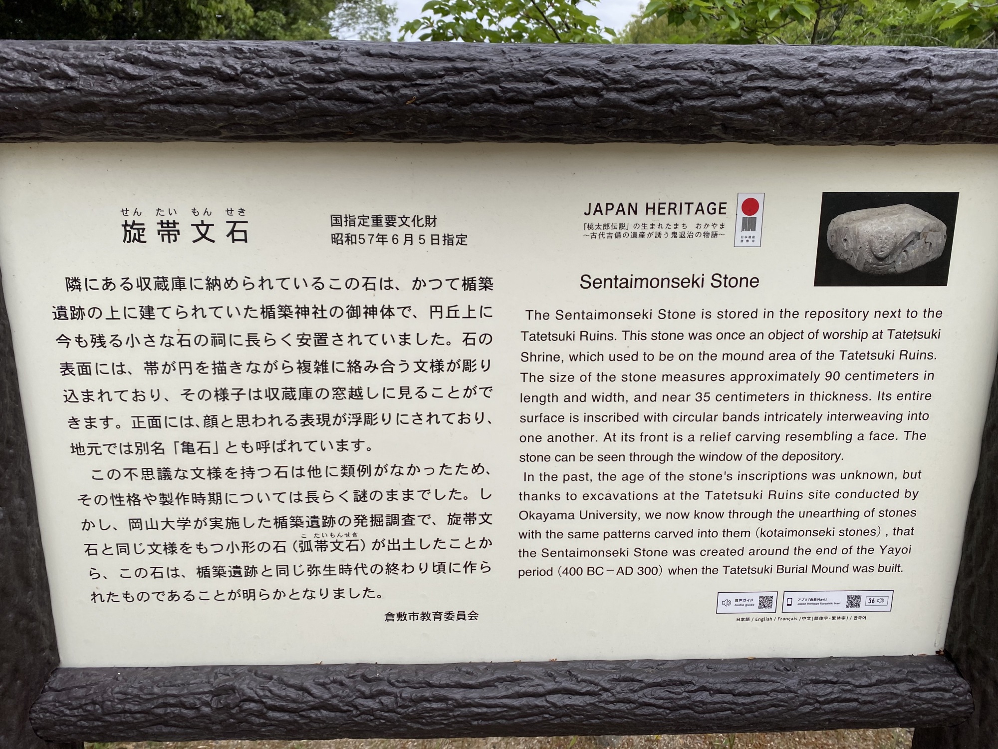 【王墓山丘陵の北端、楯築神社の境内を中心とする弥生時代後期の墳丘墓です。自然地形を利用し盛り土を行って整えられて墳丘の規模は、現在知られている弥生時代の墳丘墓としては最大級です。円丘部は径約50m、高さ5m。墳丘頂部には5個の巨石が立っており、墳丘斜面には円礫帯がめぐっています。】