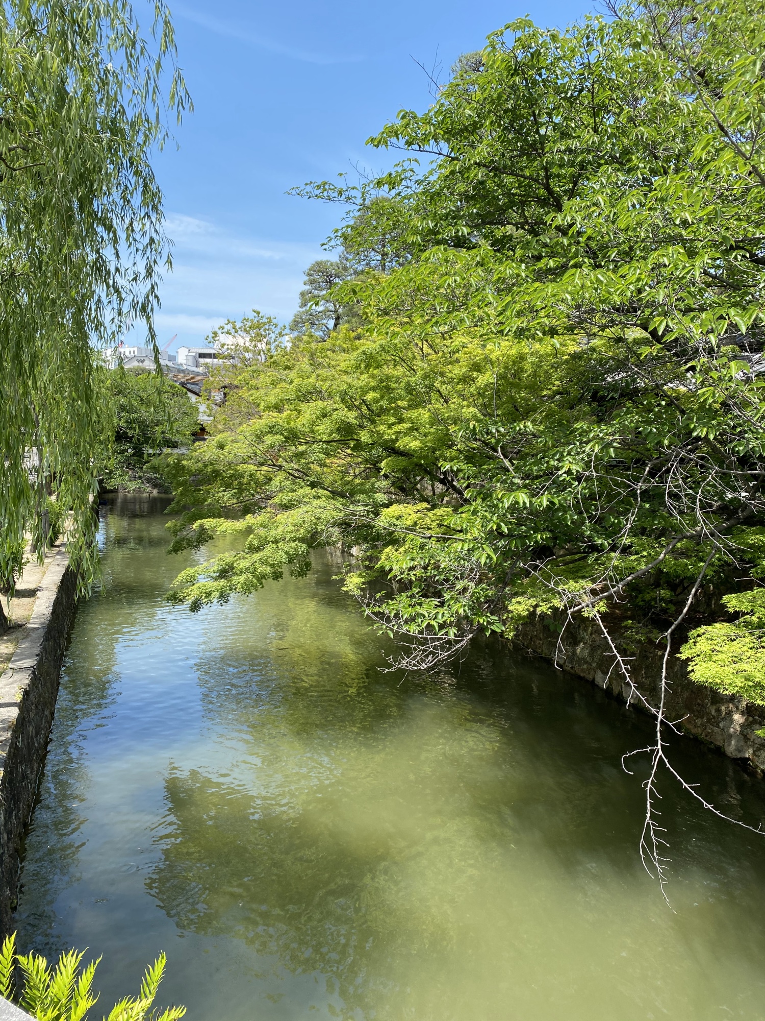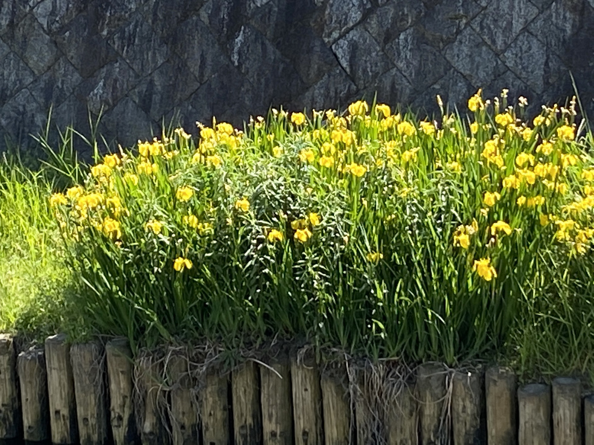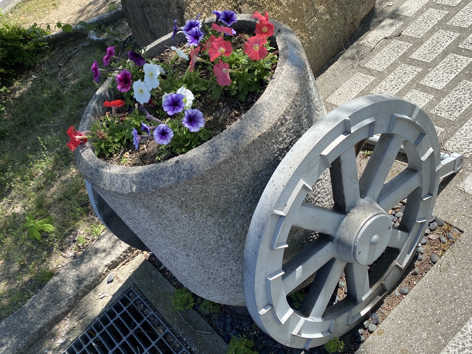 倉敷川沿いの柳の下に・・少し花が植わっていて……。