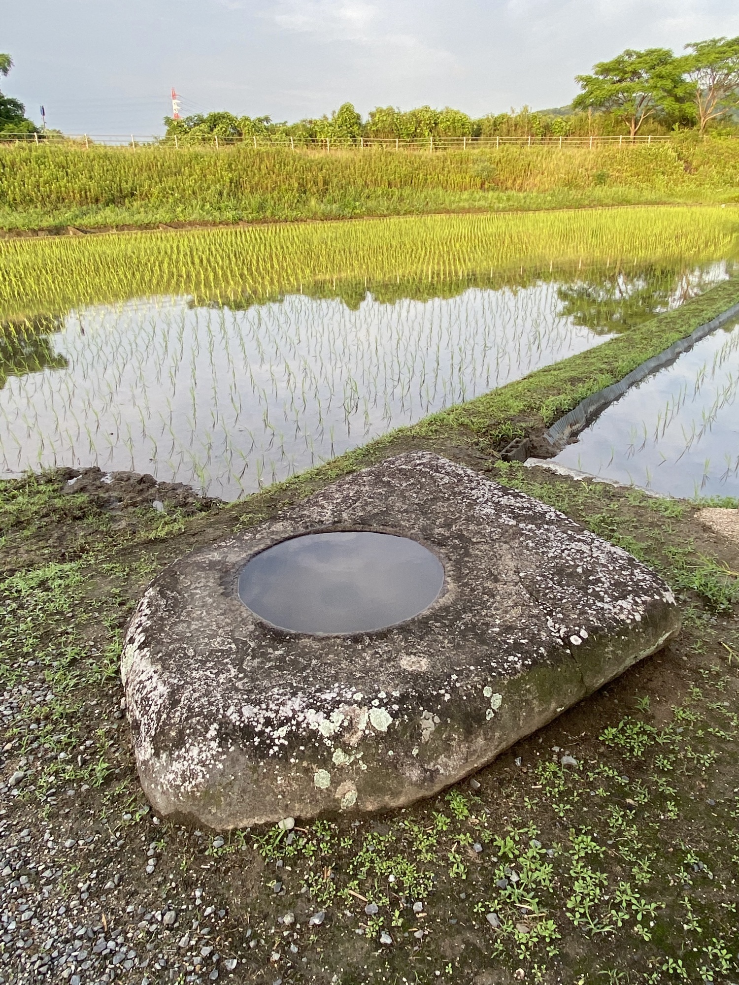 そして、いつものコースから70mほど、寄り道すると、惣爪塔跡【岡山県岡山市北区惣爪にある寺院跡。足守(あしもり)川東岸の田の畔にある、塔の中心柱の礎石(心礎)である。長径2m、短径1.5m、上部に直径70cmの円孔をうがち、さらにその底に直径16cmの子孔があり、仏舎利を納めていたと考えられる。俗称「石の釜」とも呼ばれ、周囲からは奈良時代の古瓦が出土していた。奈良時代前期には、この礎石の上に建っていた塔や金堂、講堂などが並び一大伽藍(がらん)が営まれていたと想定されるが、塔以外の建物の礎石や基壇の痕跡は確認されていない。1928年(昭和3)に国の史跡に指定された。付近一帯は弥生時代の集落跡でもあり、水田の下から貝層や土器その他の遺物が発見されている。】