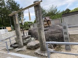 境内にぽつんと、岩殿神社もあります【乙島の戸島神社の境内に、いつのころからか1つの岩がある。江戸時代の中期、境内拡張工事で、石工がクサビ穴を掘ったところ、数個の穴から赤い血が出てきて、工事ができなくなったという。仕方なく、岩はそのまま同じ場所に置かれていたが、その後も祭礼のたびに取り除いた方が良いとの声があがり、他の石工に依頼することになった。しかし、今度もやはり、クサビ穴を開けると、血が出始め、石工は驚いてお詫びに祠を建てた。そして、享保5年(1720年)には鳥居を奉納して、岩殿神社として祀った。現在でも、岩の東と西に数個ずつのクサビ穴が残っているという。】