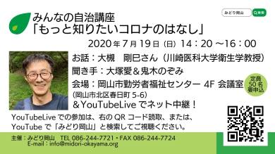 みどり岡山:県議の大塚愛さん、そして、岡山市議の鬼木のぞみさんの・・団体ですが、鬼木さんとは、以前から「おかやま労働安全衛生センター」の関連で知己でした。5月頃に、そのつながりから大塚さんから電話をもらってコロナ対策について、こちらの立場でお話をしたのですが、今回「みどり岡山」の総会の後に、いつも「みんなの自治講座」をされるってことで、その講師というか・・・今回、集まられた皆さんからの質問に答えたりってスタンスにしたのですが・・・出向いてきました。