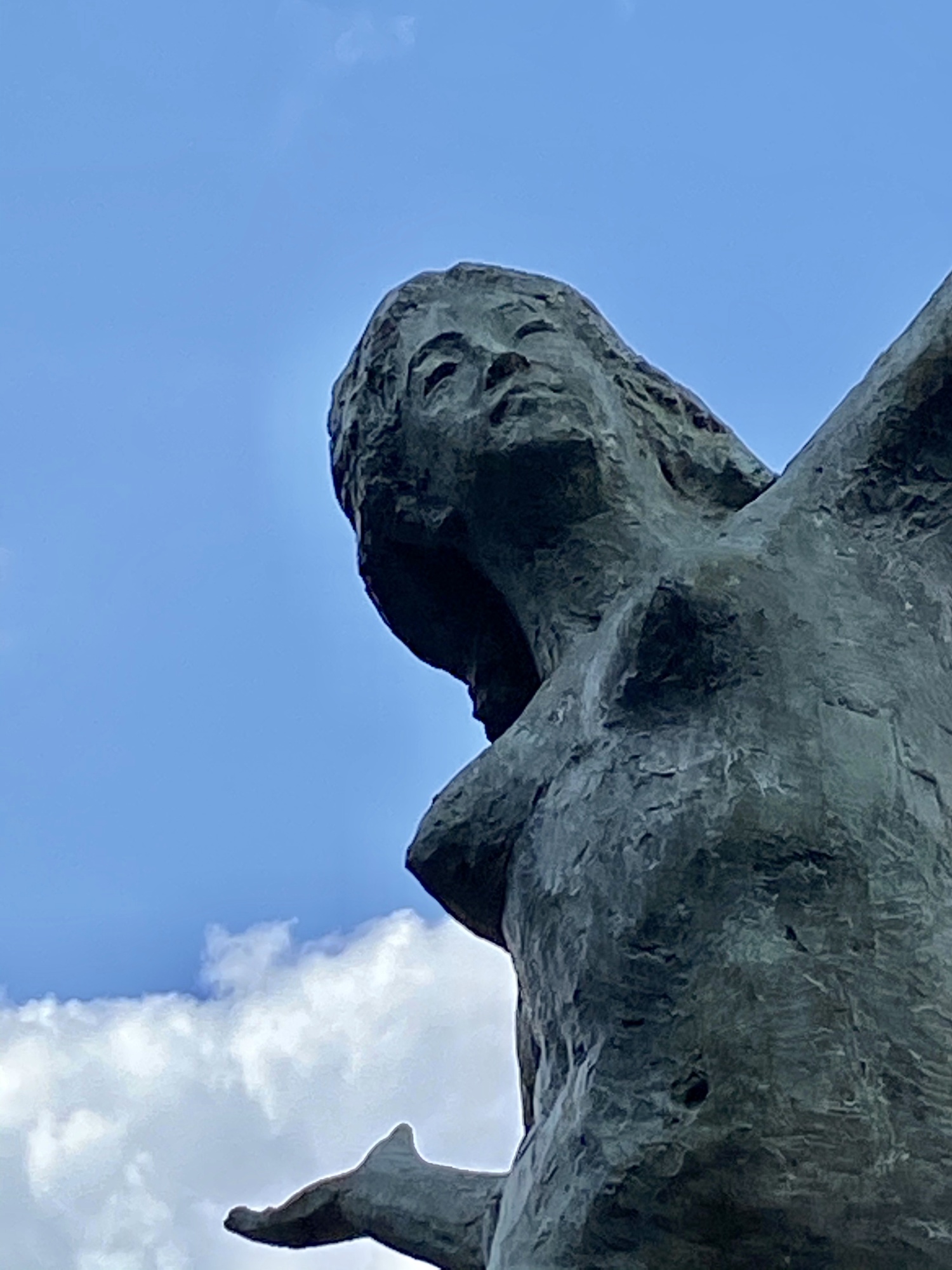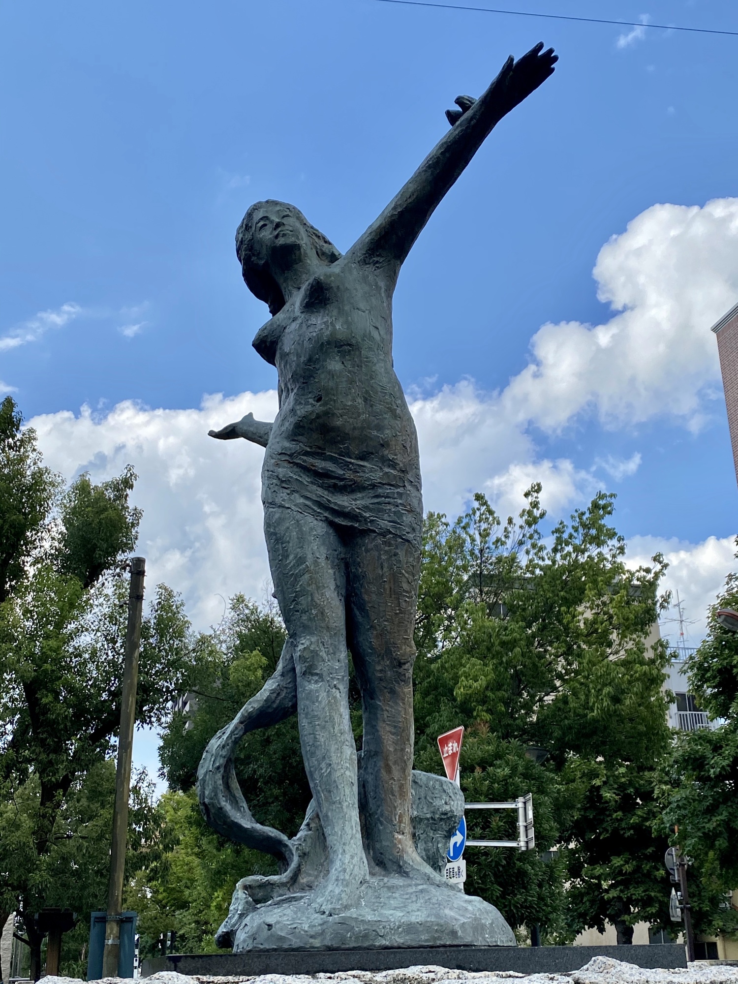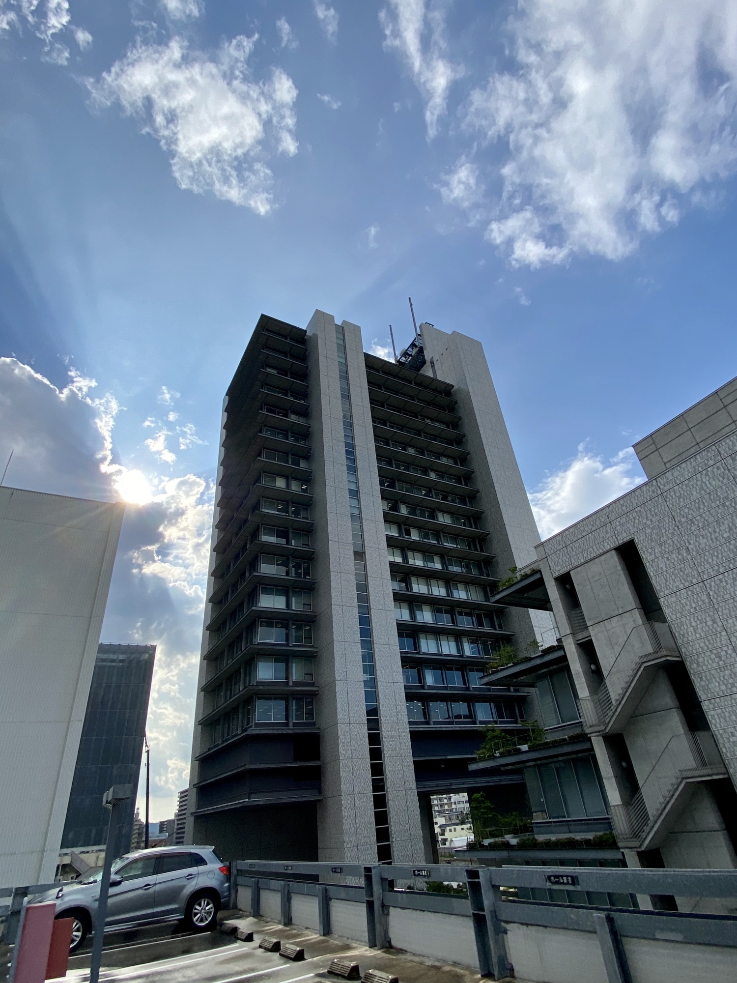 いつもの山陽新聞社ビル…駐車場は、いつも通りで、屋上に停めさせてもらいます。夏の入道雲が見えています、梅雨明け!