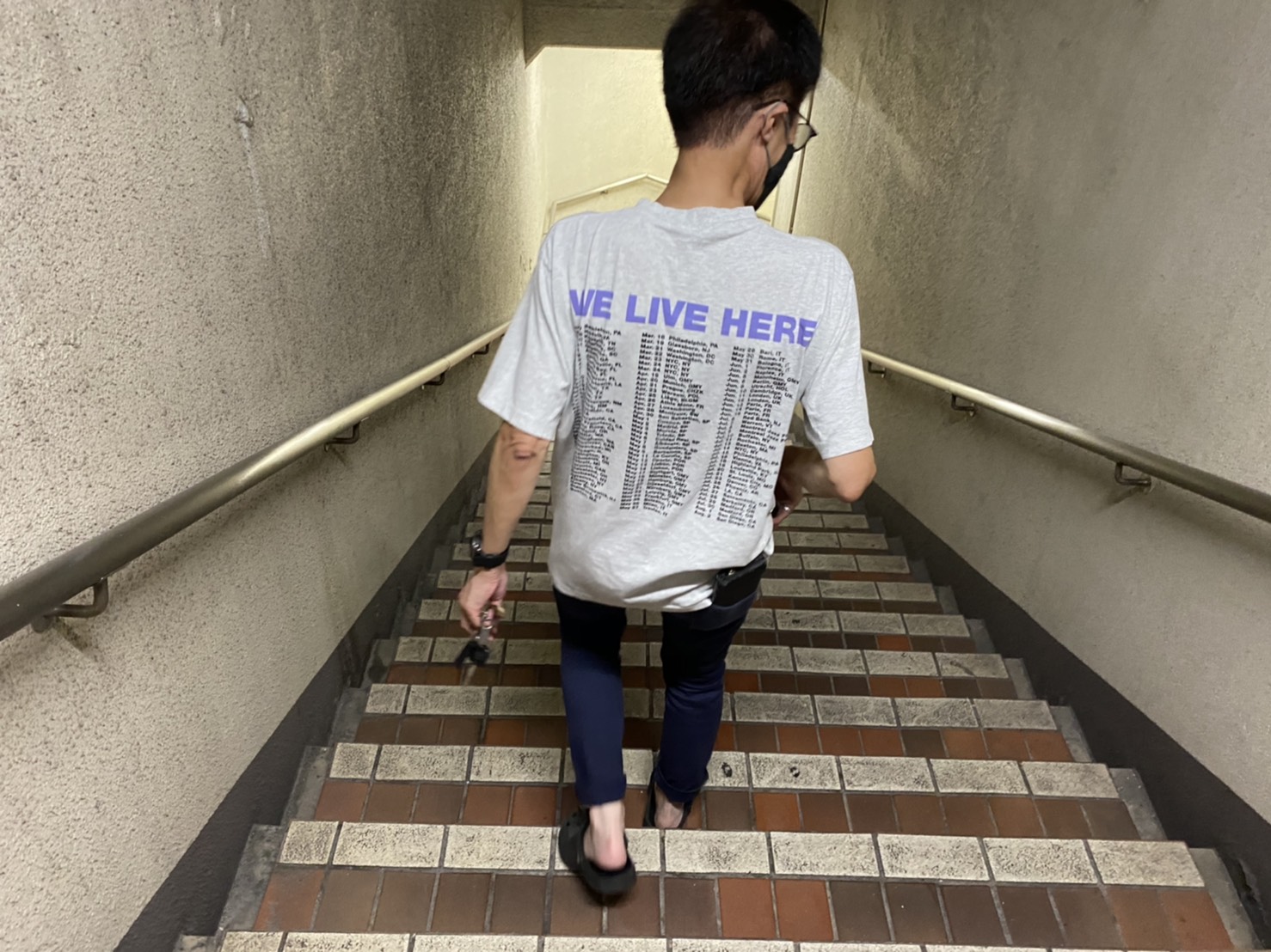 さて、夜・・倉敷駅前の交差点の地下道への入り口:娘がこのTシャツが柄が良いと撮影~米国NIHへの留学中の Pat Metheny Group