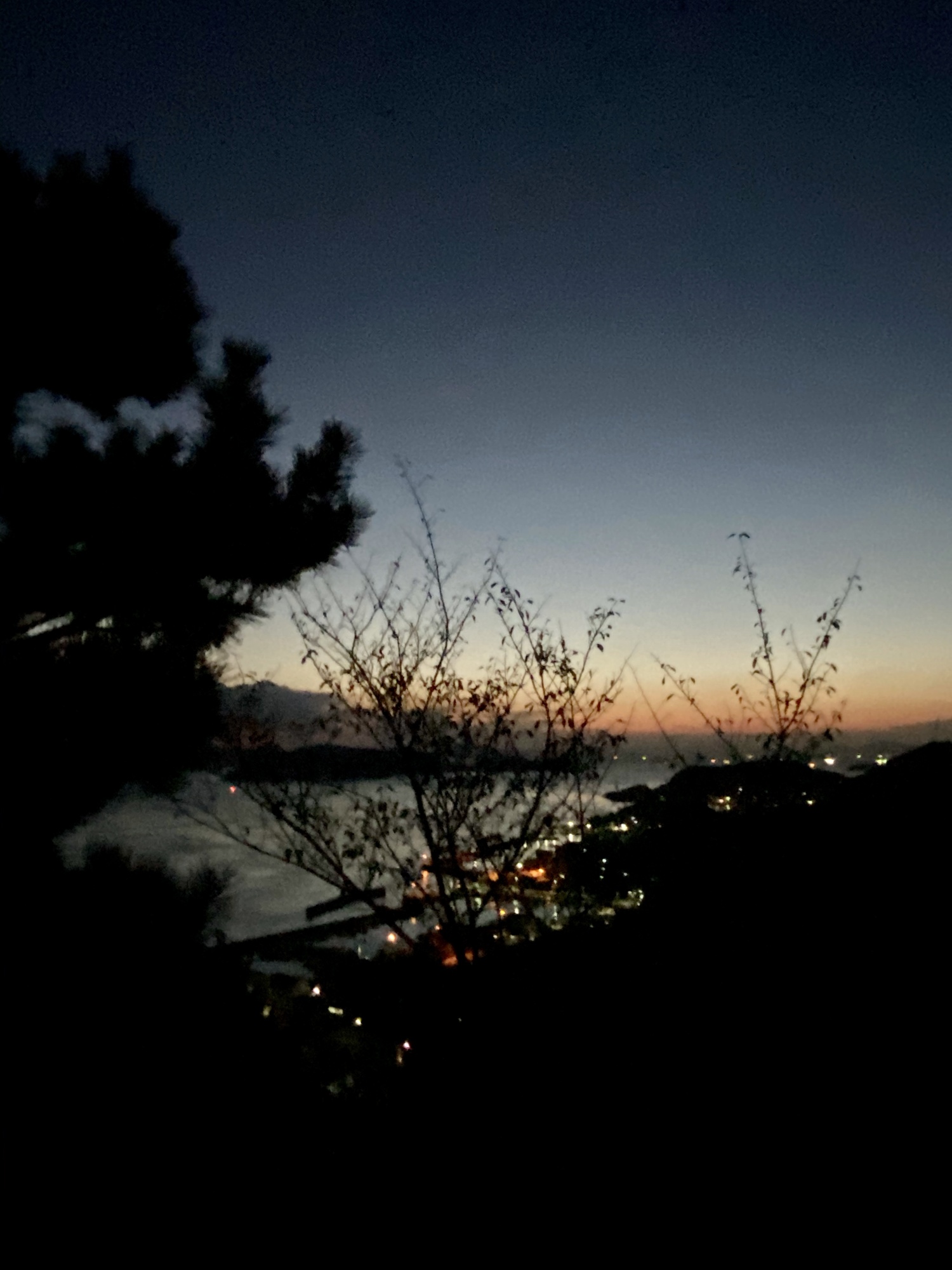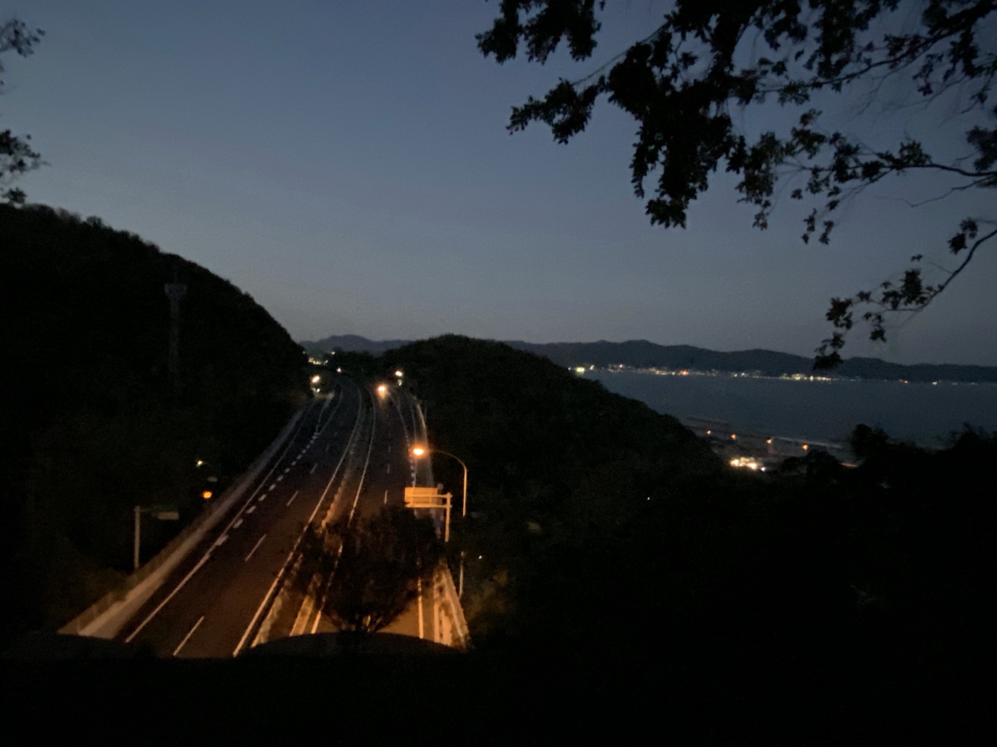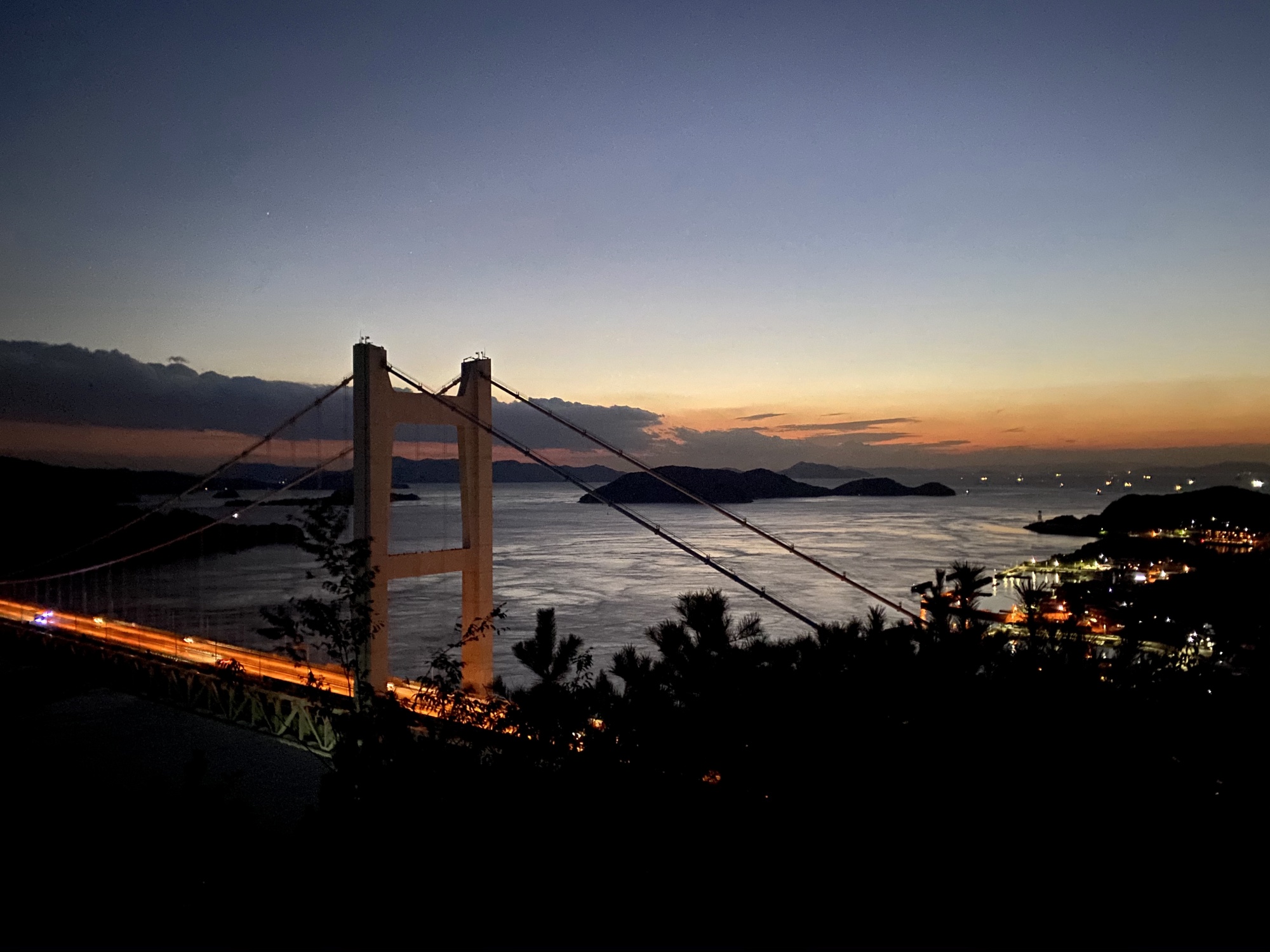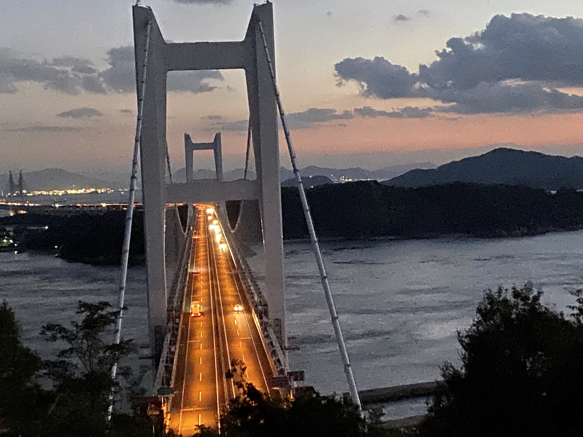 丁度、瀬戸大橋の下津井瀬戸大橋の直上です。逢魔が時で・・絶妙の色合い
