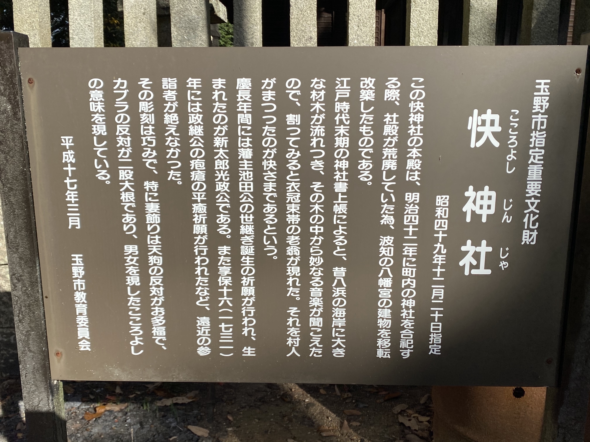 【1729年、児島湾に大きな材木が流れ着いた際、材木から音楽が聞こえたので割ってみると、中から衣冠束帯の老翁が現れたといいます。そんなこんなで、その老翁を祀ったのがこの神社の始まりだそうです。備前岡山藩の第3代藩主・池田継政直筆の詠歌&絵馬が納められているそうです。】