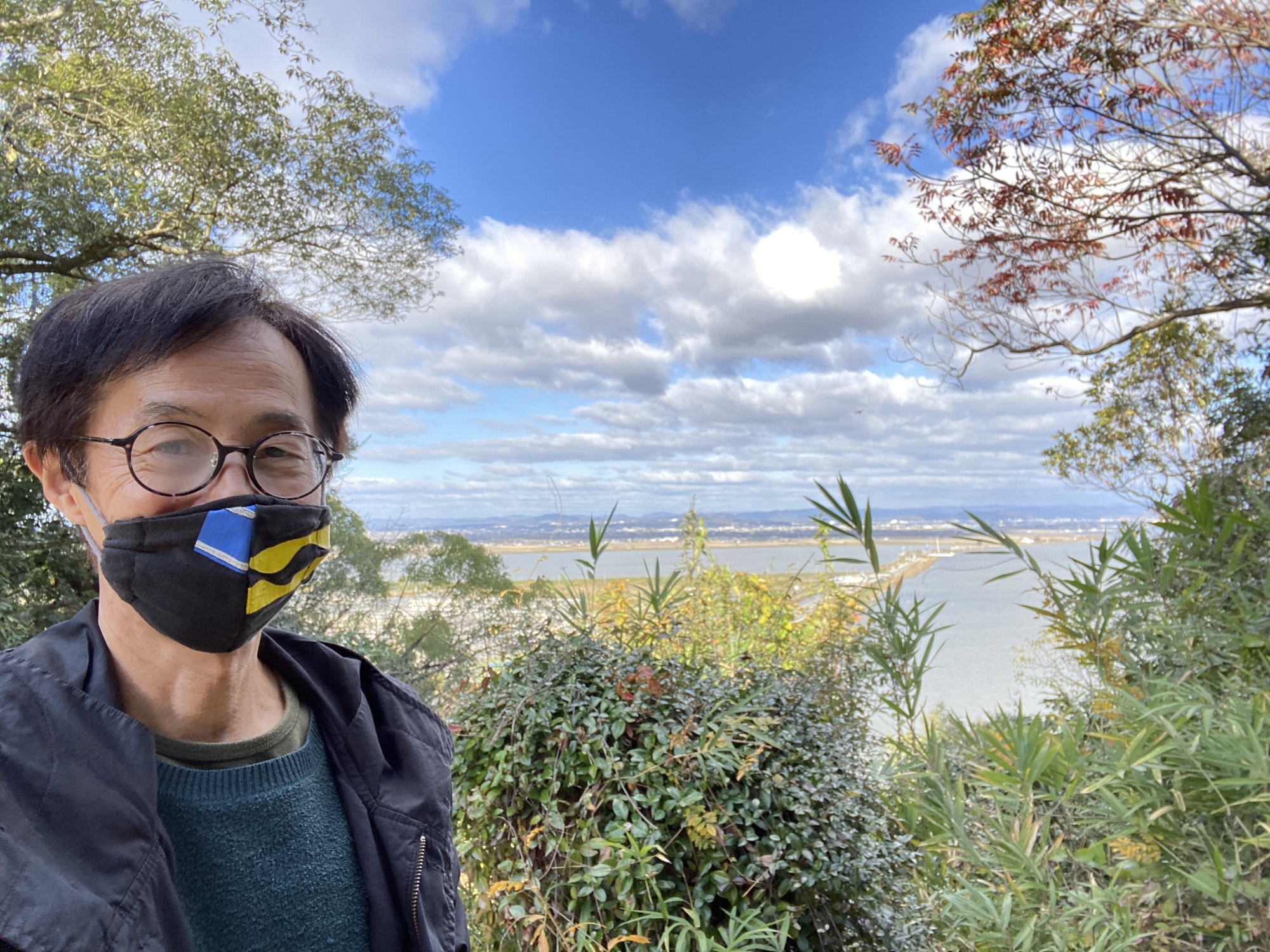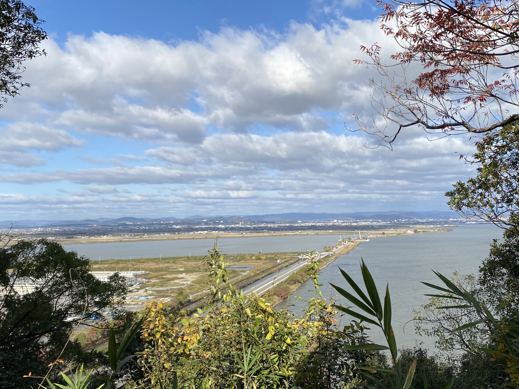 児島湖が見渡せます・・・この堤っていうのか、堰っていうのの、右(東)が児島湖、左(西)は鴨川の河口ですが、鴨川は児島白尾辺りからの短い川ですが。