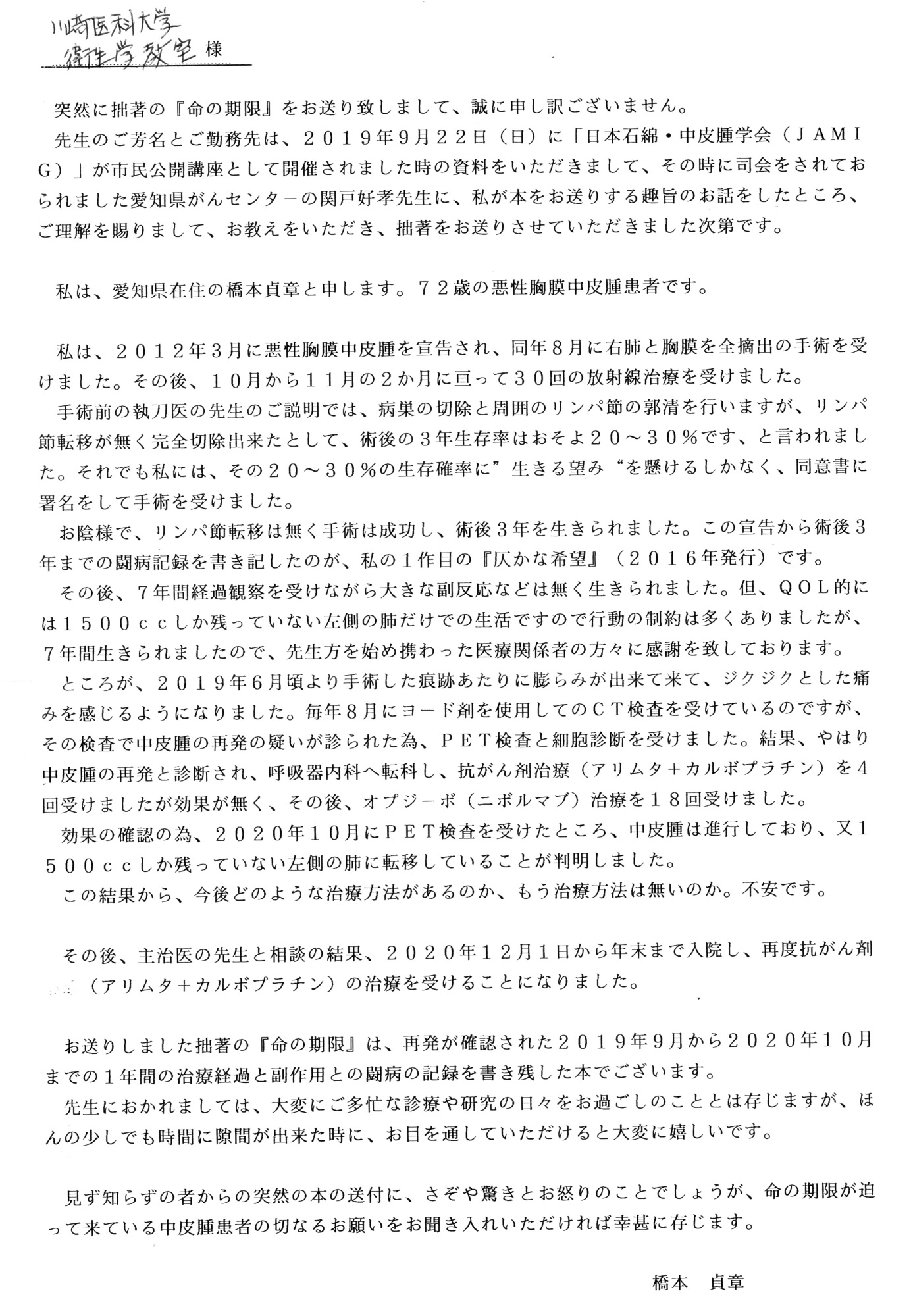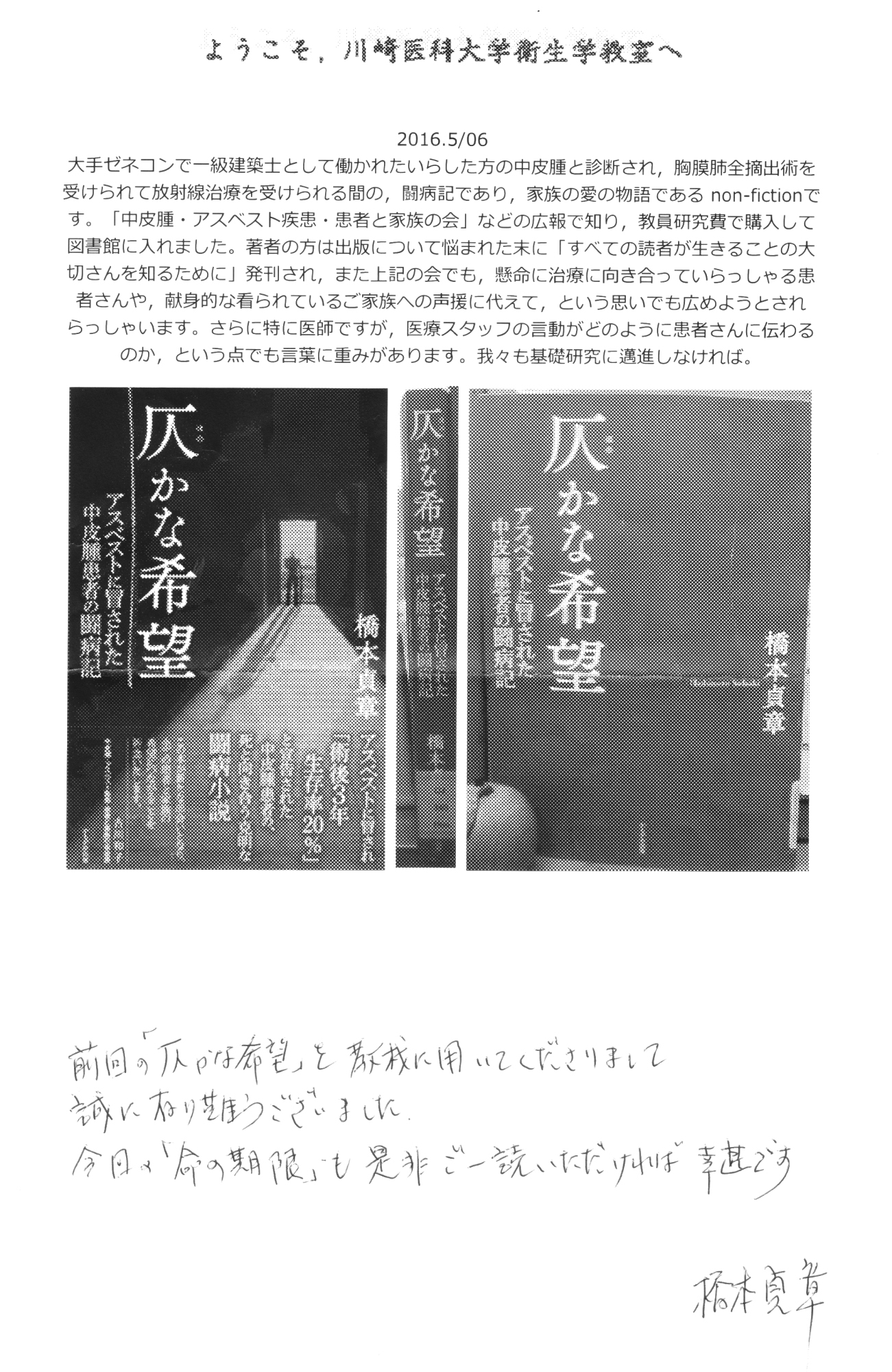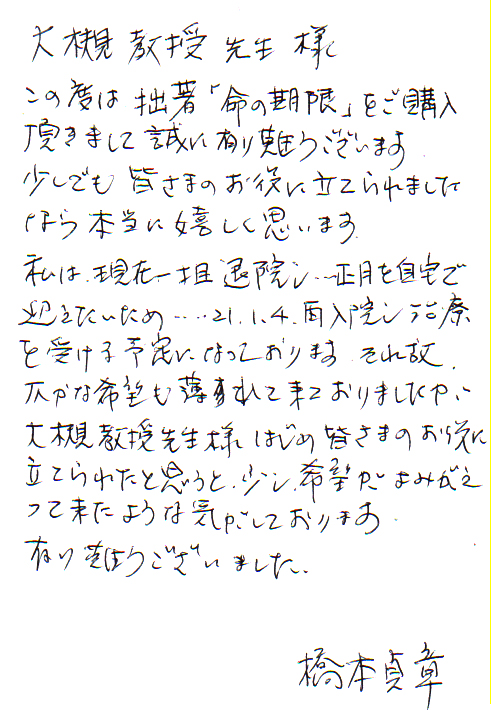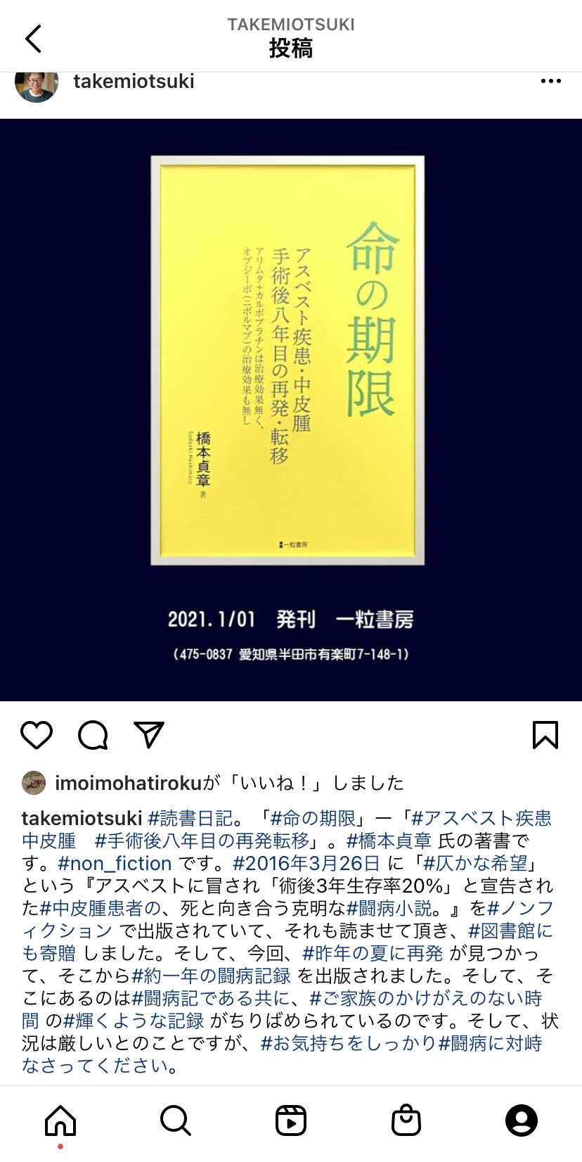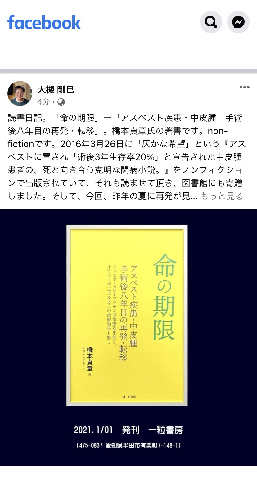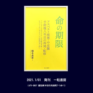 | 2020.12/25 今週に入って、「一粒書房」という処から、書籍がそ送付されてきました。 橋本貞章氏の、悪性中皮腫のノンフィクションの闘病日記です。 実は、2016年に、最初に診断された時のことを書籍にされていて、ボクも読みましたし、図書館にも寄贈しました。2016.5/06 今回は、そのサイトも見て頂いていたようですし、また、昨年、大槻は酸化できなかったのですが、日本石綿・中皮腫学会で会長を務められた関戸先生からのご紹介だったようです。 そして、読了後に、SNS(facebookとInstagram)でも紹介させて頂きました。可なり厳しい状況であることは否めないのですが、お気持ちをしっかりと向き合って頂ければ嬉しいです。 |