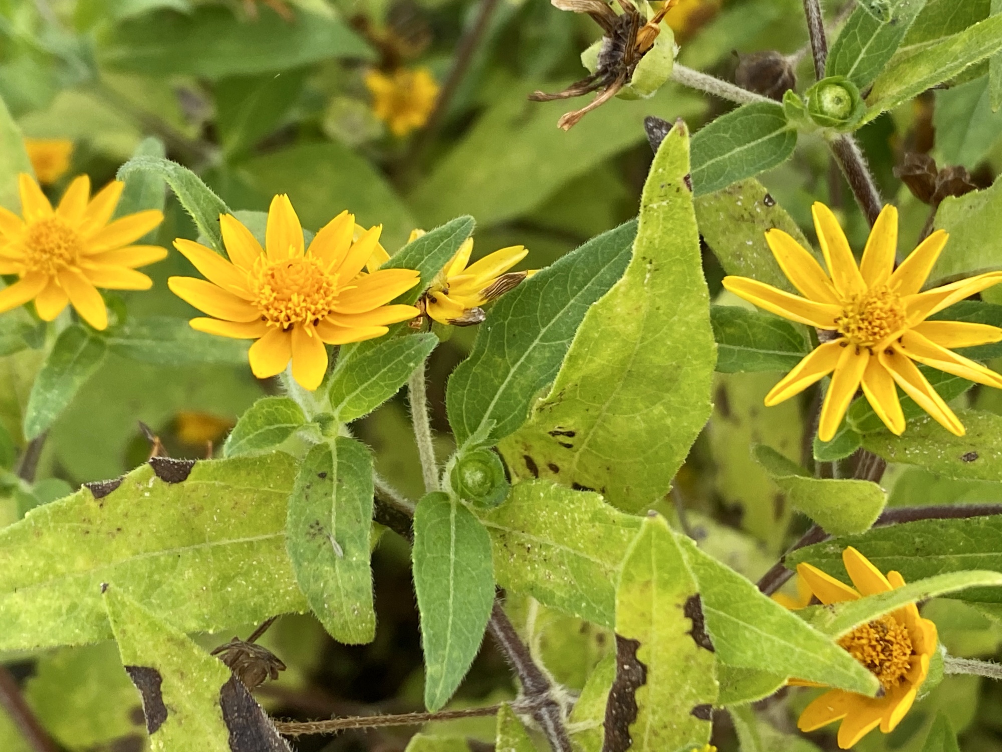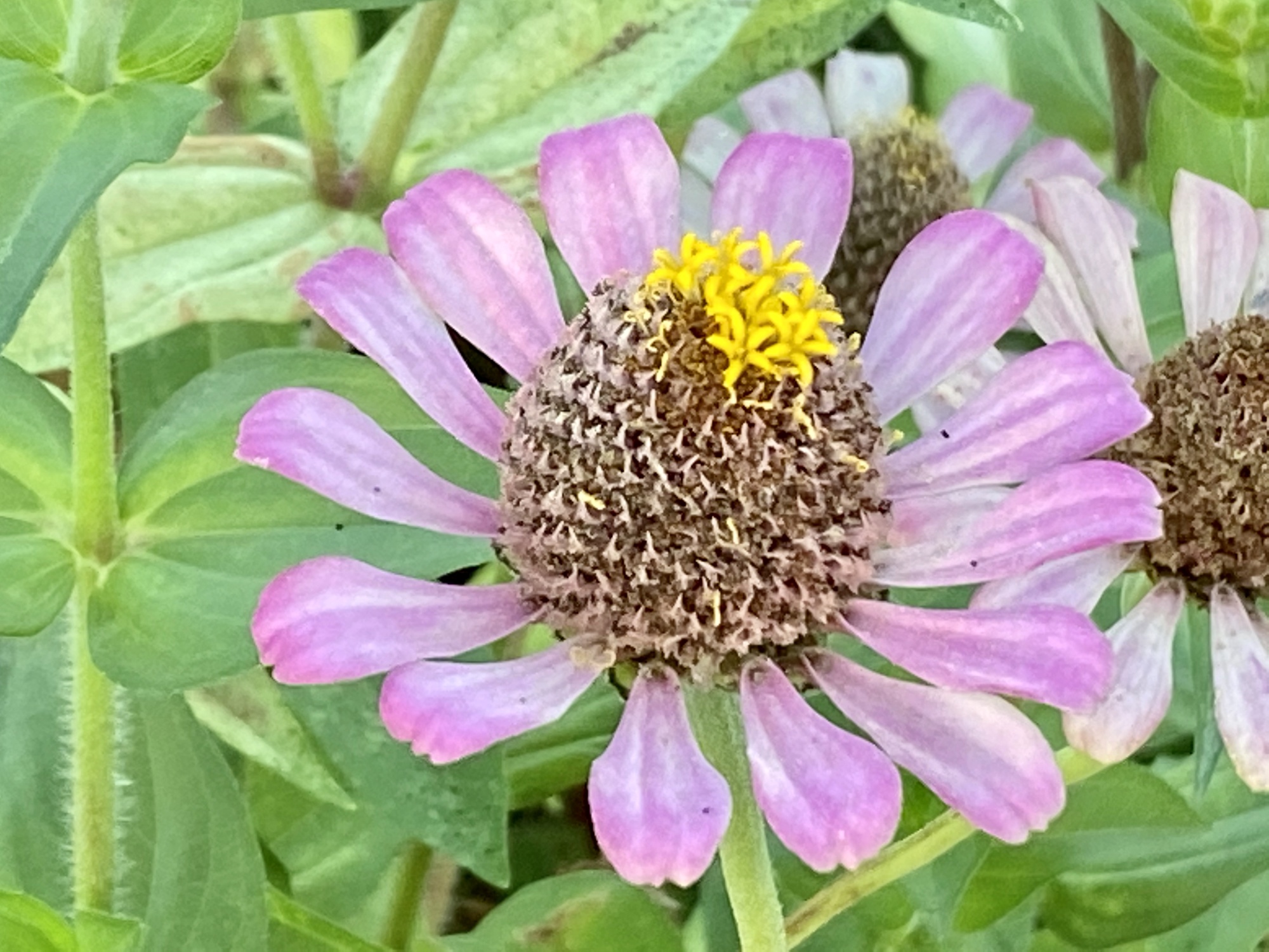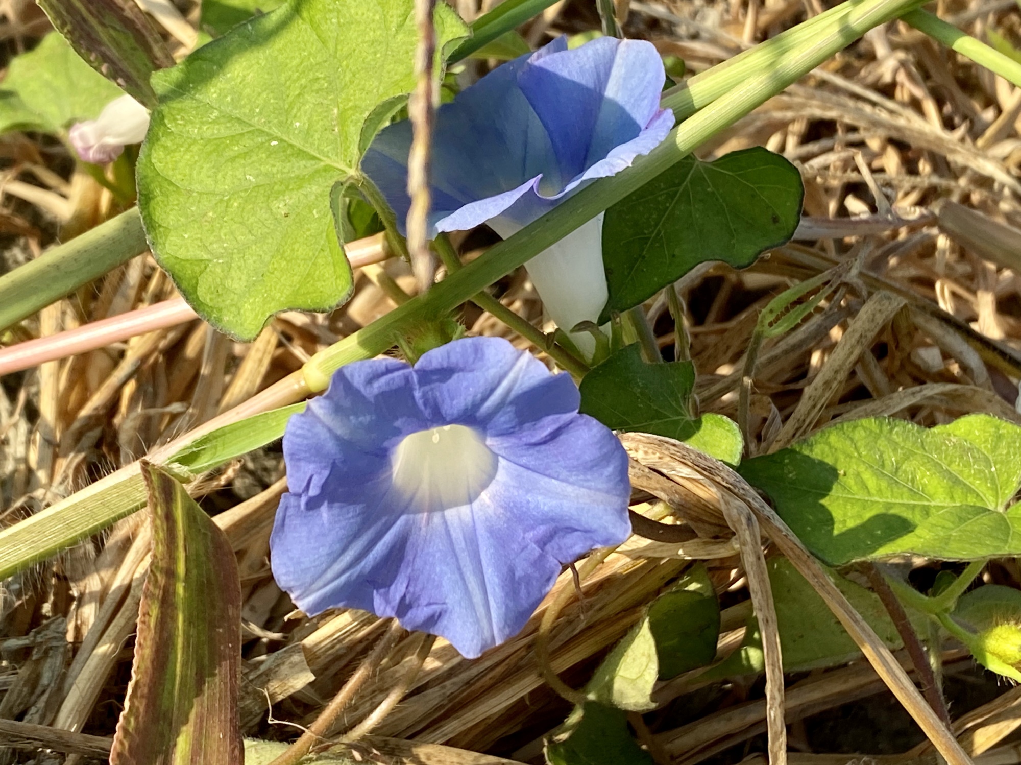 この枝の下側の茶色のが、バッタか何かです。飛んで、この格好で収まりました。