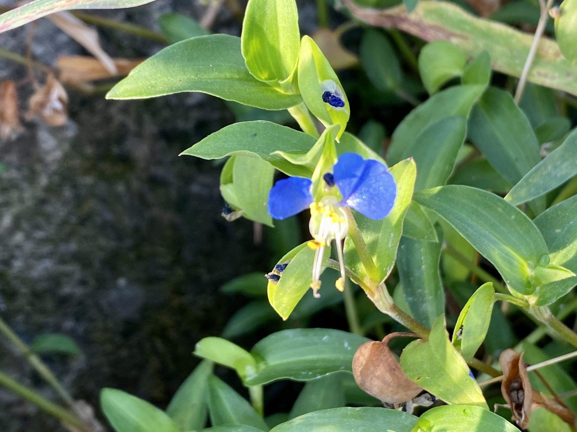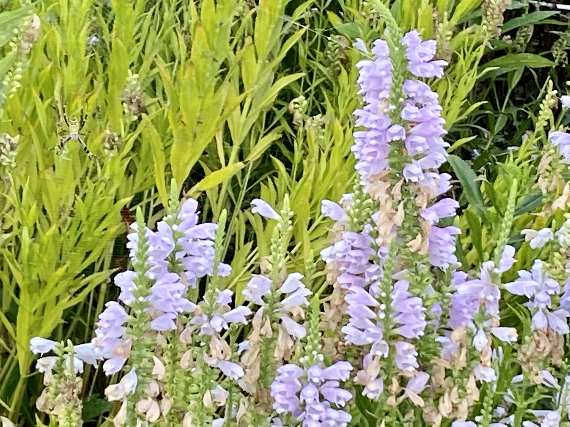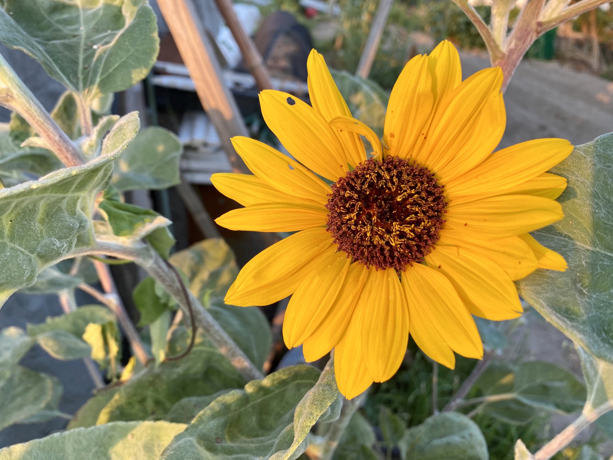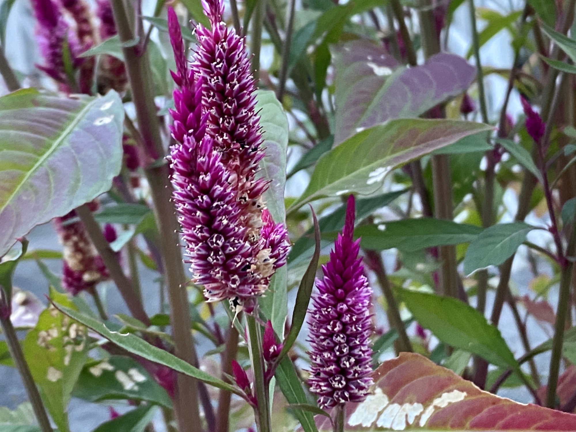 この枝の下側の茶色のが、バッタか何かです。飛んで、この格好で収まりました。
