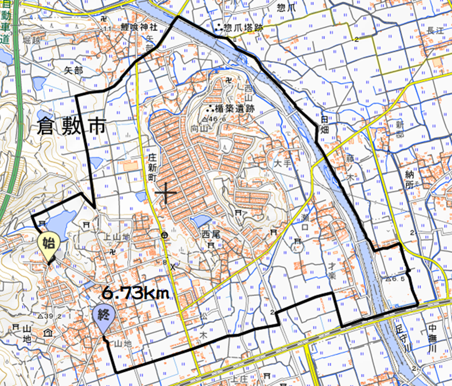 新庄上地区を南から北へ・・庚申山の所で、足守川に・・・