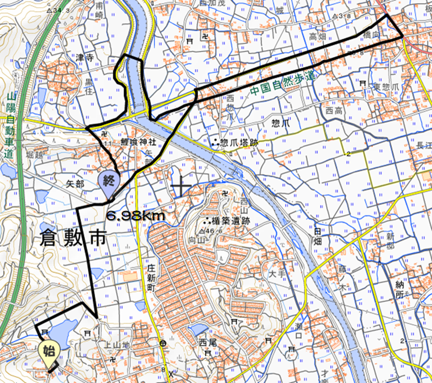 山地→矢部→新庄下→津寺→矢部→山地のコースです。