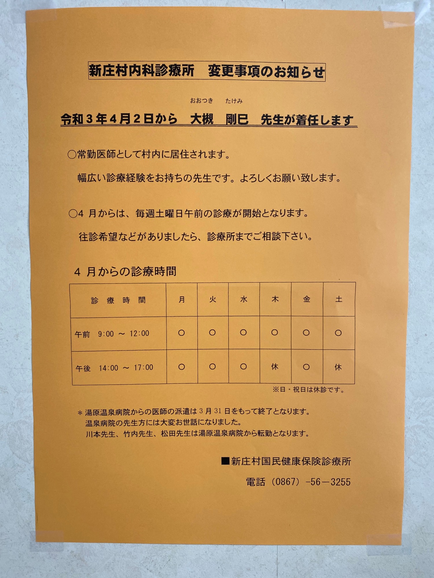 2021年4月:新庄村国民健康保険診療所で一人医師として働き始めました。よろしくお願いいたします。あれこれ:1-10日