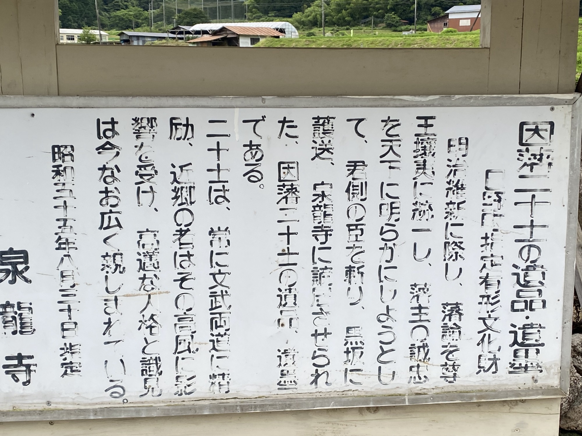 【二十士の業績を物語る数々の遺墨・遺品が泉龍寺に所蔵されている。遺墨としては二十士の寄せ書き(軸物2点)河田佐久馬以下8名の書(11点)遺品としては、本箱・文箱・文机等の勉学用品、木刀・竹刀・剣道防具・槍等の武芸用品、小袖・陣羽織・飯箱・碁盤・碁石等の生活用品24点の合計37点で、日野町の指定有形文化財に指定されている。】
