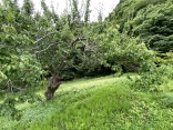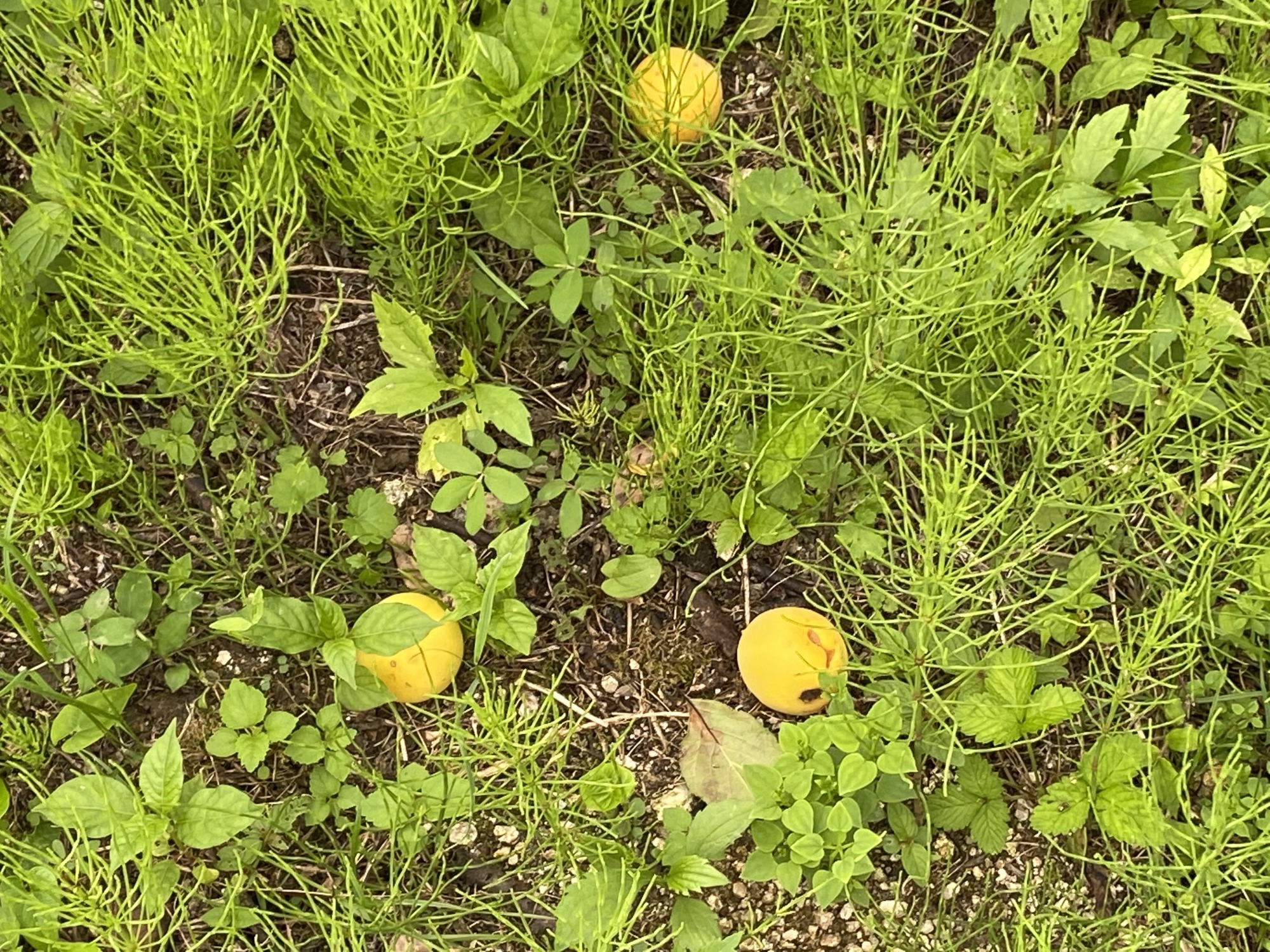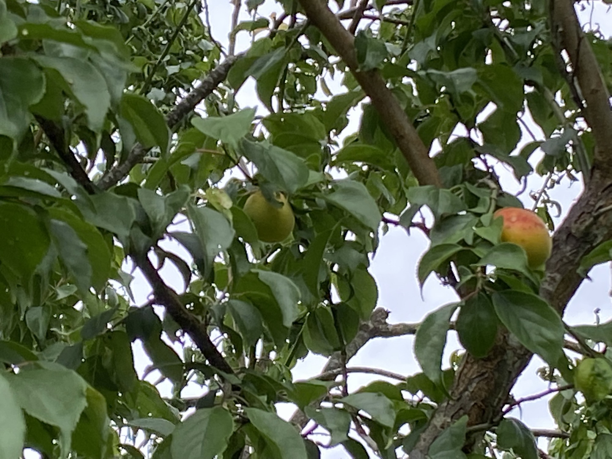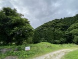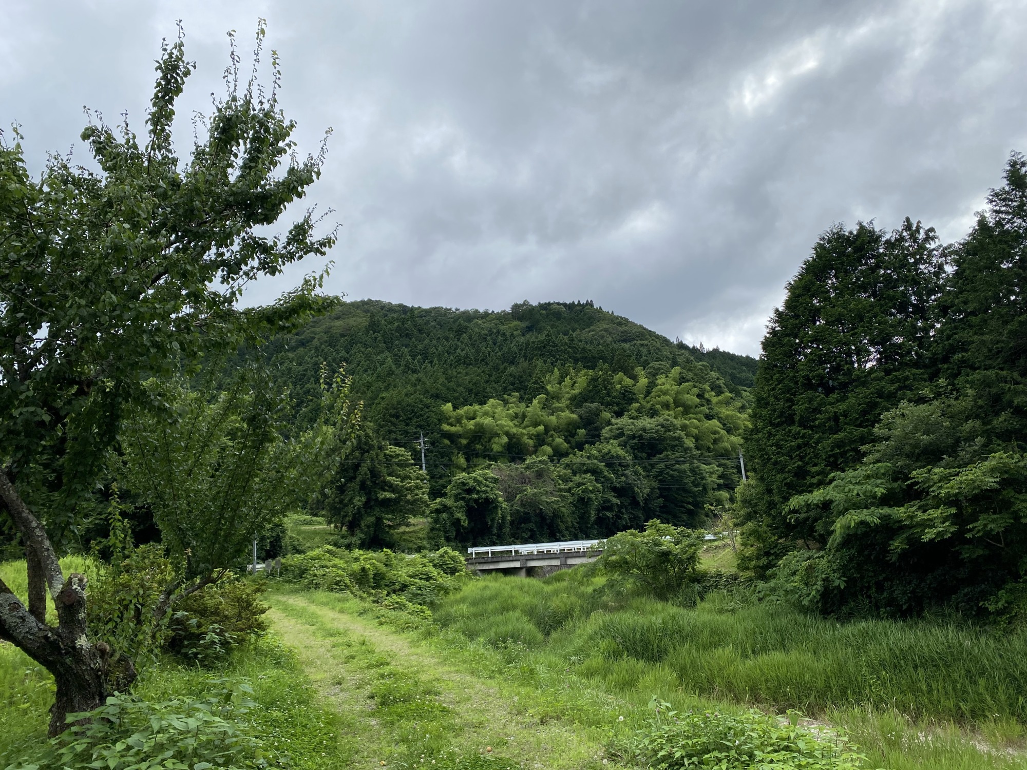 さて、墓地近くの駐車場では、スモモ? 杏? 背景に山があります。