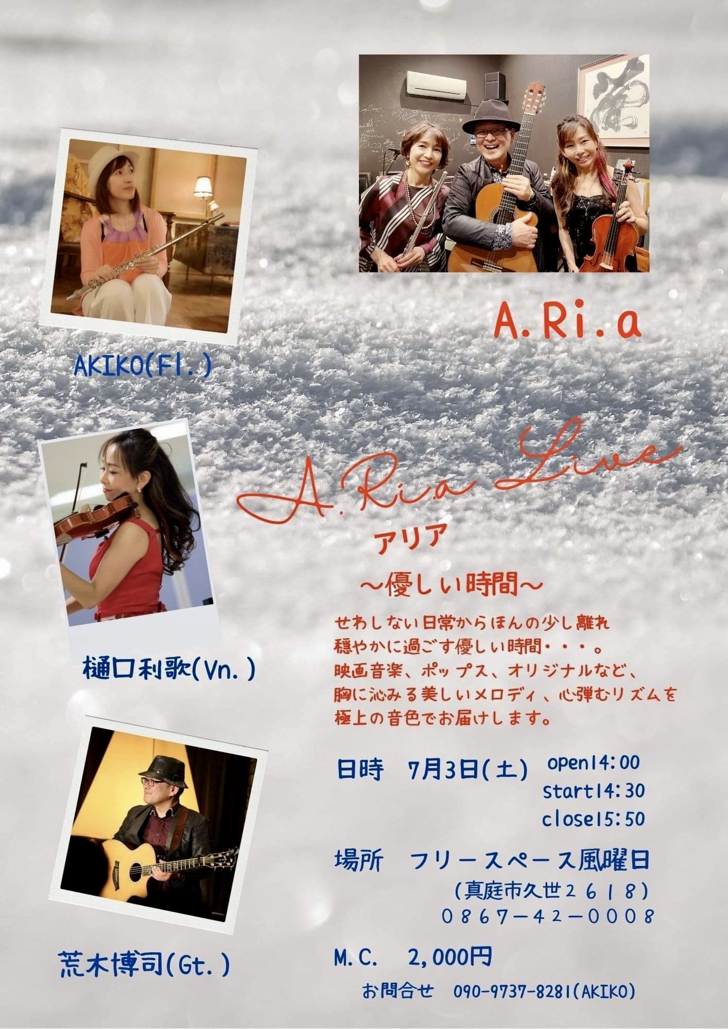 真庭市久世の「フリースペース~風曜日」さんで、A.Ri.aさんというフルートとヴァイオリンとギターのトリオのLIVEでした。