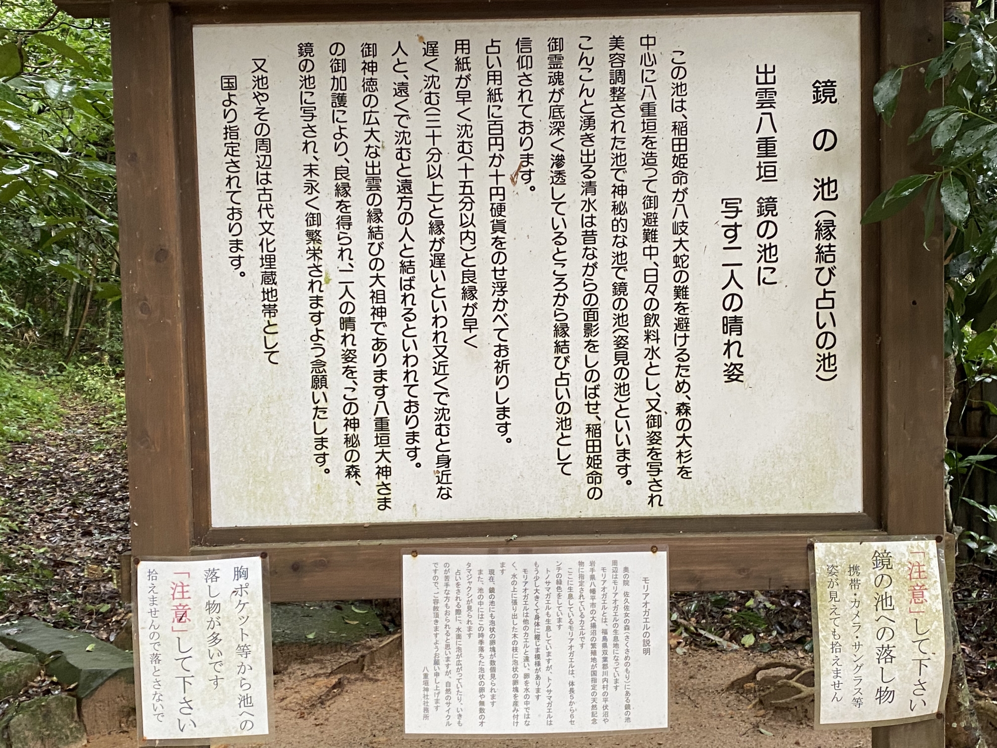 【社殿後方には「奥の院」が鎮座し、「鏡の池」と呼ばれる神池や「夫婦杉」と呼ばれる2本の大杉、「連理の椿」がある。「鏡の池」は櫛稲田姫命が、スサノオノミコトに勧められ、この社でヤマタノオロチから身を隠している間、鏡代わりに姿を映したと伝えられるもので、良縁占い(銭占い)が行われる。社務所で売られている薄い半紙の中央に、小銭を乗せて池に浮かべると、お告げの文字が浮かぶという手法。紙が遠くの方へ流れていけば、遠くの人と縁があり、早く沈めば、早く縁づくといわれる。このため、軽い1円玉を使うのを避け、10円玉もしくは100円玉で占いを行う。また、紙の上をイモリが横切って泳いでいくと、大変な吉縁に恵まれるという。1970年代頃に、この「鏡の池」に賽銭泥棒が出没して以来、池の底には目の大きめな金網が張られるようになった。】