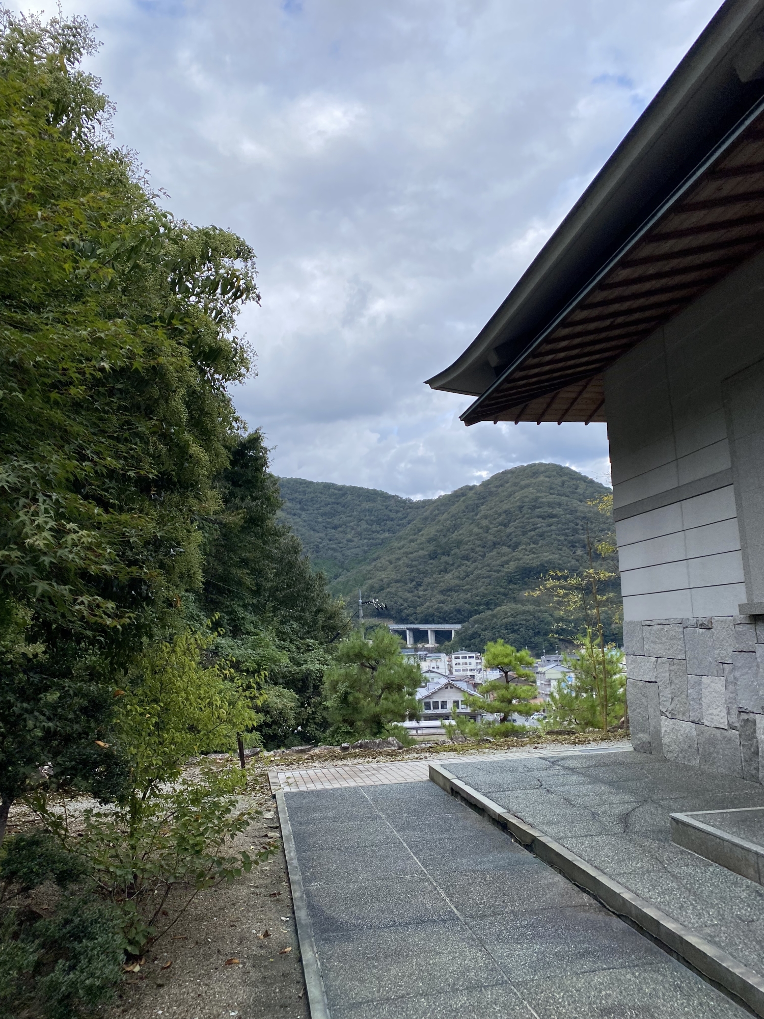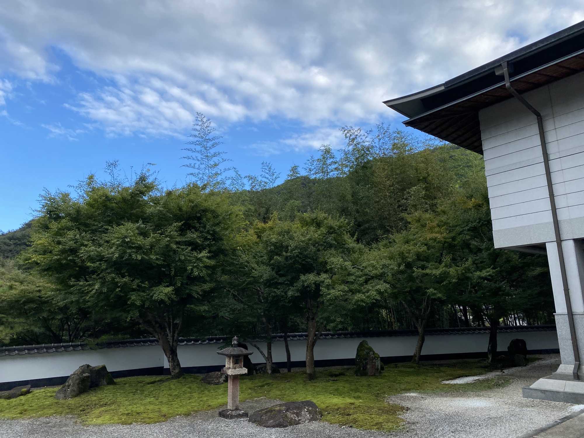 【中世新見庄名主屋敷跡に建つ美術館の外観は、中世風のイメージを表すために、入母屋・銅板葺きの屋根と、外観に石を使い、この地方の風土と歴史を盛り込んだ均整のとれた美しい姿をしています。】