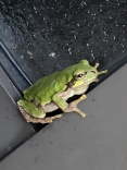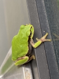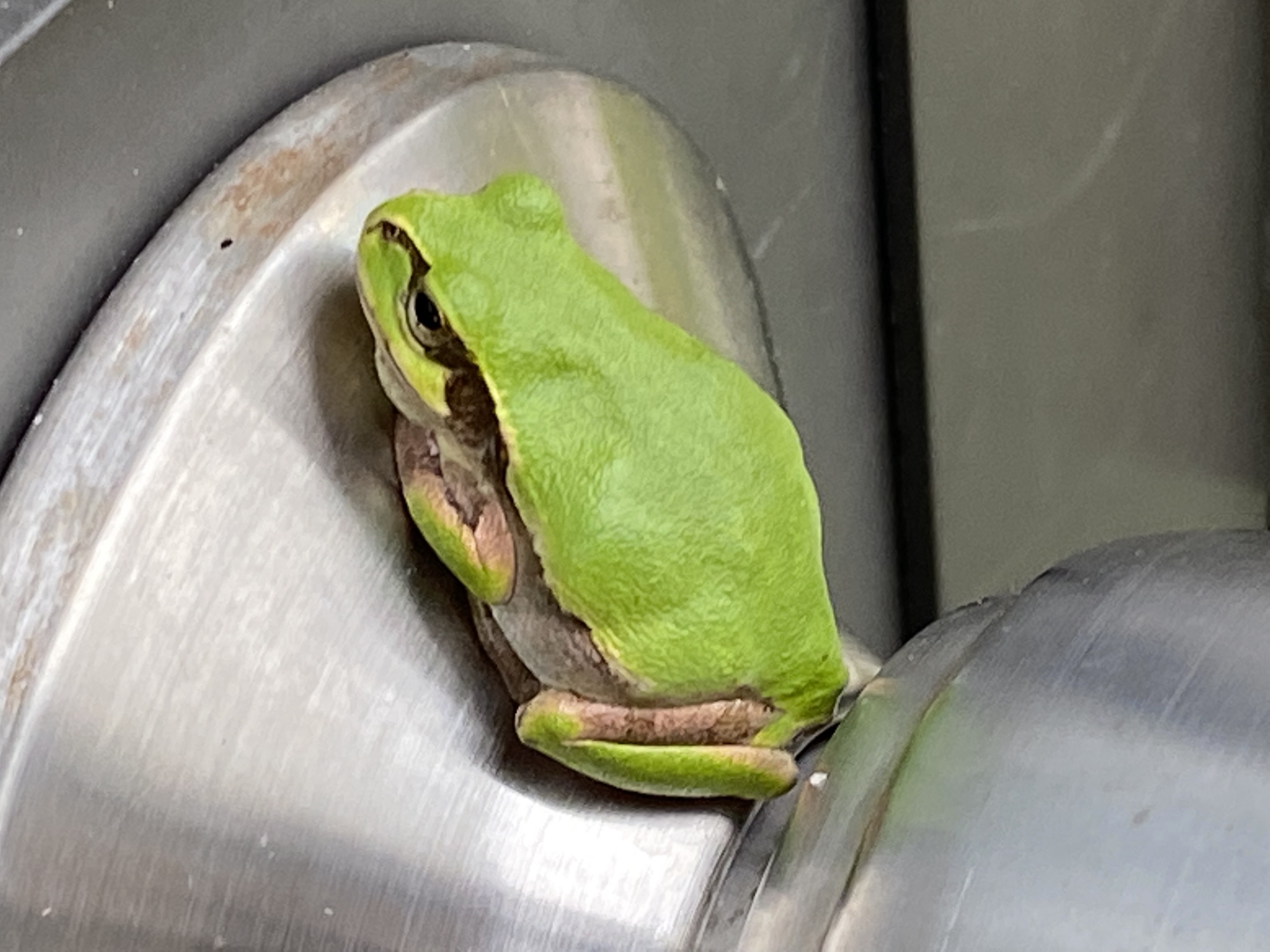 ガレージのドアノブに・・蛙~戻るまでずっと居た???