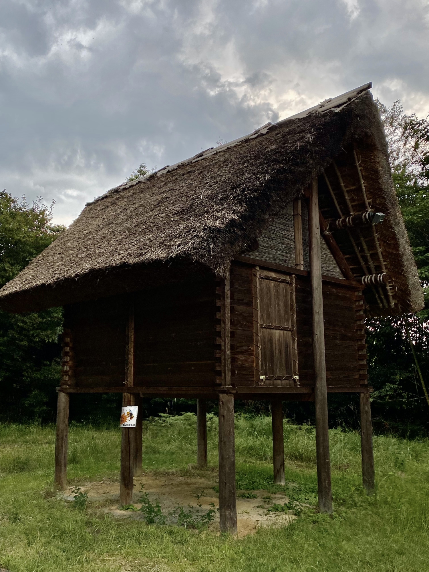 【沼弥生住居跡は、津山市沼地区の丘陵地にあります。この住居跡は、弥生時代中期の農耕社会の堅穴式住居と高床式倉庫などが復元された史跡公園となっております。】