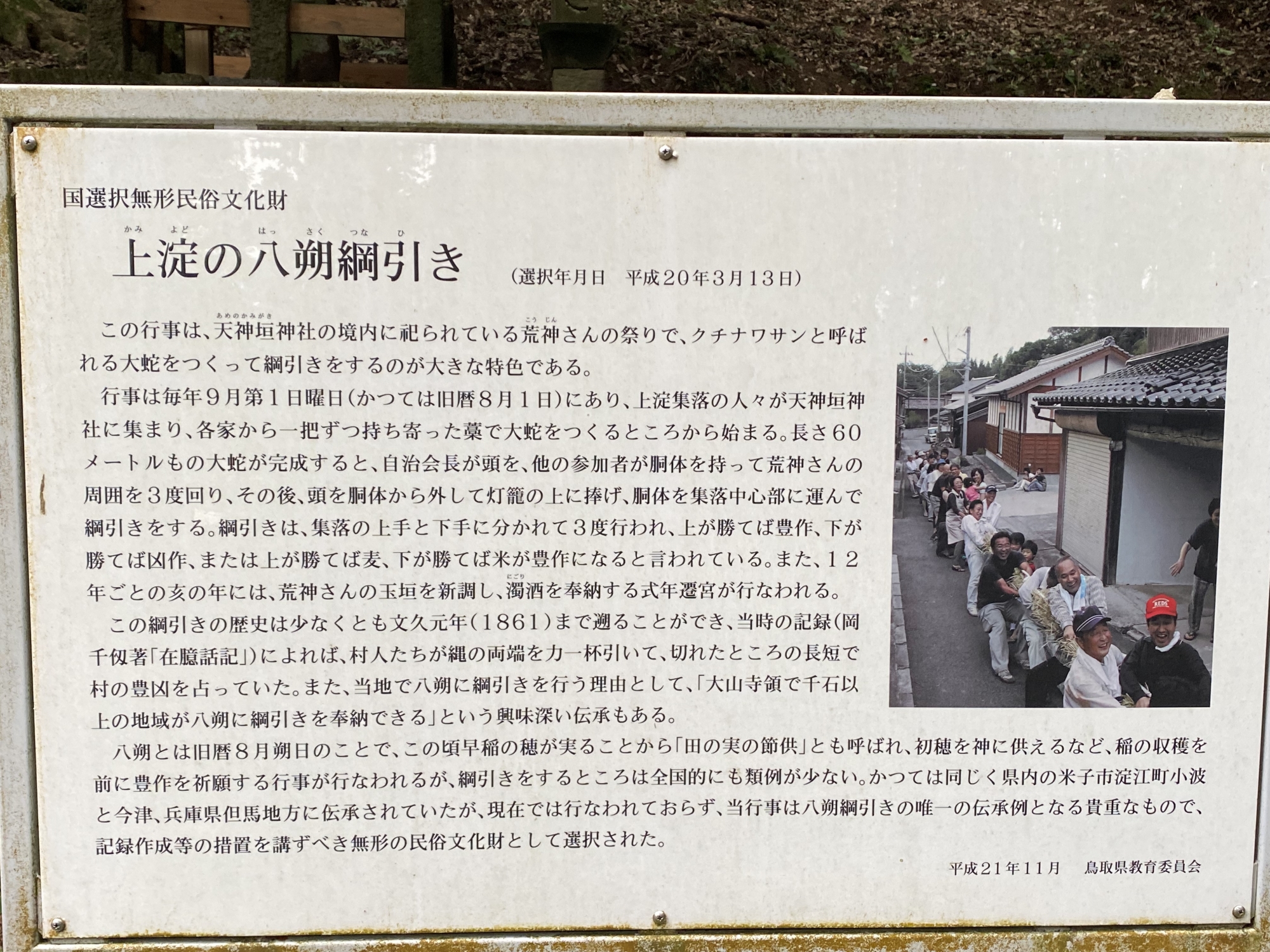 【また、この天神垣神社の境内に祀られる荒神さんの祭り「上淀の八朔綱引き」は、かつては旧暦8月1日に行われた収穫を感謝する儀礼で、長さ50メートル以上のワラで大蛇を作り、荒神さんの周りを回した後、蛇の胴体にあたる部分を使って集落内で綱引きをし、奉納する伝承があり、国の記録作成等の措置を講ずべき無形民俗文化財として指定されています。】