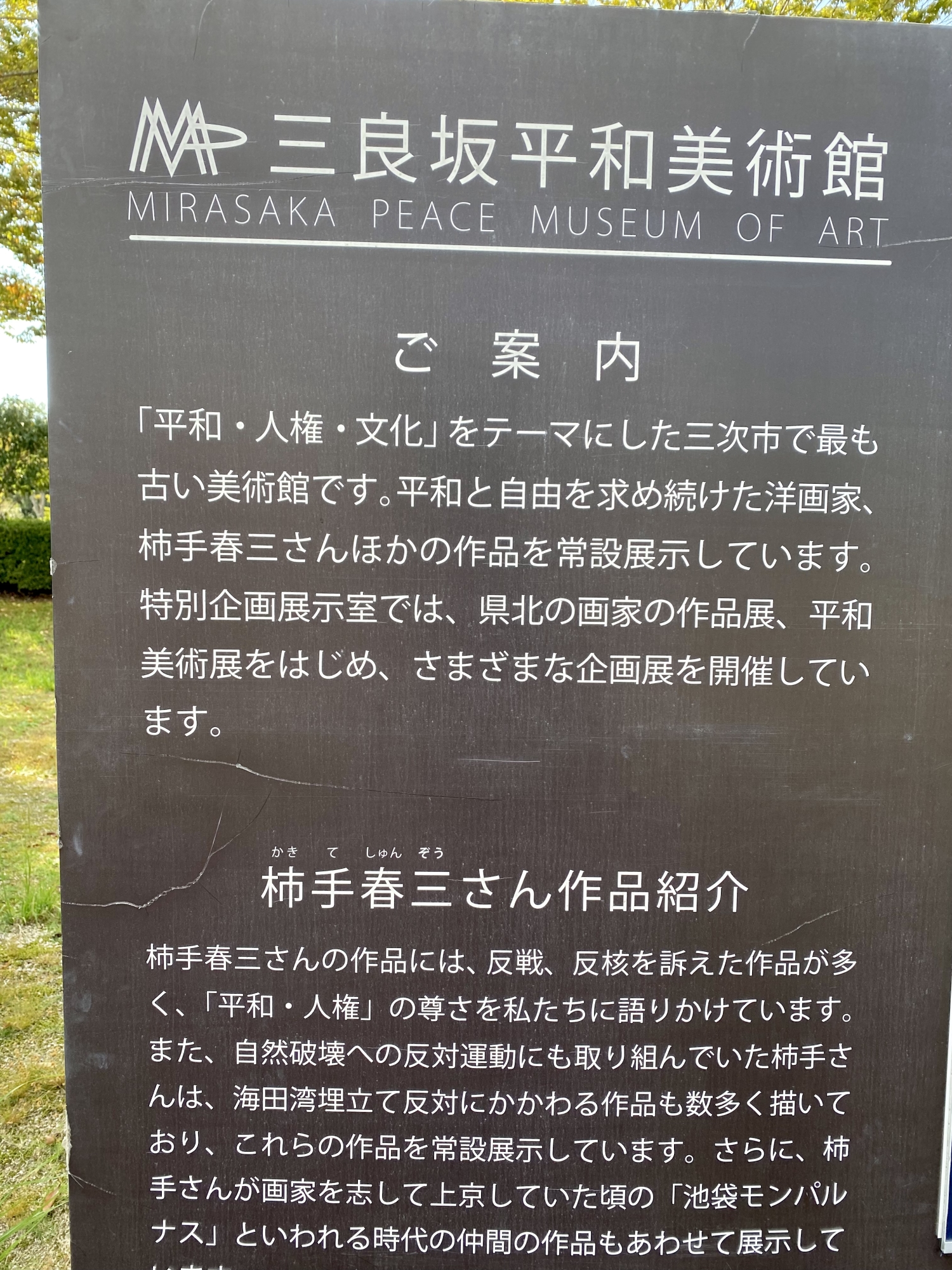 【「平和・人権・文化」をテーマにした三次市で最も古い美術館です。平和と自由を求め続けた洋画家、柿手春三(かきてしゅんぞう)さんほかの作品を常設展示しています。特別企画展示室では、県北の画家の作品展、平和美術展をはじめ、さまざまな企画展を開催しています。】