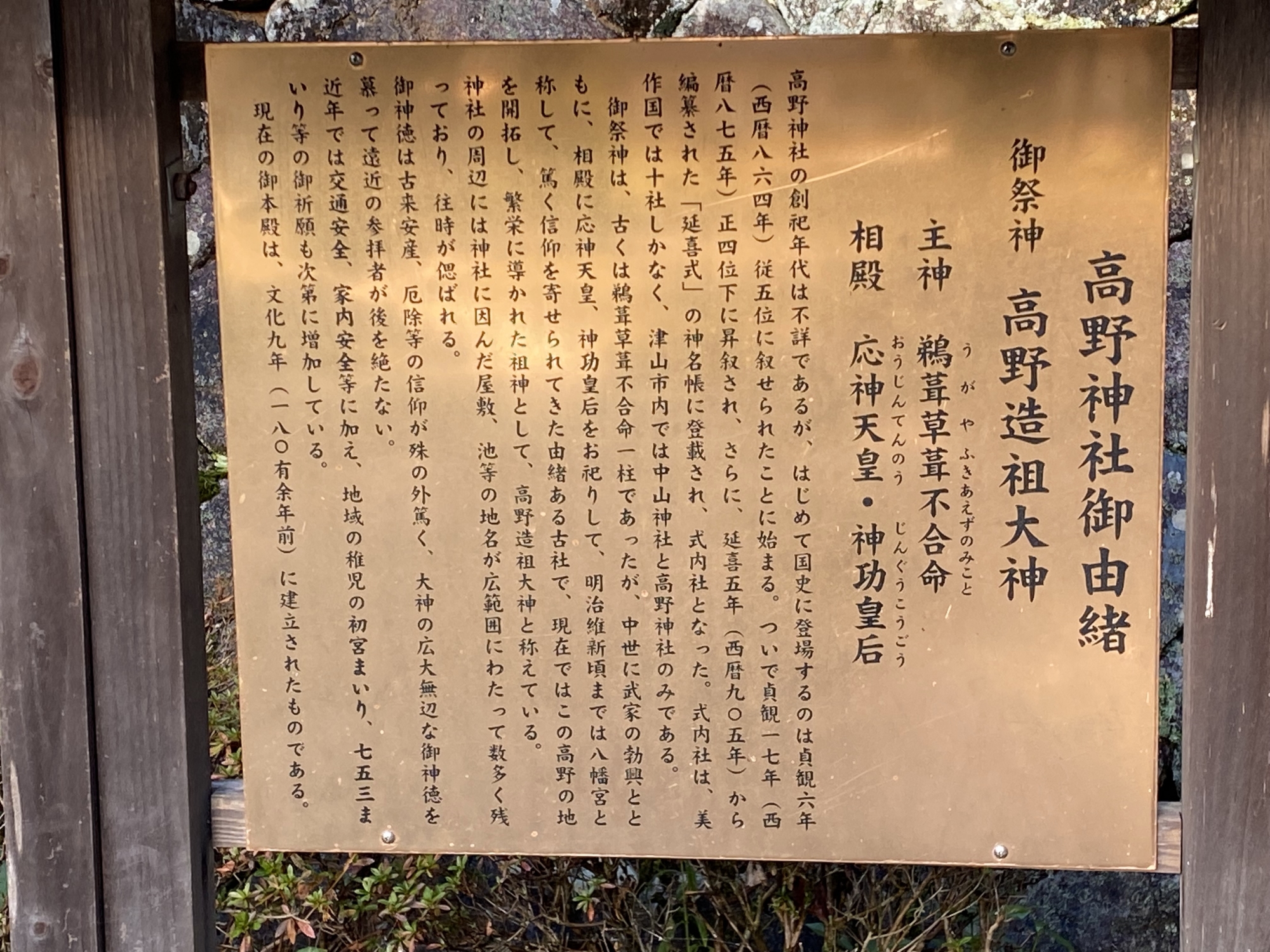 【御祭神は、高野造祖大神と申し上げ古くは鵜葺草葺不合神1柱であったが、中世に武家の勃興とともに、相殿に応神天皇、神宮皇后をお祀りして明治維新頃までは八幡宮と称して篤い信仰を寄せられてきた由緒ある古社で、今もなお広大無辺な御神徳を慕って遠近からの崇敬者の参拝が後を絶たない。】