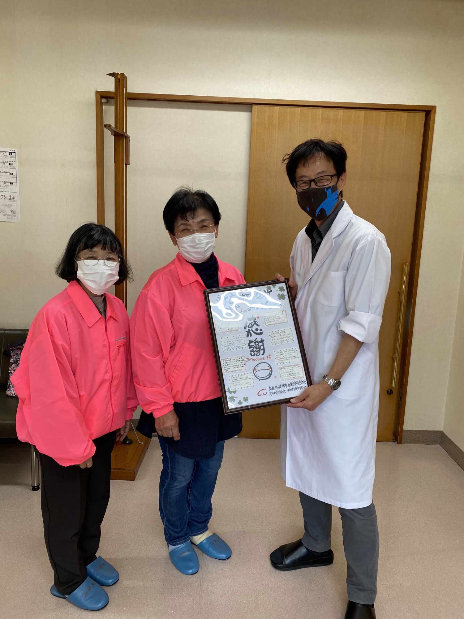 今日は、真庭市の愛育委員の方が感謝状をお届けくださいました。村の広報誌用にも写真を・・って感じです。