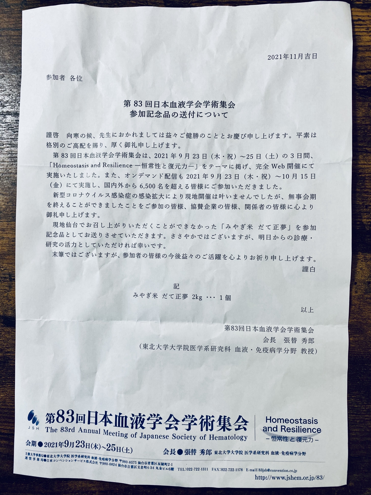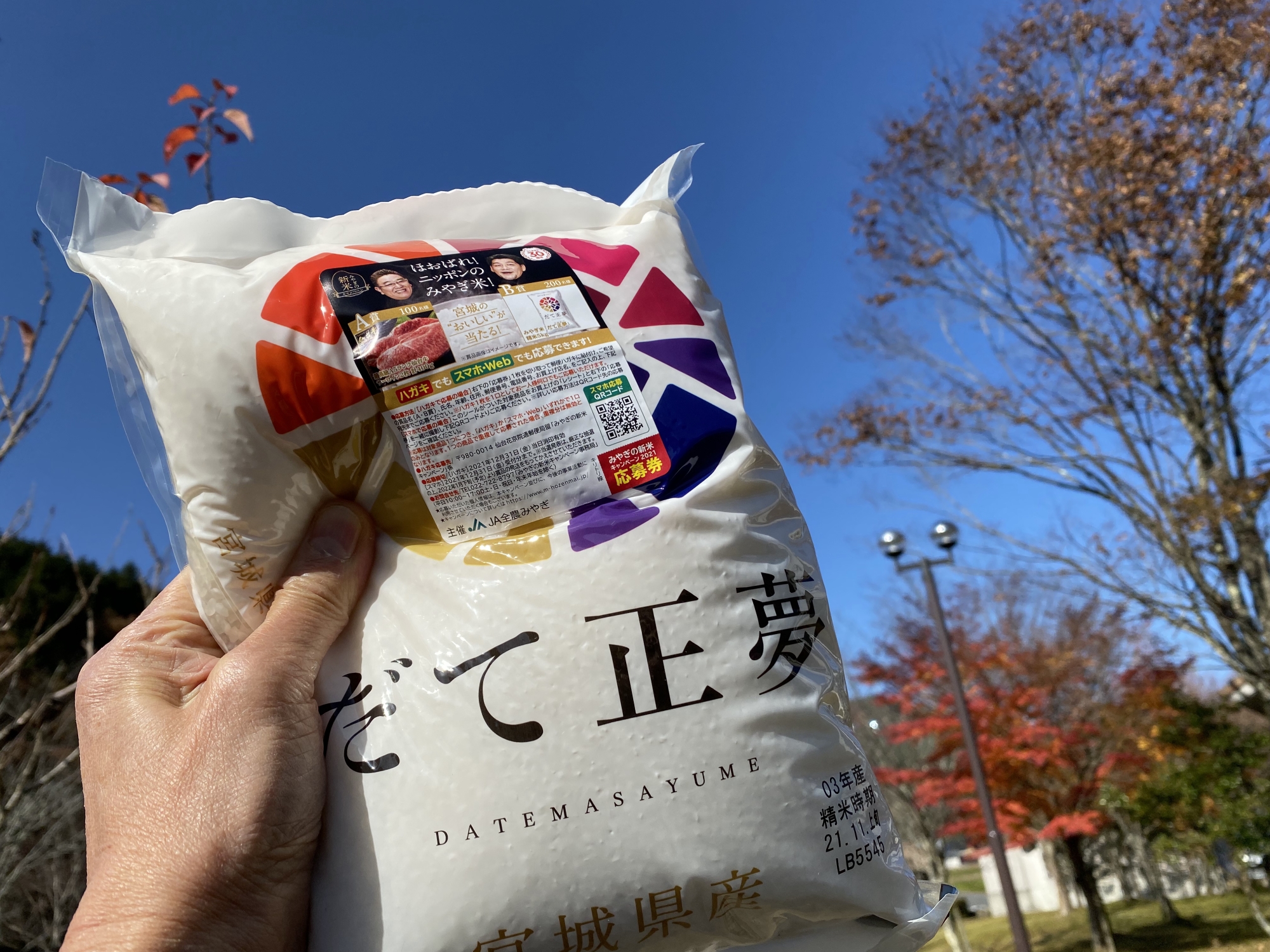 さて、昼間・・先月の日本血液学会・・・参加賞で、東北大の先生が会長でもあったので・・・なんと、「だて正夢」というお米が届きました。