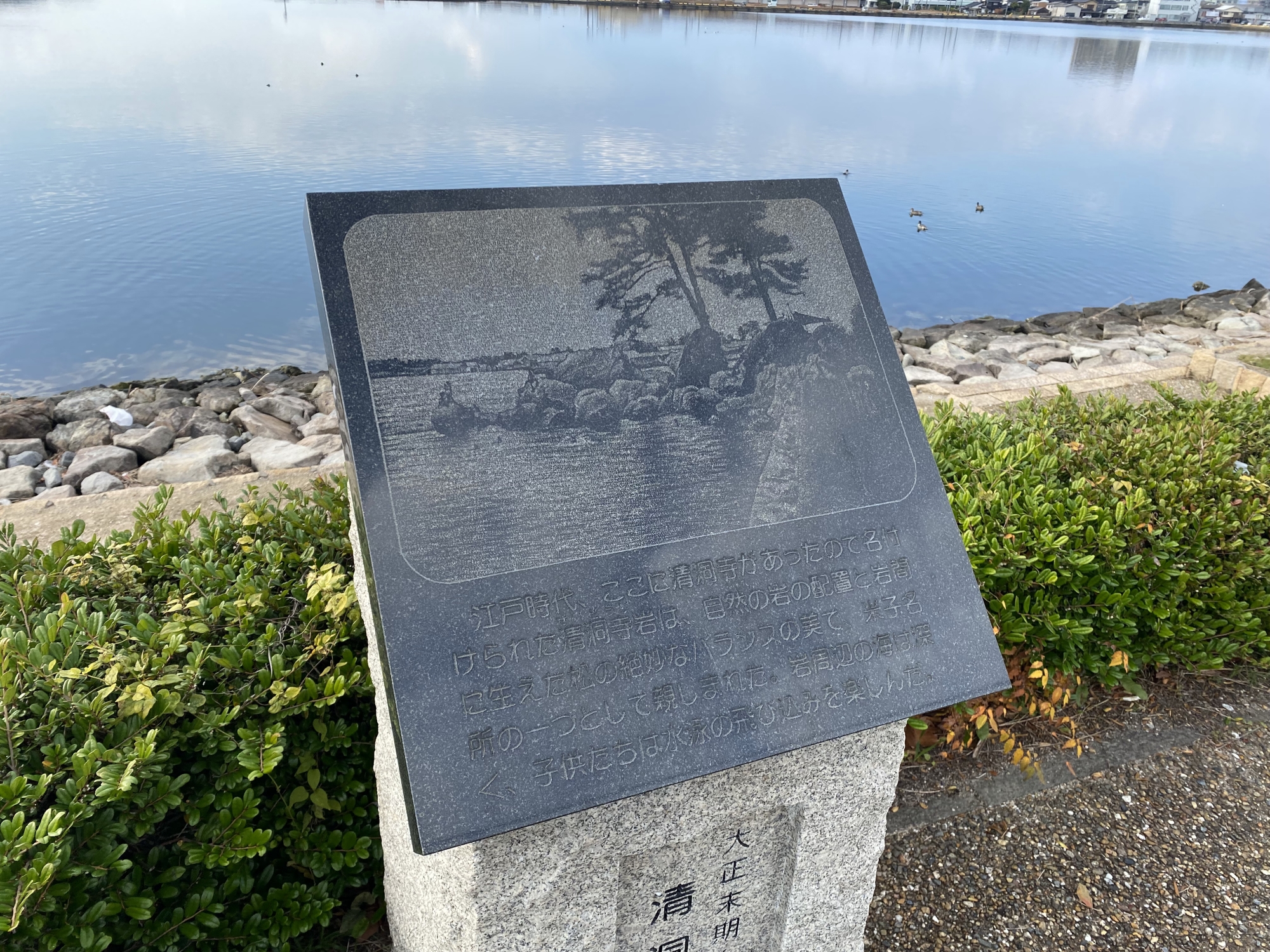 【海禅寺はその後、禅源寺と改められ、宝永7年(1710)博労町に移され了春寺となりました。亀島にはその後、米子城を預かる荒尾氏の家臣村河氏が江尾から清洞寺を移して菩提寺としたので、この島が清洞寺岩と呼ばれるようになりました。】