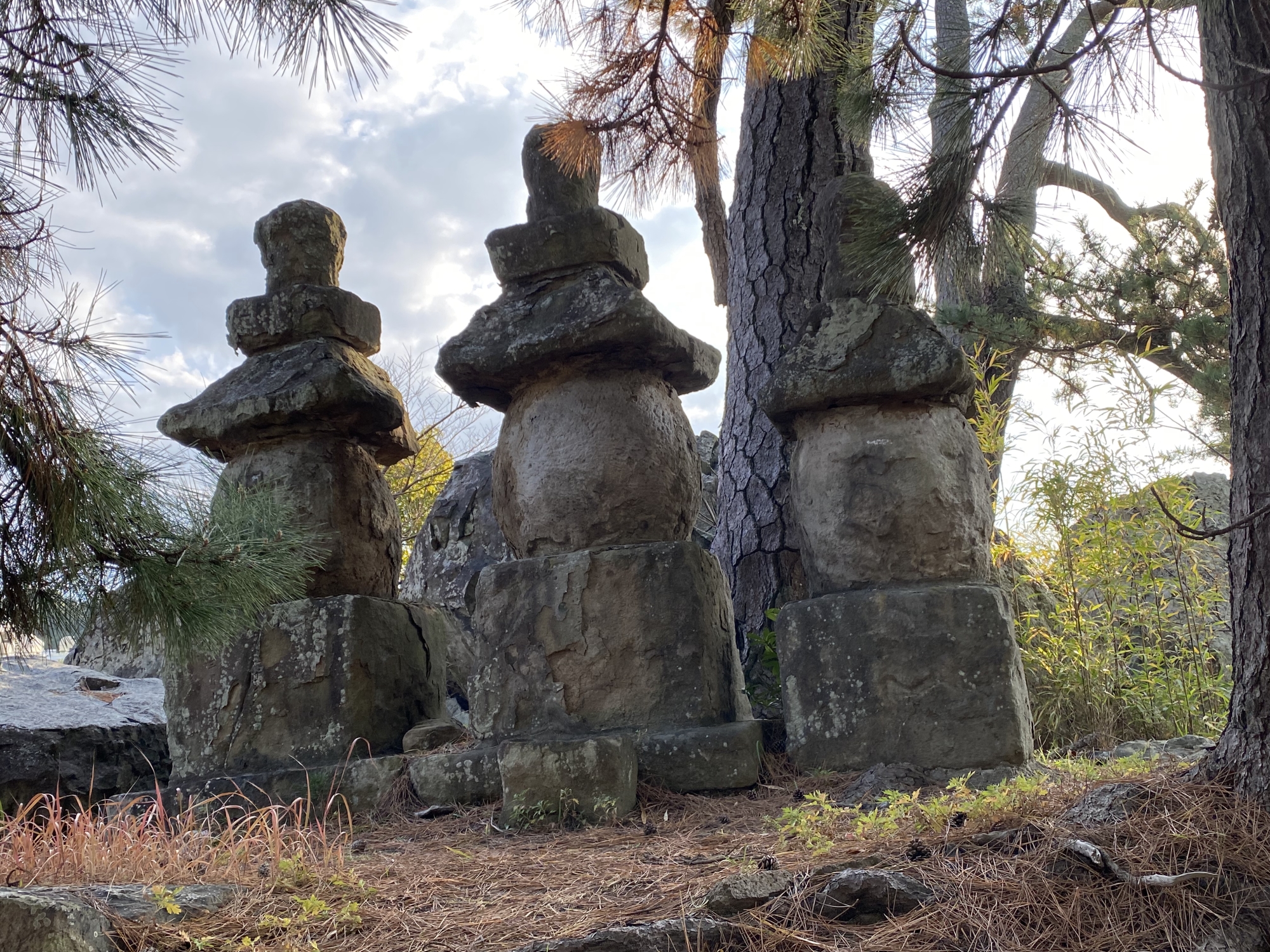 【米子城主加藤貞泰が父光泰の菩提を弔うため、この島に曹渓院を建て、供養の五輪塔を作り(向かって右)、元和3年(1617)池田由成が城主になると、由成は父母の供養のため、海禅寺を建立し2基の五輪塔を作りました。左が父由之のもので中央は母のものです。】