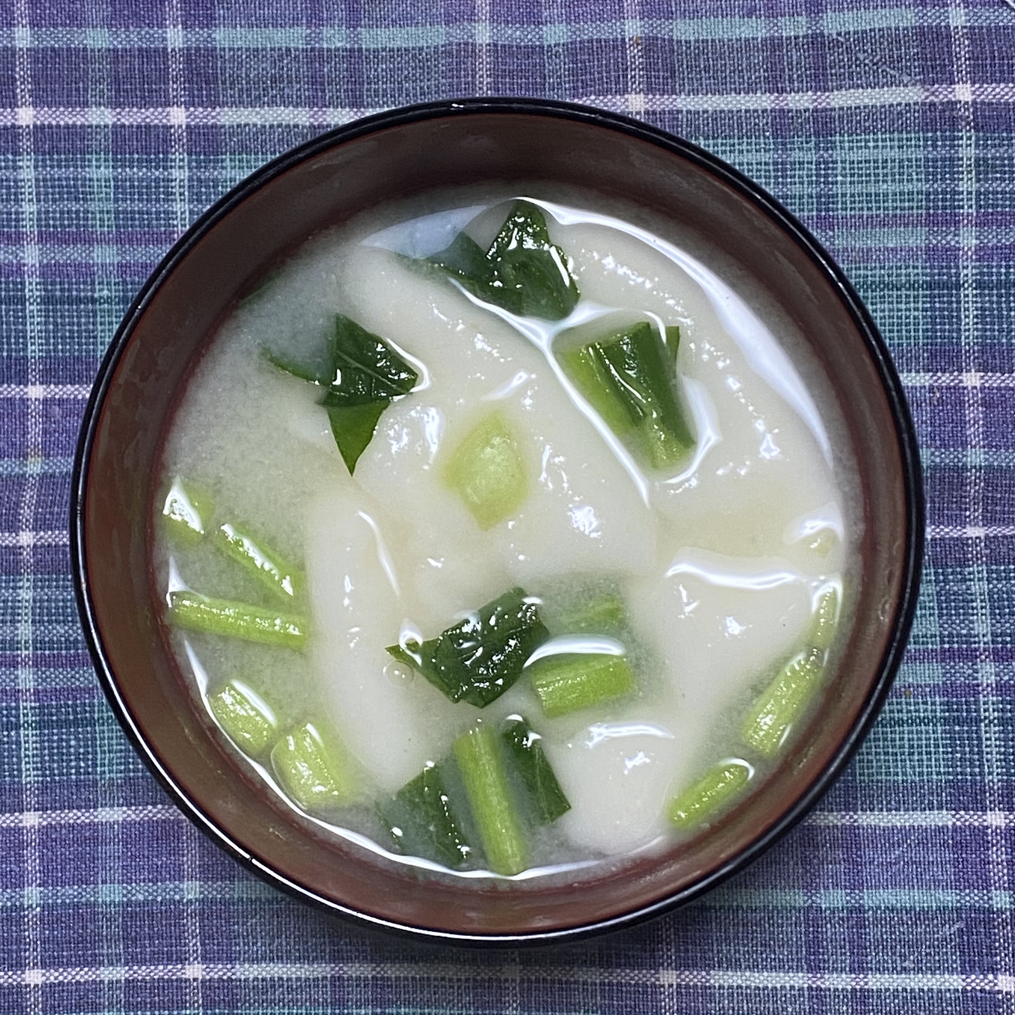 その後で、お雑煮・・・白味噌で、普段は、餅のみなんですが、今日は、菜っ葉を入れました。