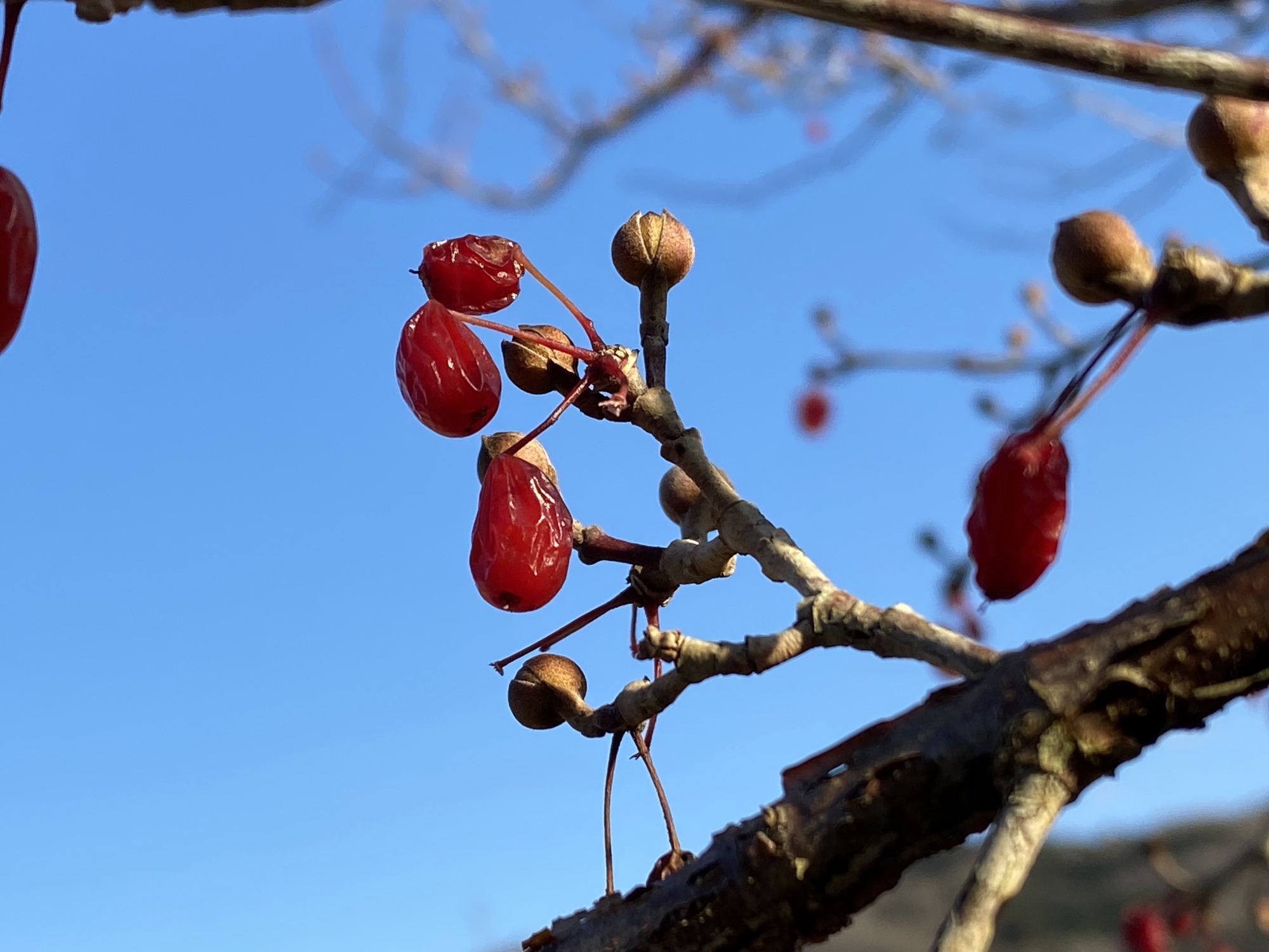 【サンシュユは、ミズキ科ミズキ属の落葉小高木。中国原産で、春先に葉が出る前に黄色い花を咲かせ、秋にグミに似た赤い実をつける。別名でハルコガネバナ、アキサンゴ、ヤマグミとも呼ばれる。】