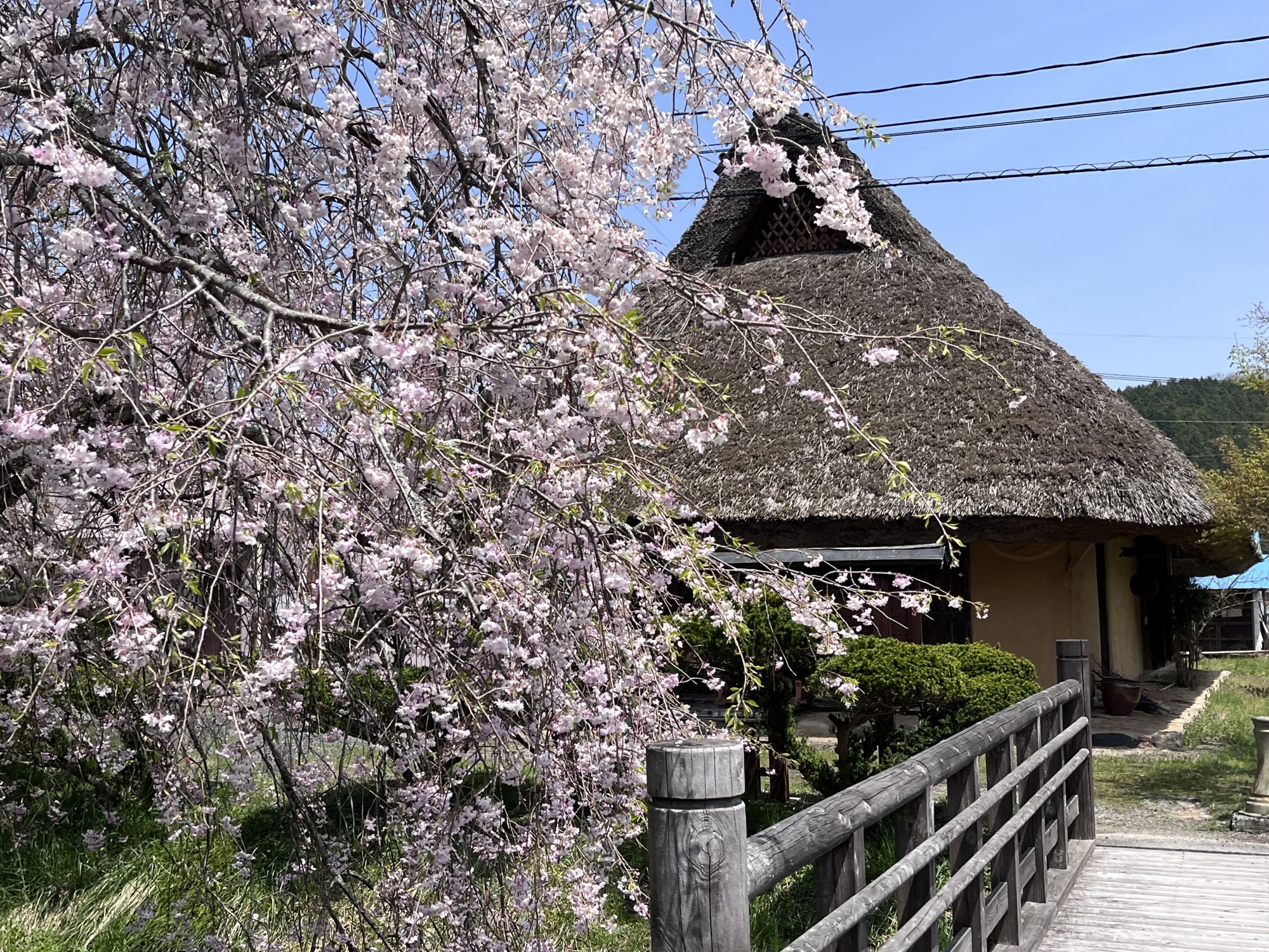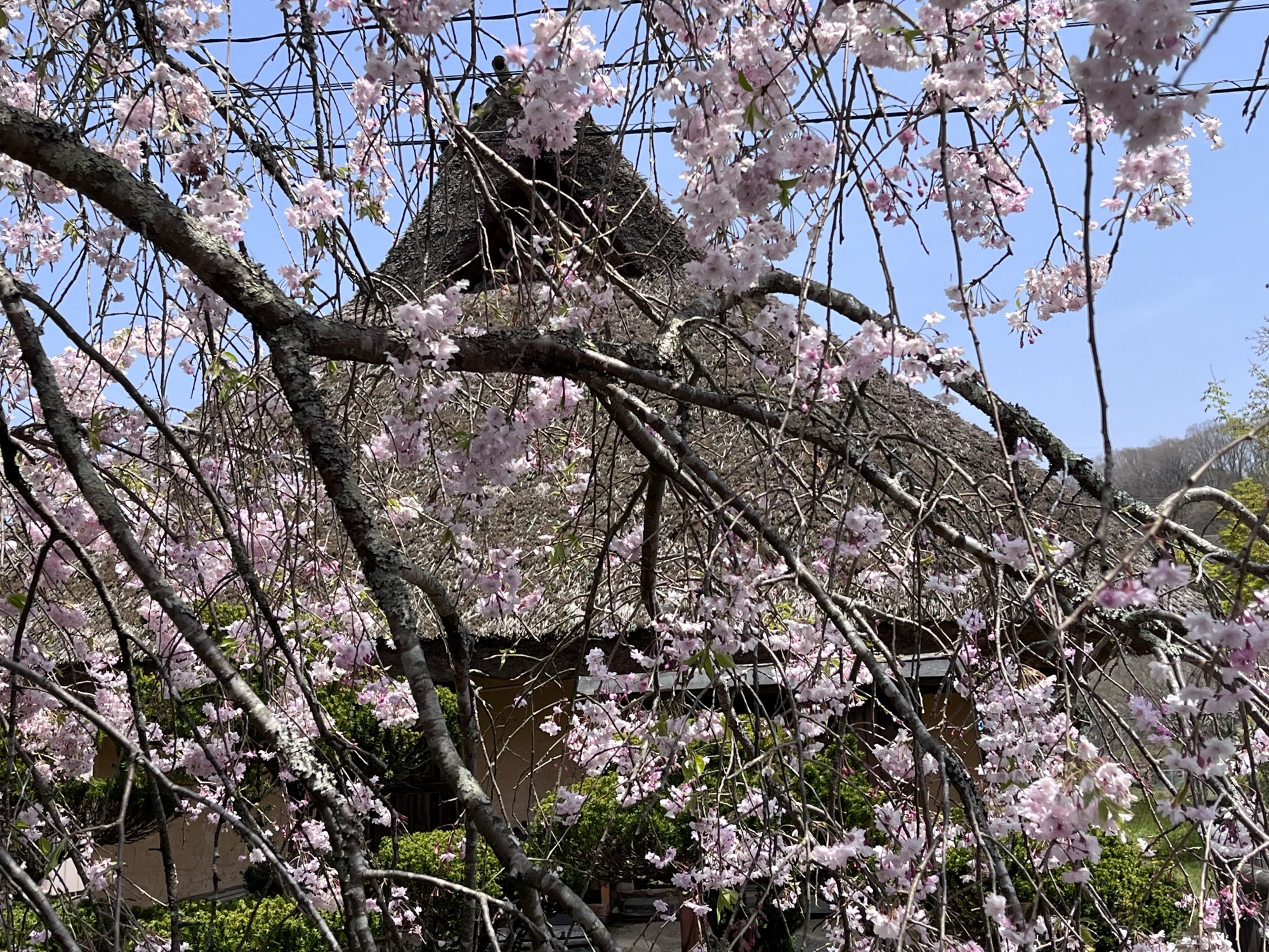 背景は茅葺屋根。