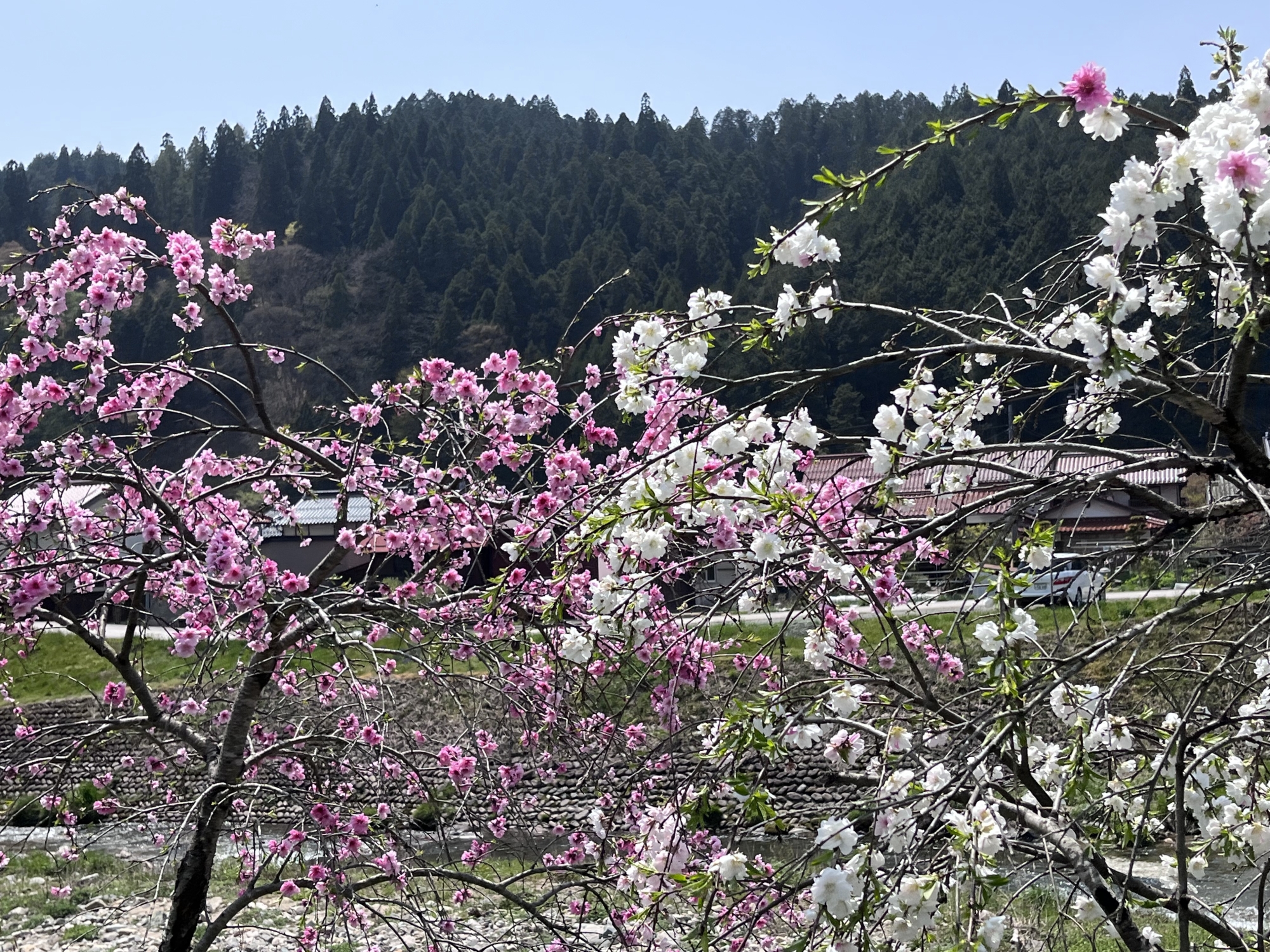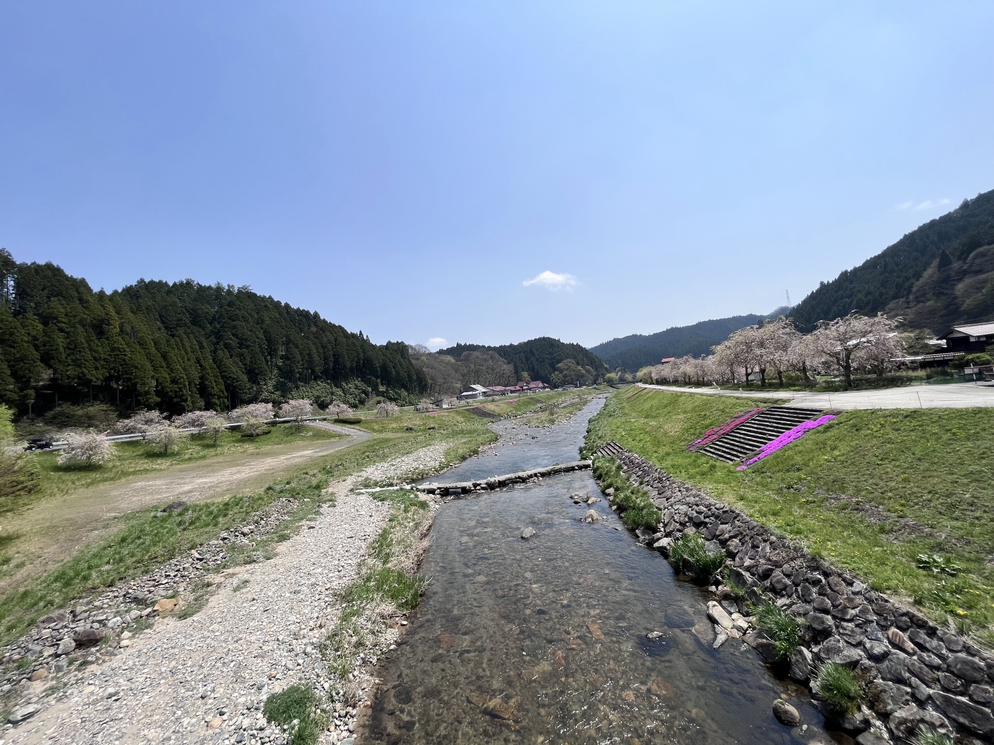 あら、白い芝桜?・・・そして、対岸から・・・芝桜と枝垂れ桜。