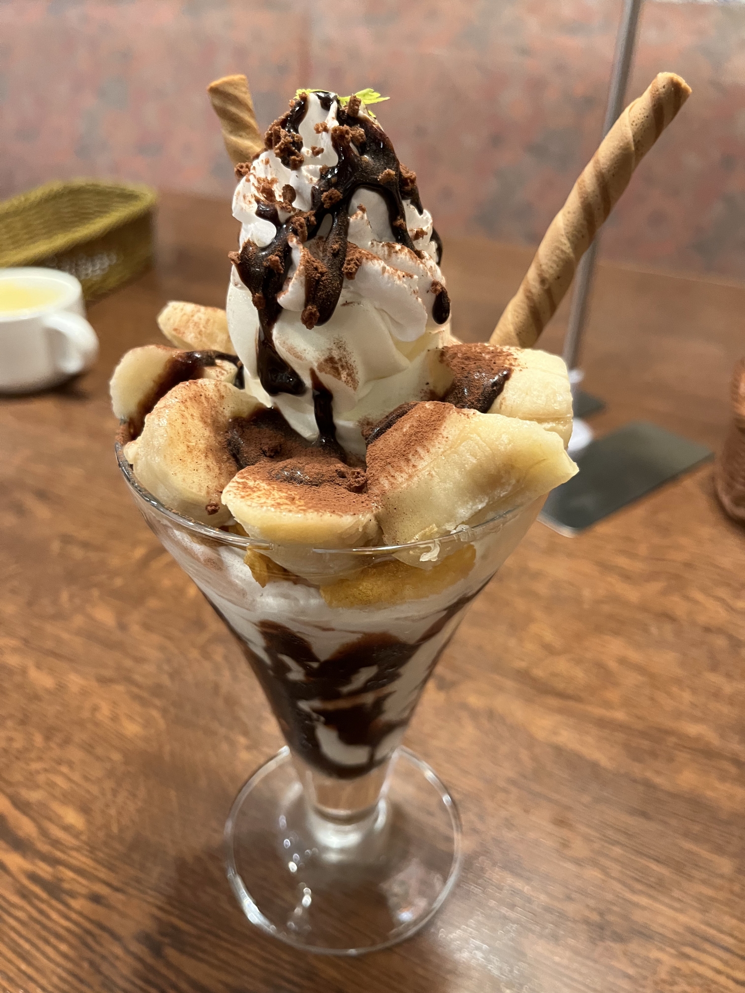 石焼煮込みデミハンバーグとサラダ。セットでスープと黒カレー。お腹一杯でも、最後に、チョコバナナパフェ。美味しい。