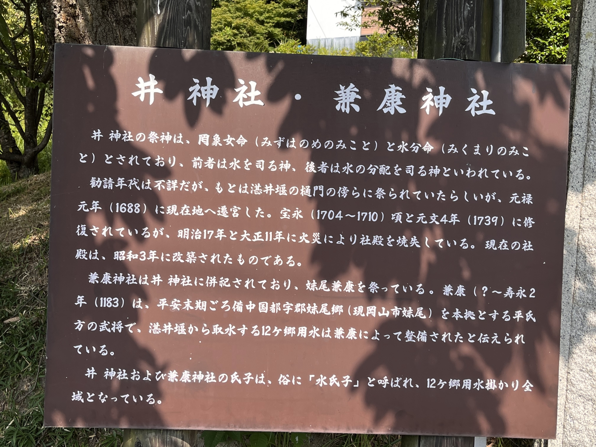 【これにより、井神社の氏子は、地元氏子の外に、農業用水を利用する氏子「水氏子」で構成されている。妹尾兼康の偉業を讃え、恩恵に感謝して、井神社、兼康神社として合わせ祀るようになった。】