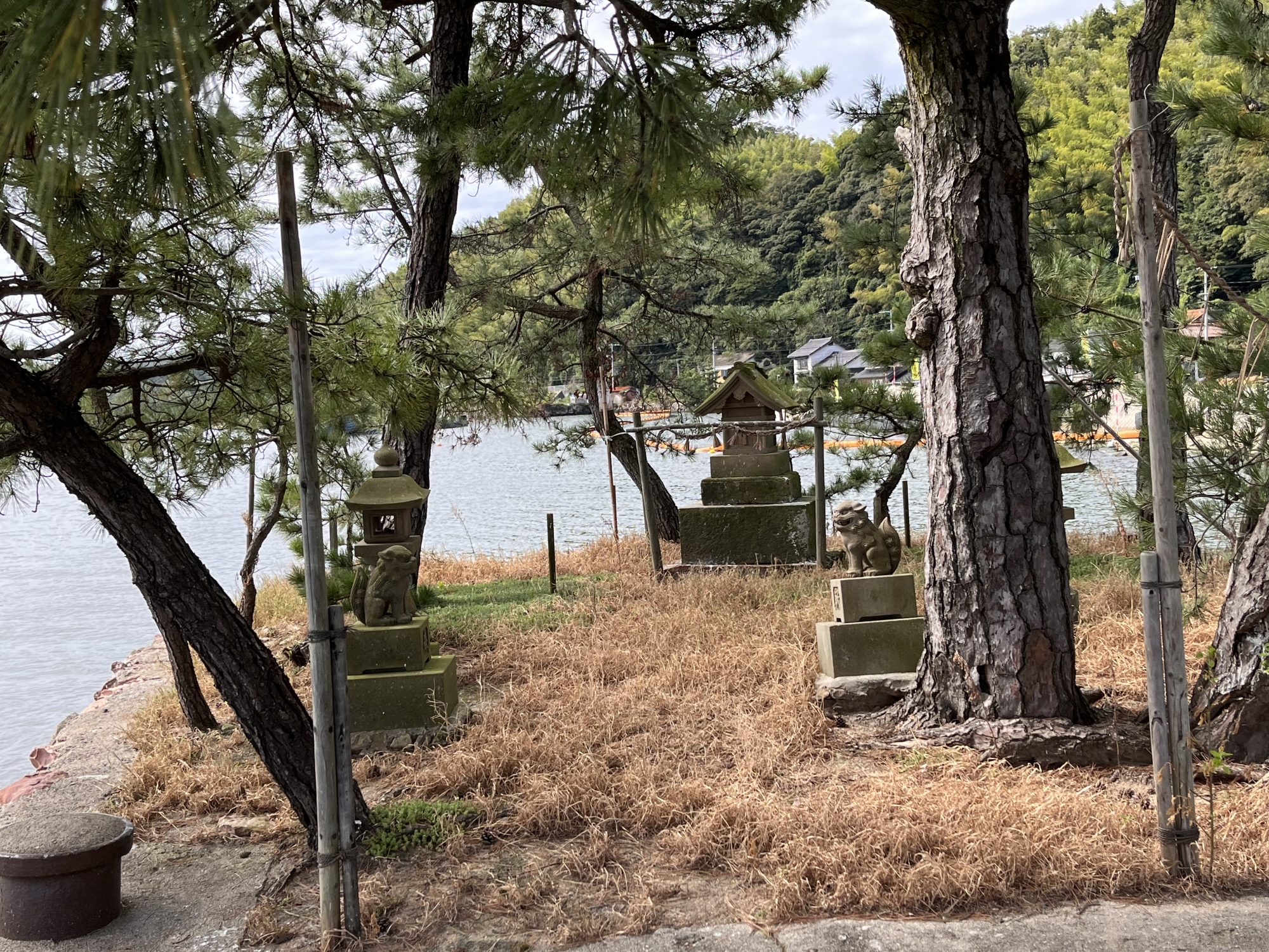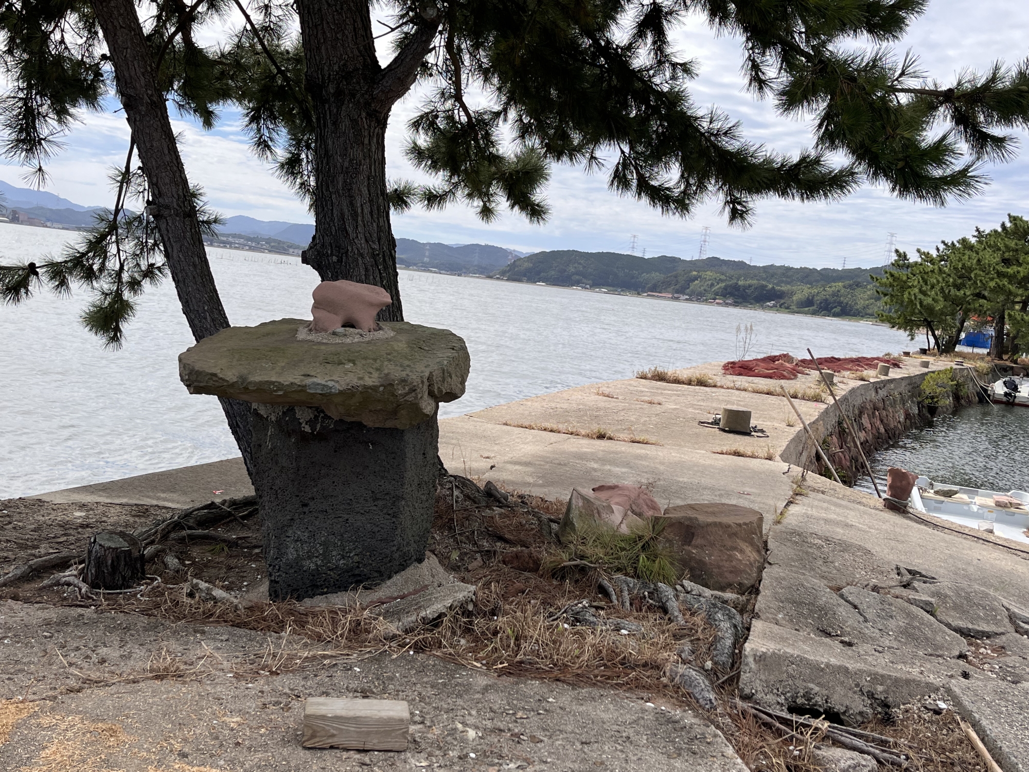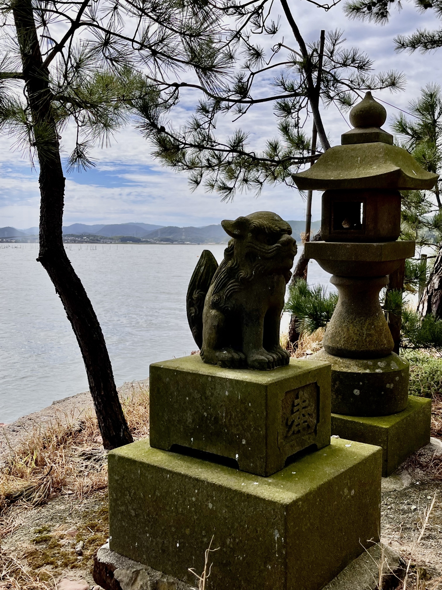 【『朝酌郷土誌』によると、この大海崎漁港のことを「間の内」と呼ぶそうで防波堤の突先に数本の松の木が立ち、その間に小さな石祠と一対の狛犬がたっていた。】