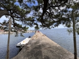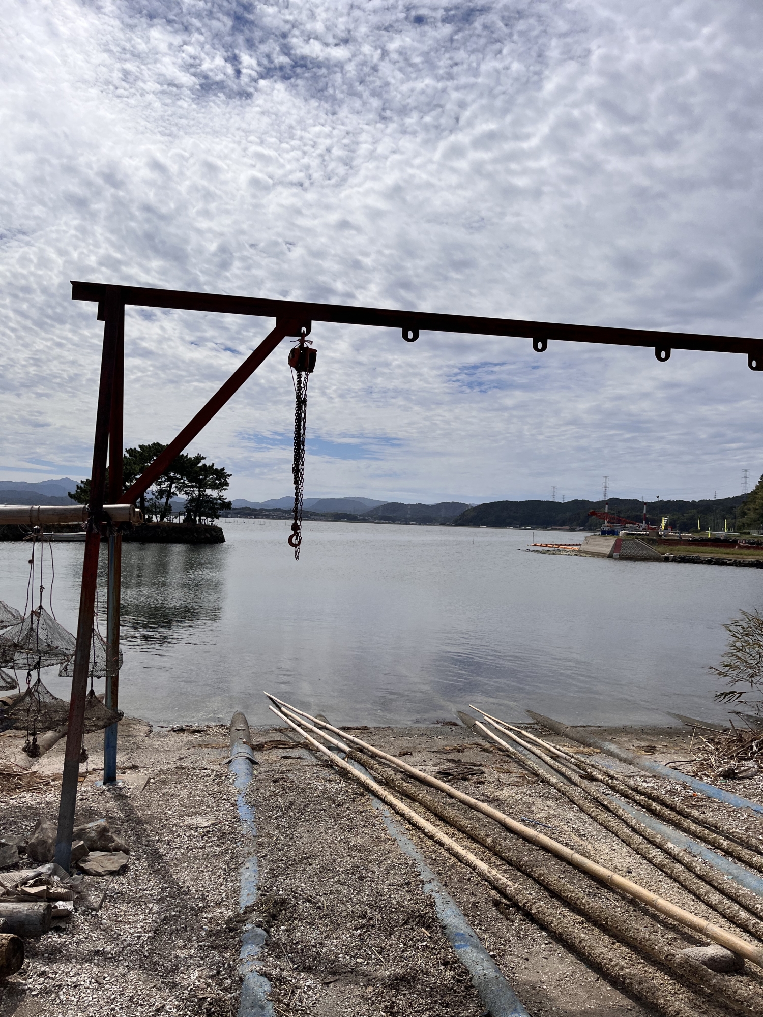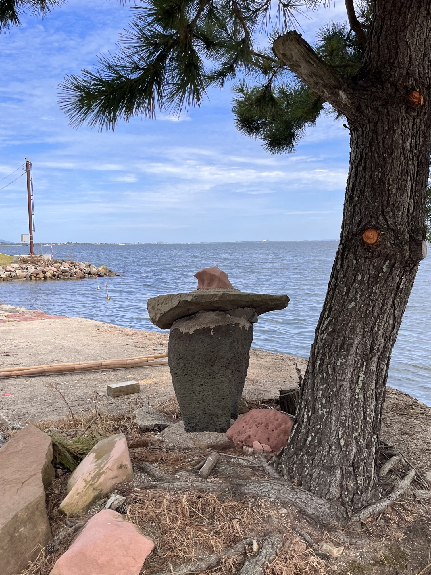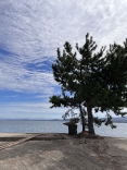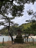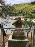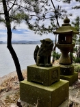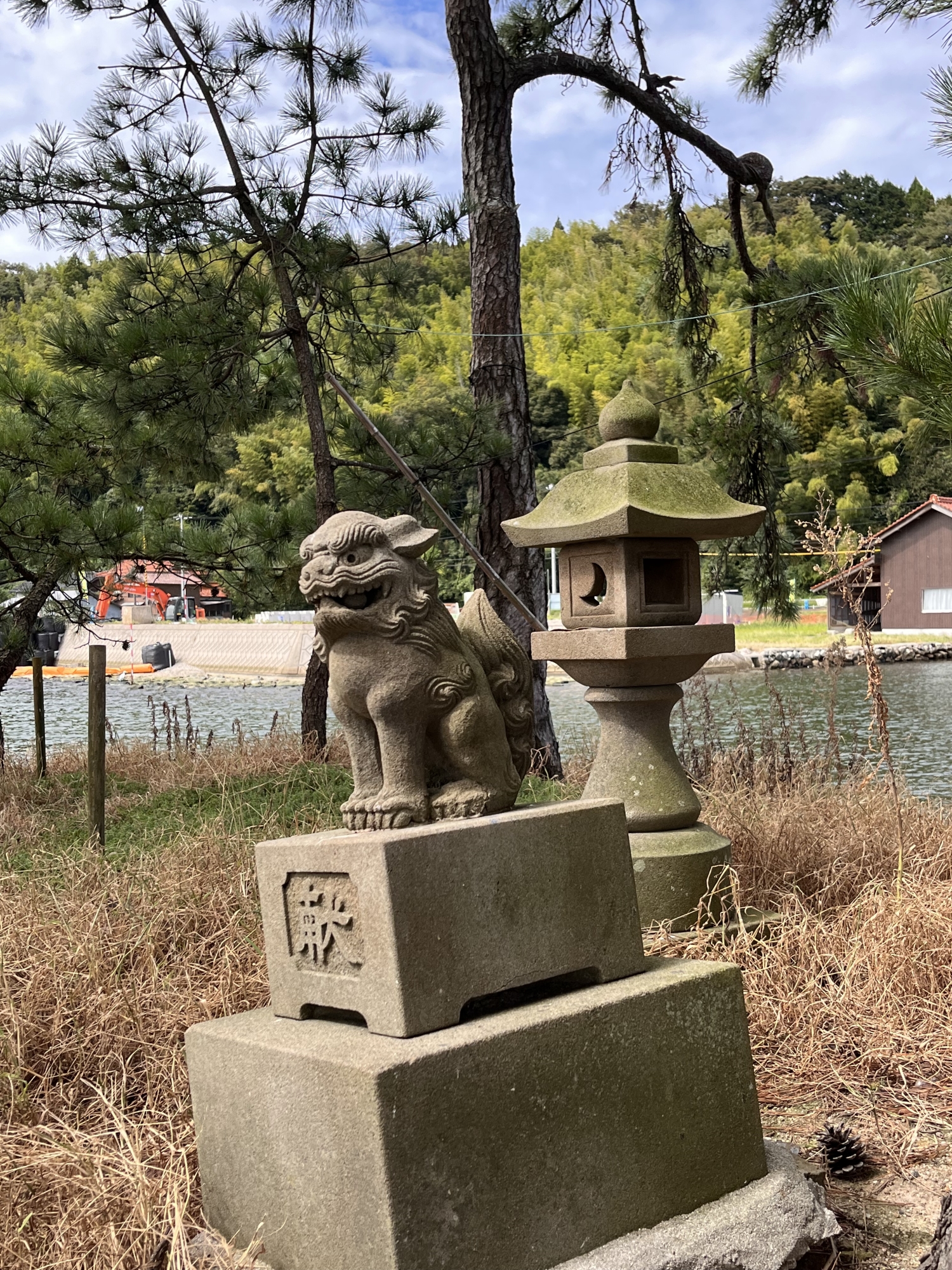 【『朝酌郷土誌』によると、この大海崎漁港のことを「間の内」と呼ぶそうで防波堤の突先に数本の松の木が立ち、その間に小さな石祠と一対の狛犬がたっていた。】