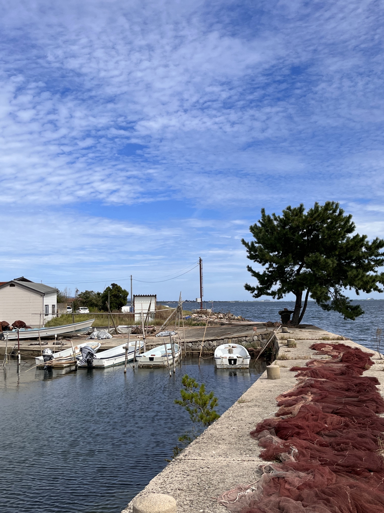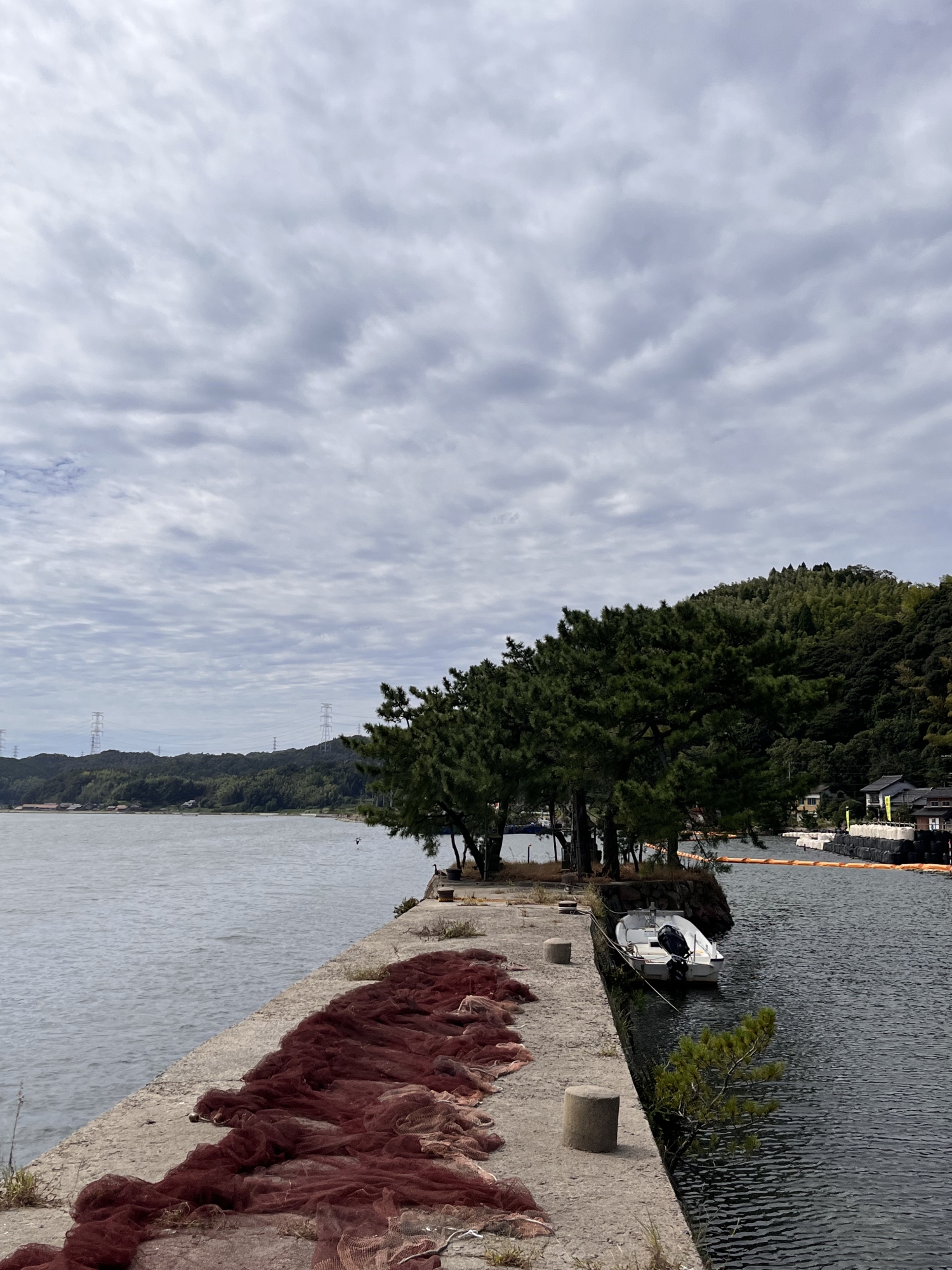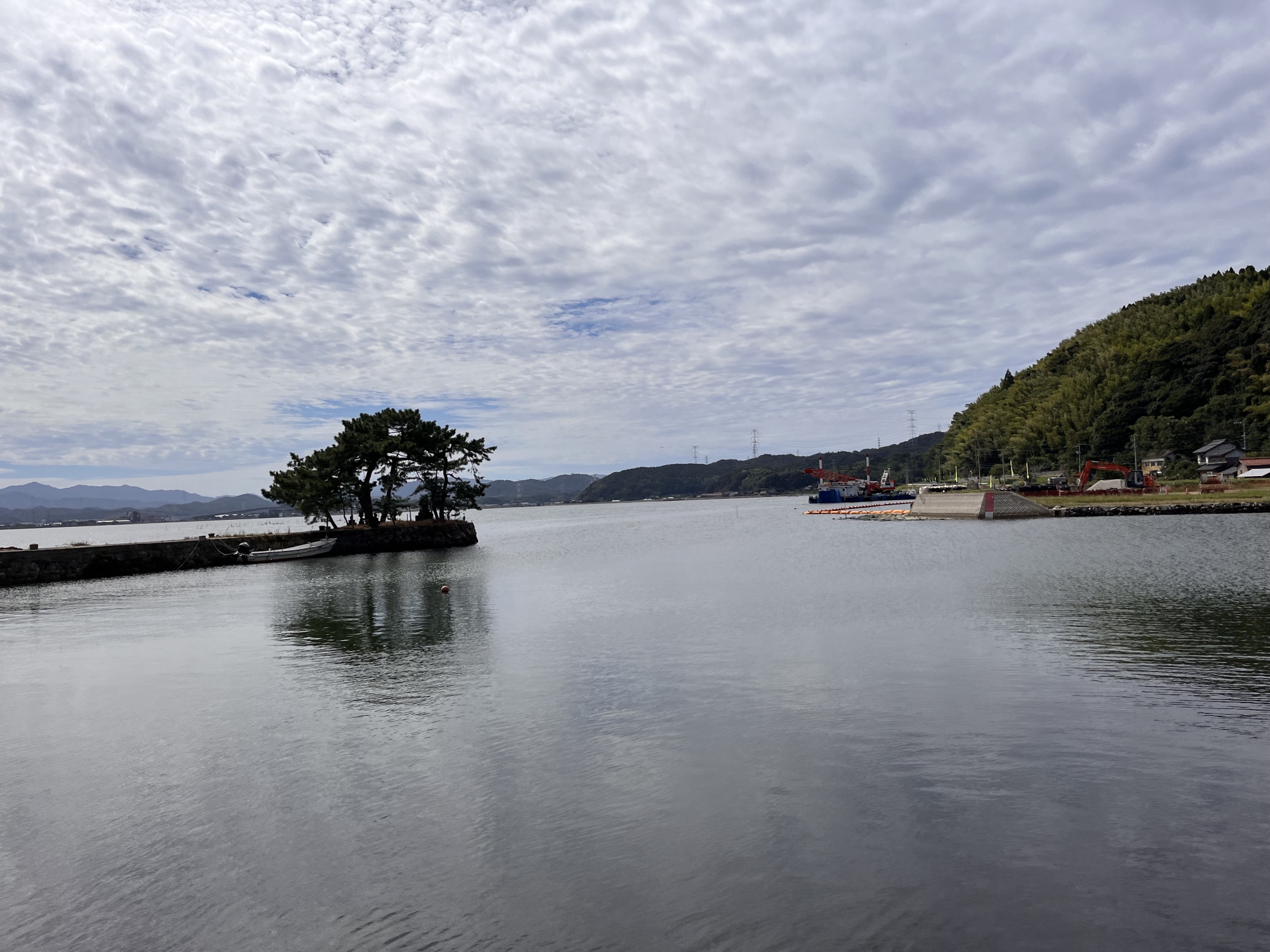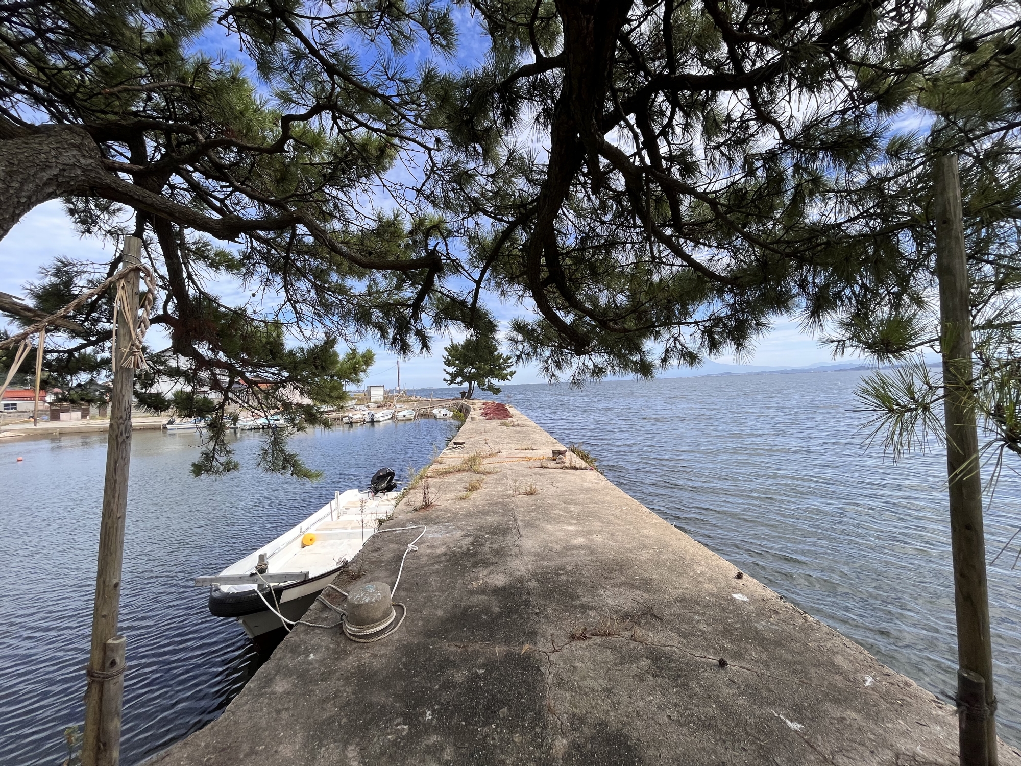 【大海崎集落の中央、山手に登れば十二所神社があり、車を脇に止めて中海側に曲がるとすぐ奥に漁港が見える。】