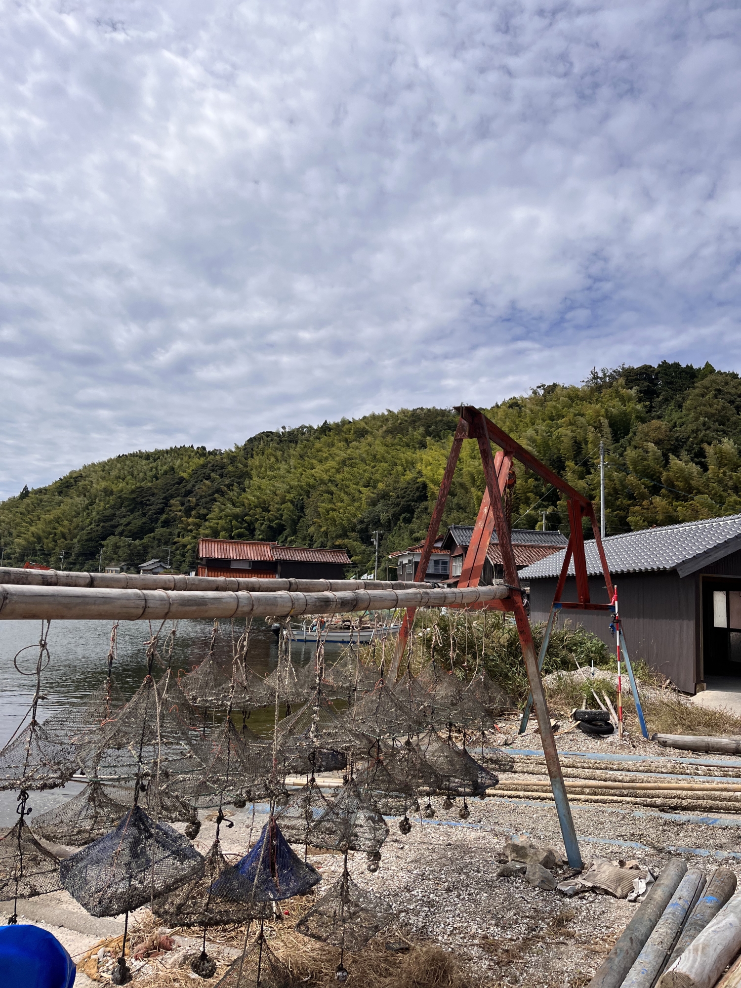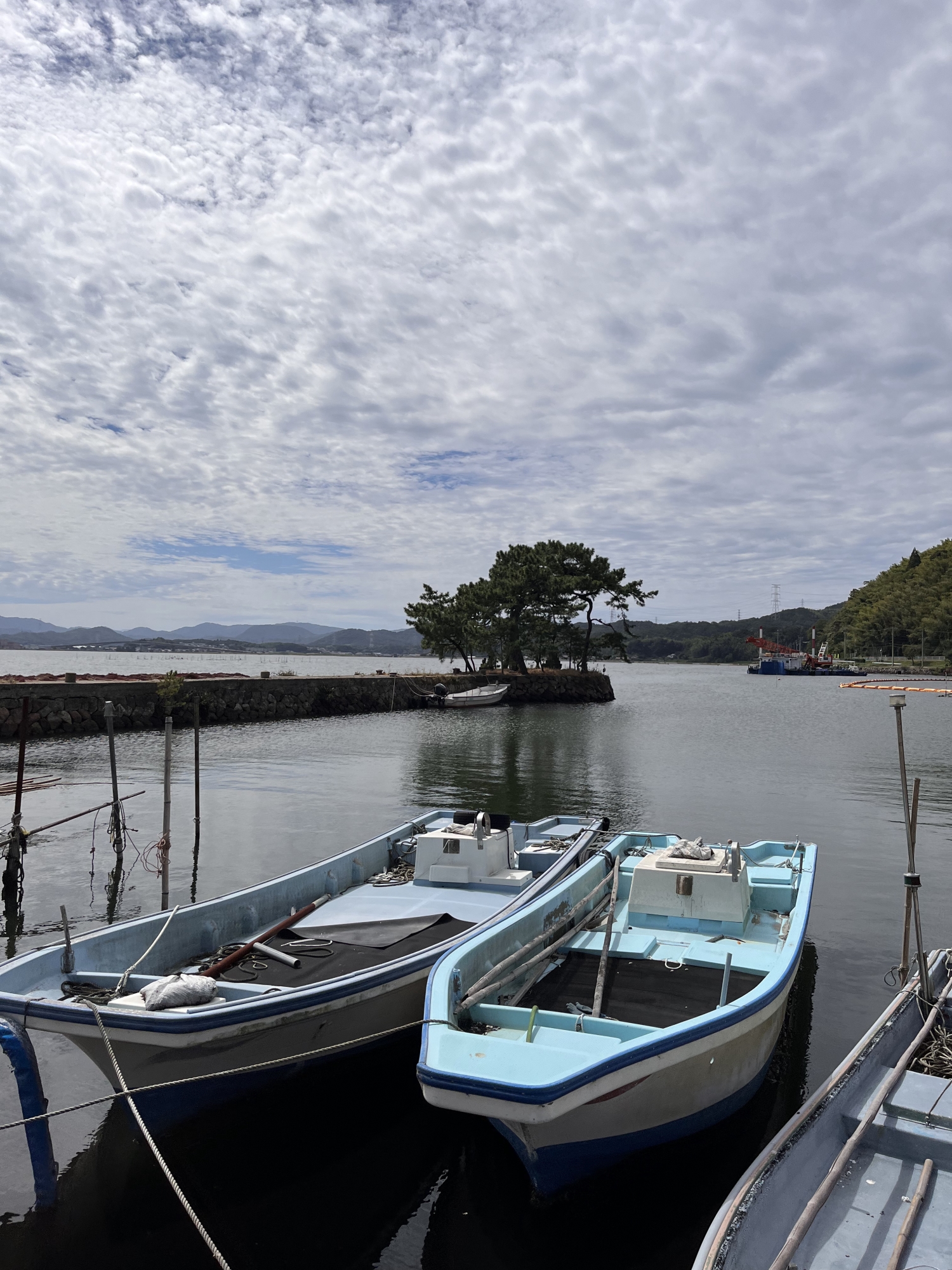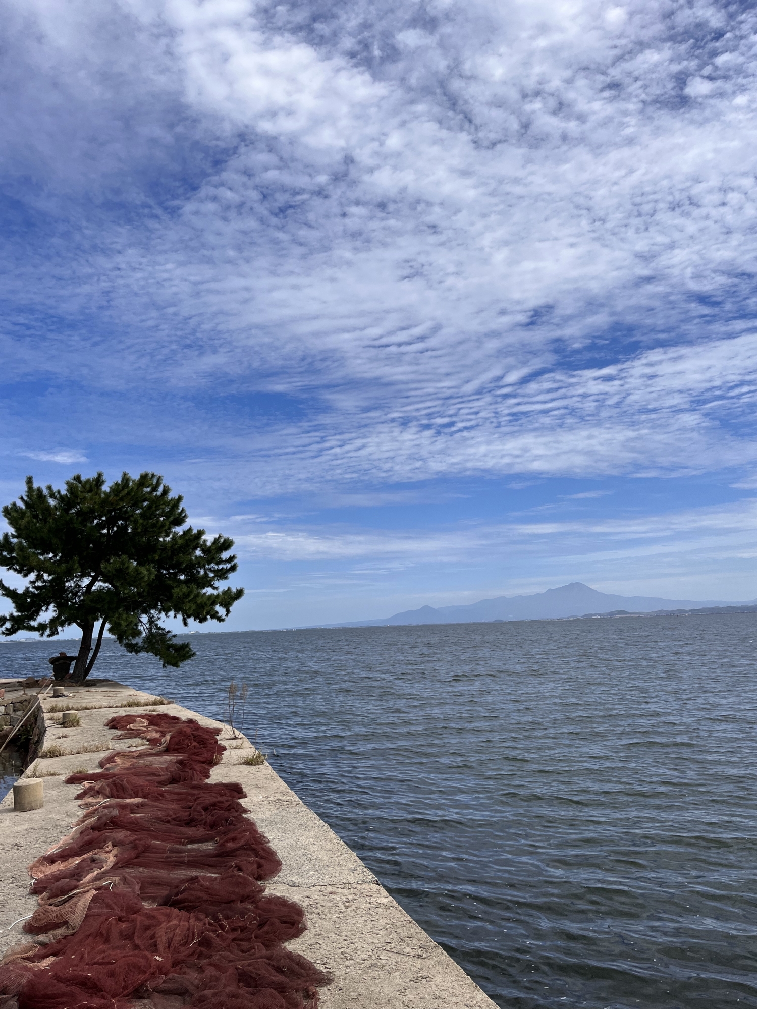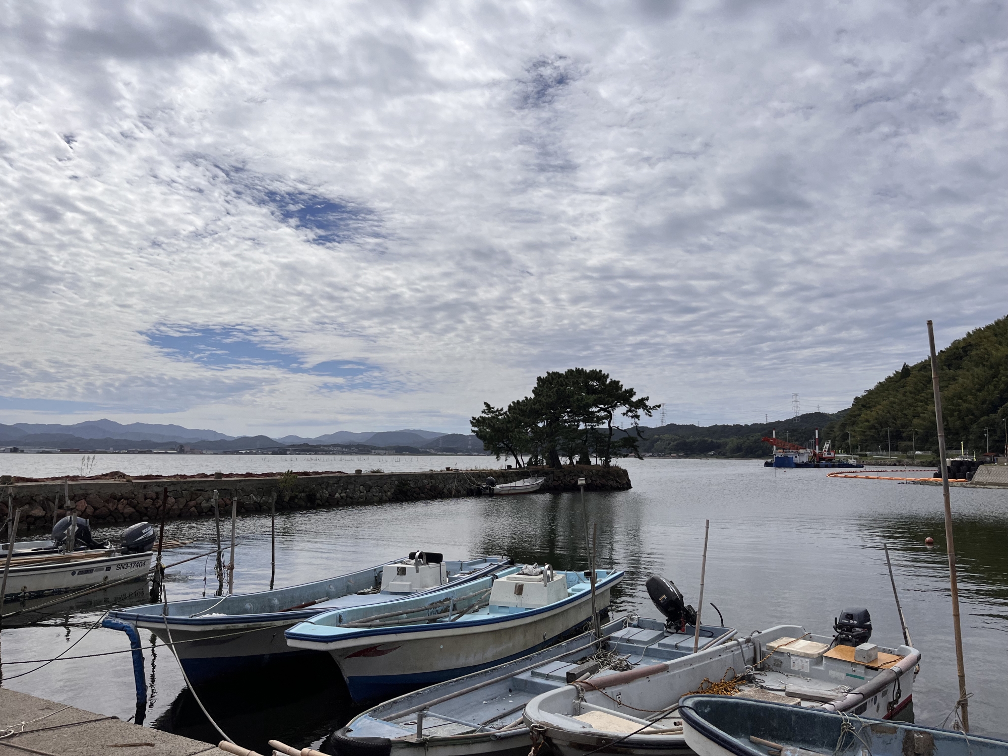 【大海崎集落の中央、山手に登れば十二所神社があり、車を脇に止めて中海側に曲がるとすぐ奥に漁港が見える。】