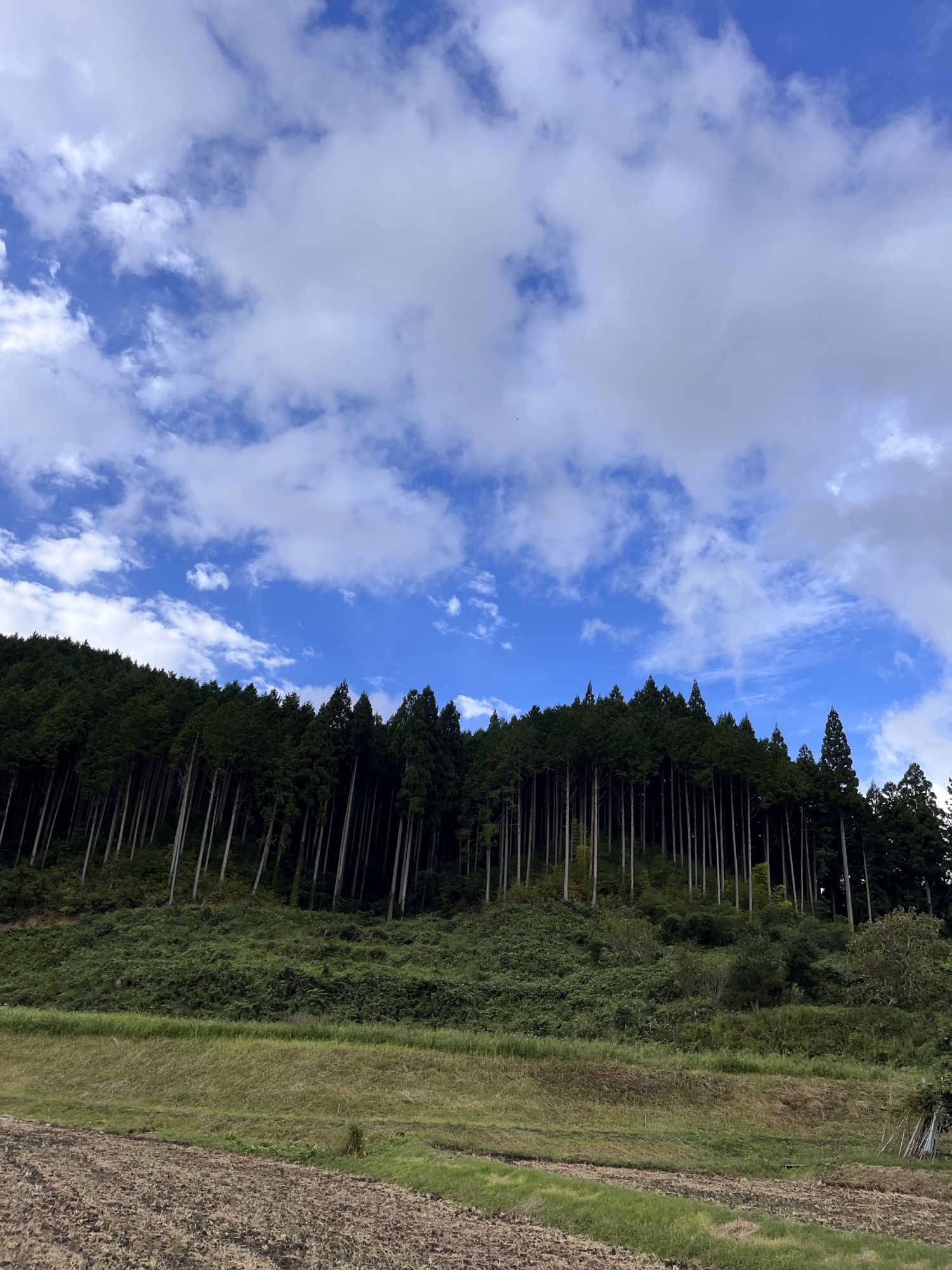 晴れ間と・・でも、まだ、稲刈りの終わっていない田と。