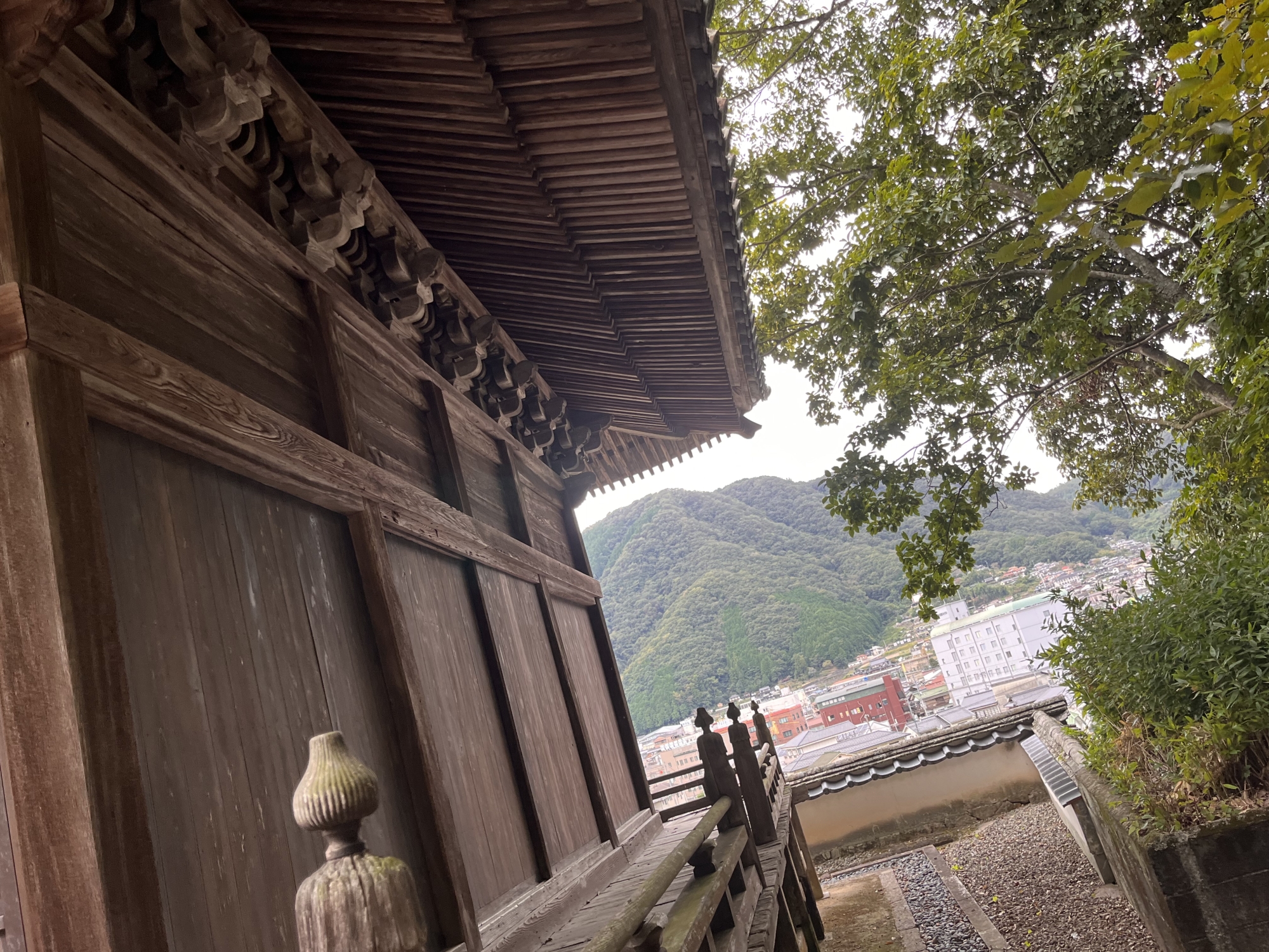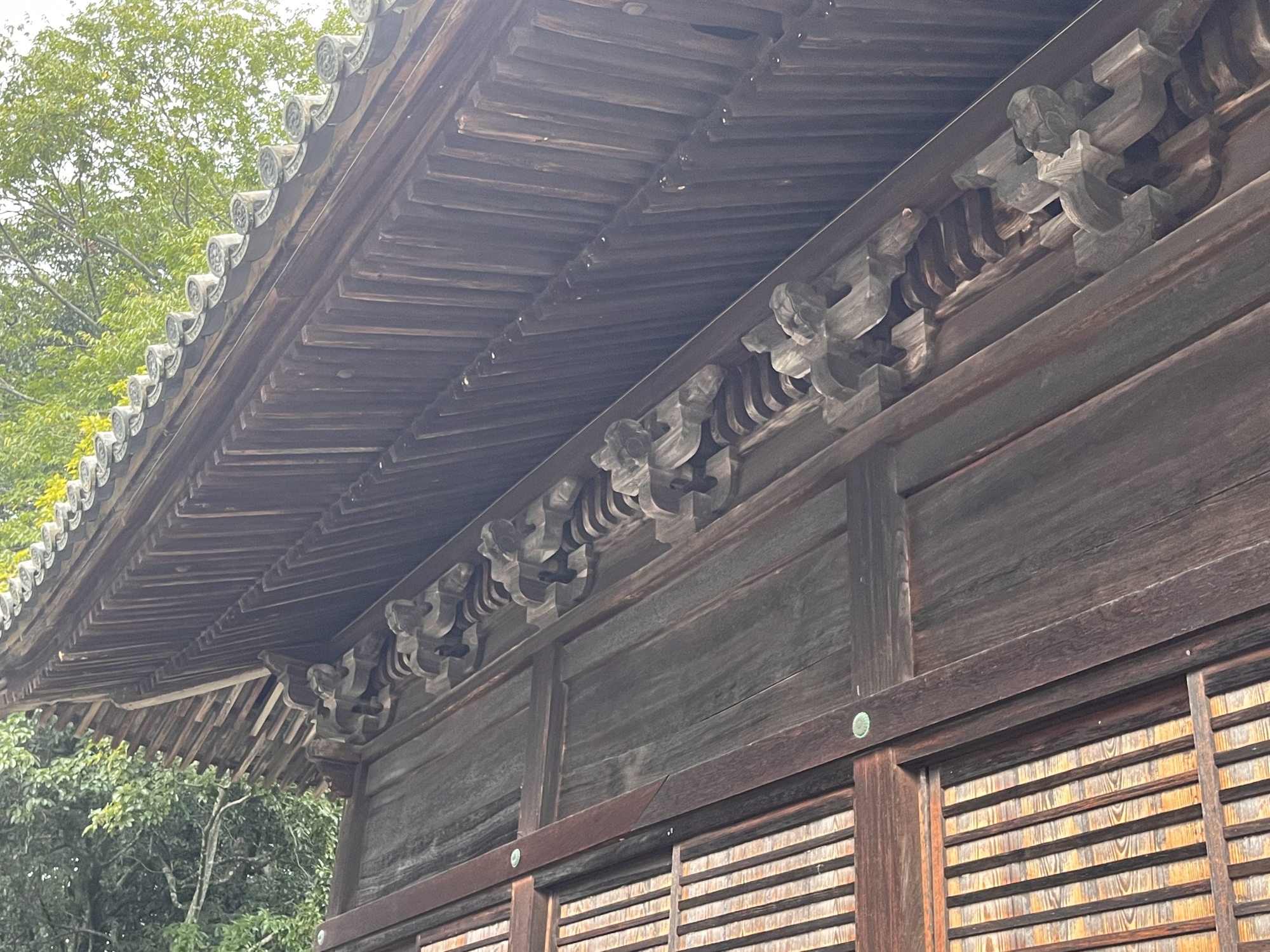 【本堂の薬師堂 は、元名10年(1615)の建築。勾配のきつい大屋根とこれを支える組物、浅唐戸の彫刻、ほか随所に桃山風の特徴がよく表れている。】