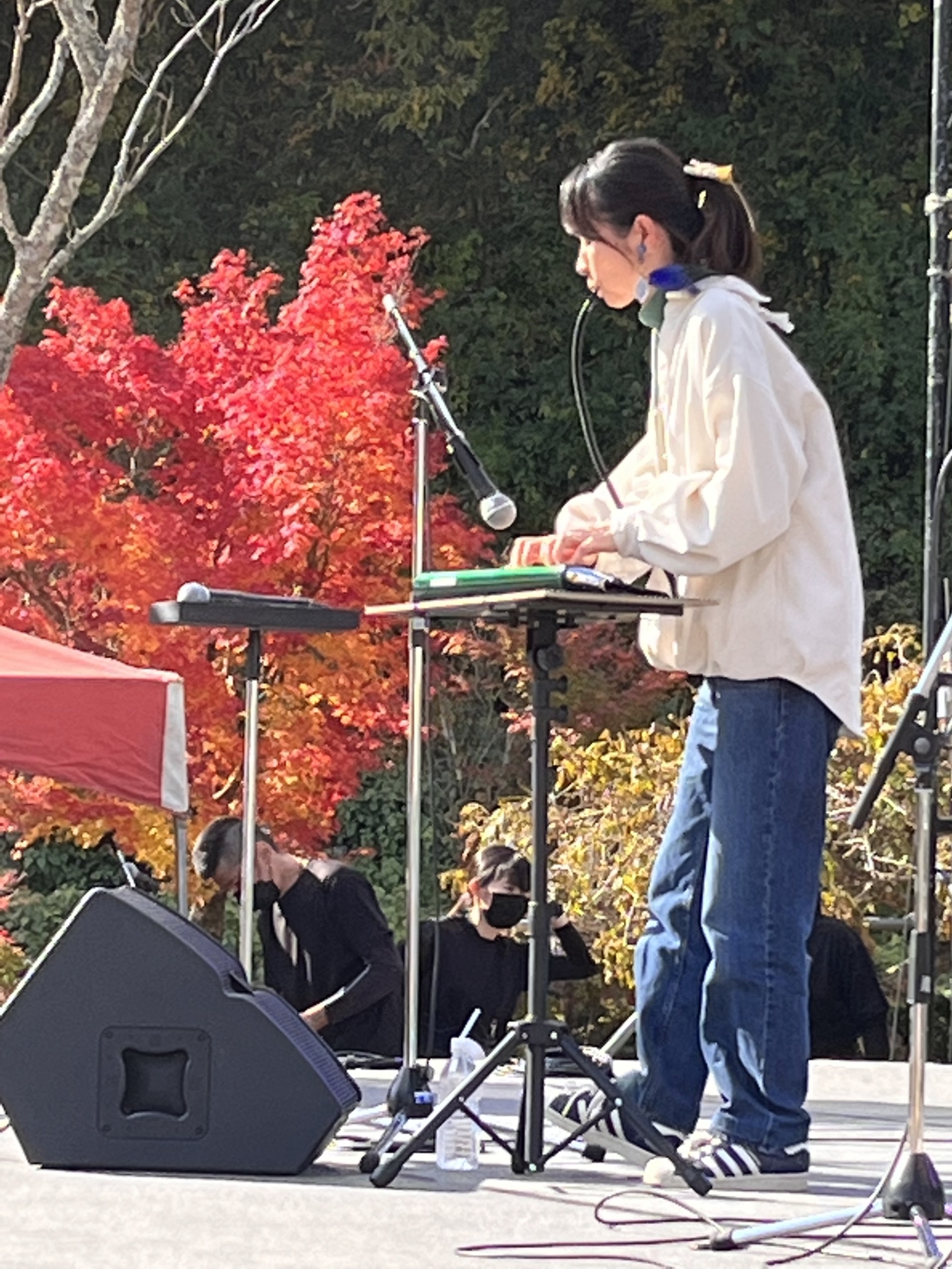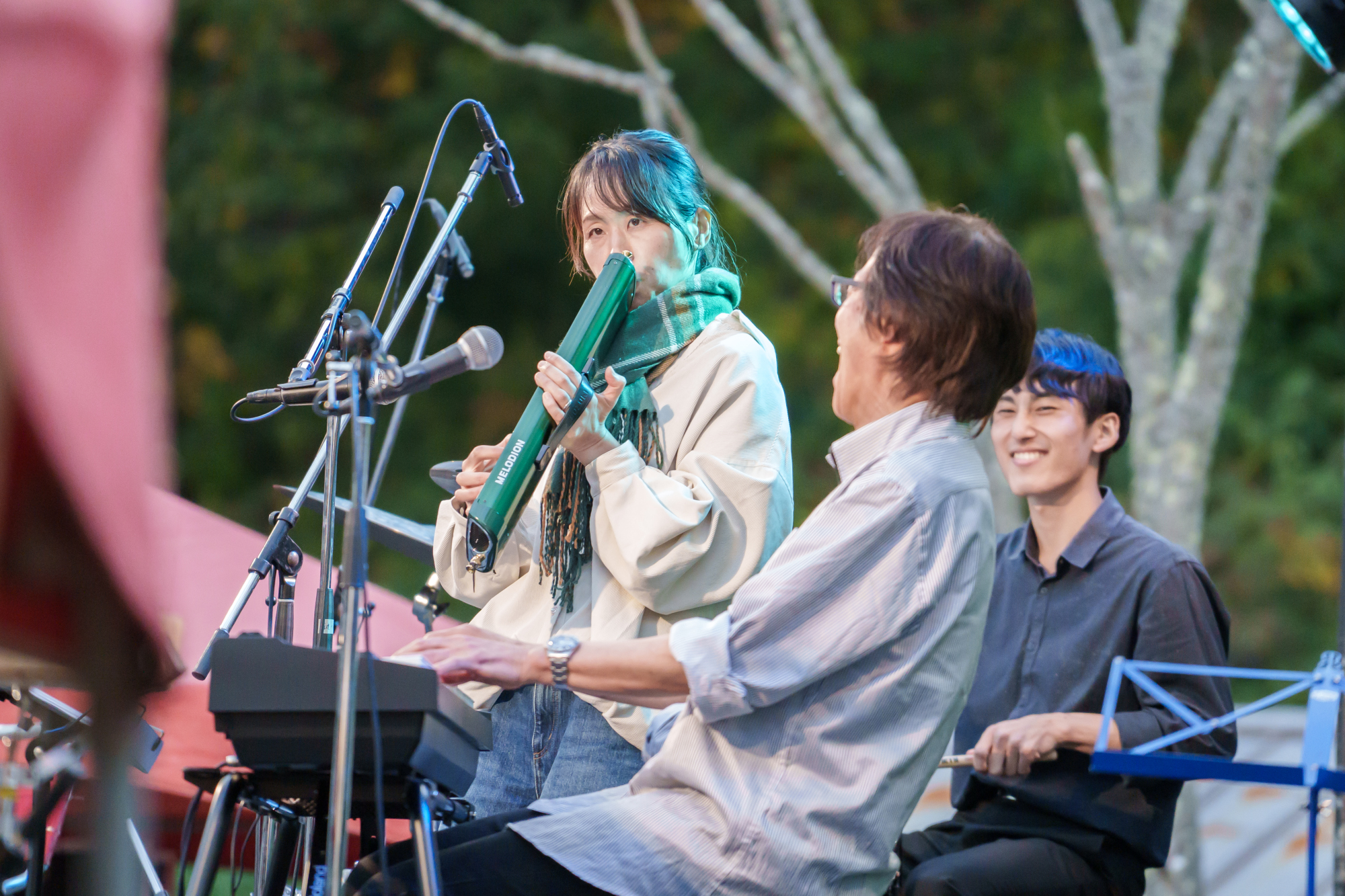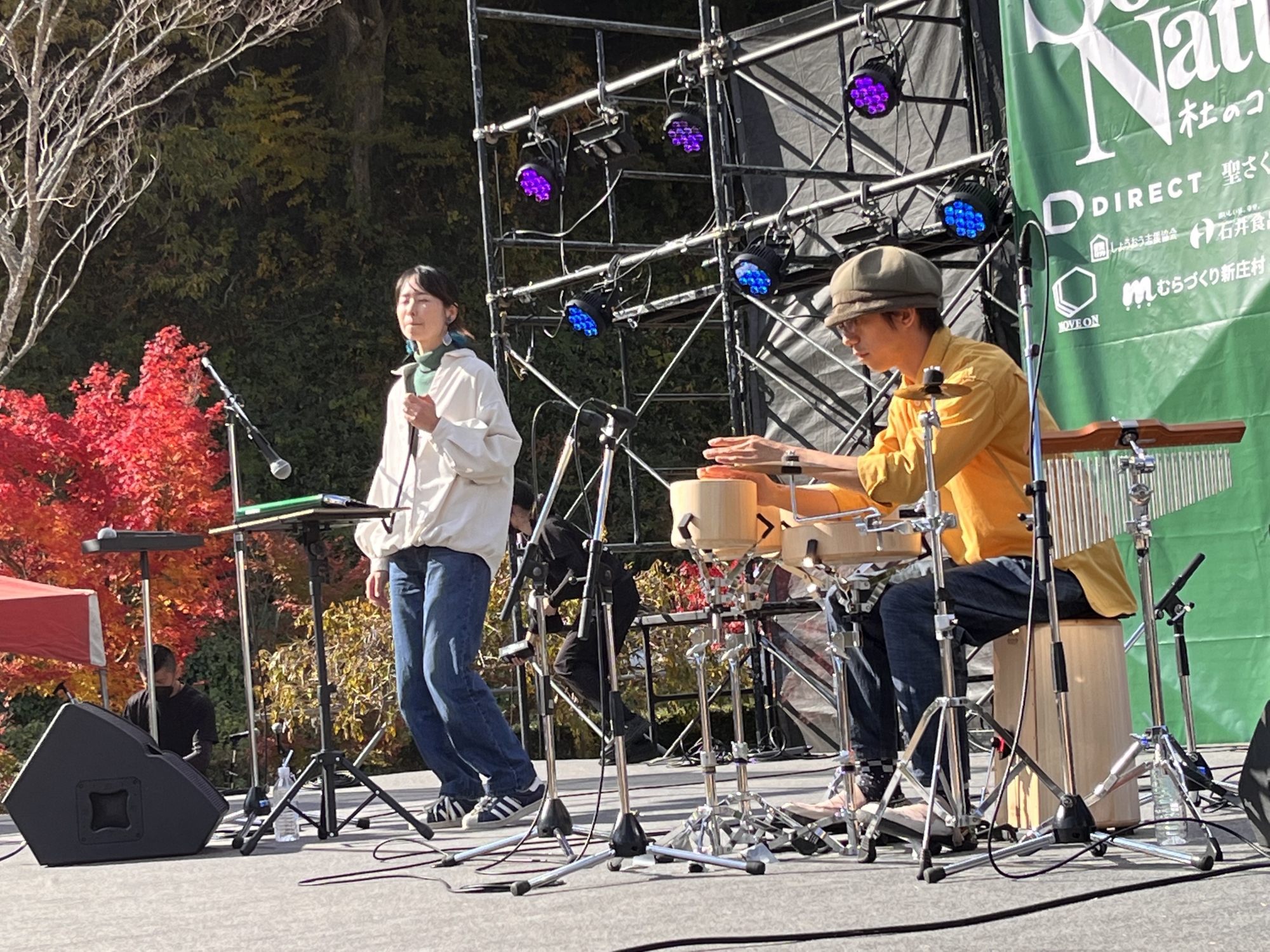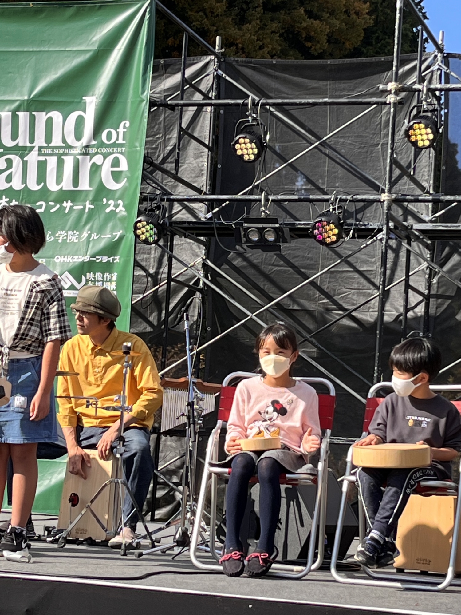 あやちんさん(鍵盤ハーモニカ)と中山拓人さん(カホン)・・では、子どもたちにステージに上がってもらって・・・・皆でカホン